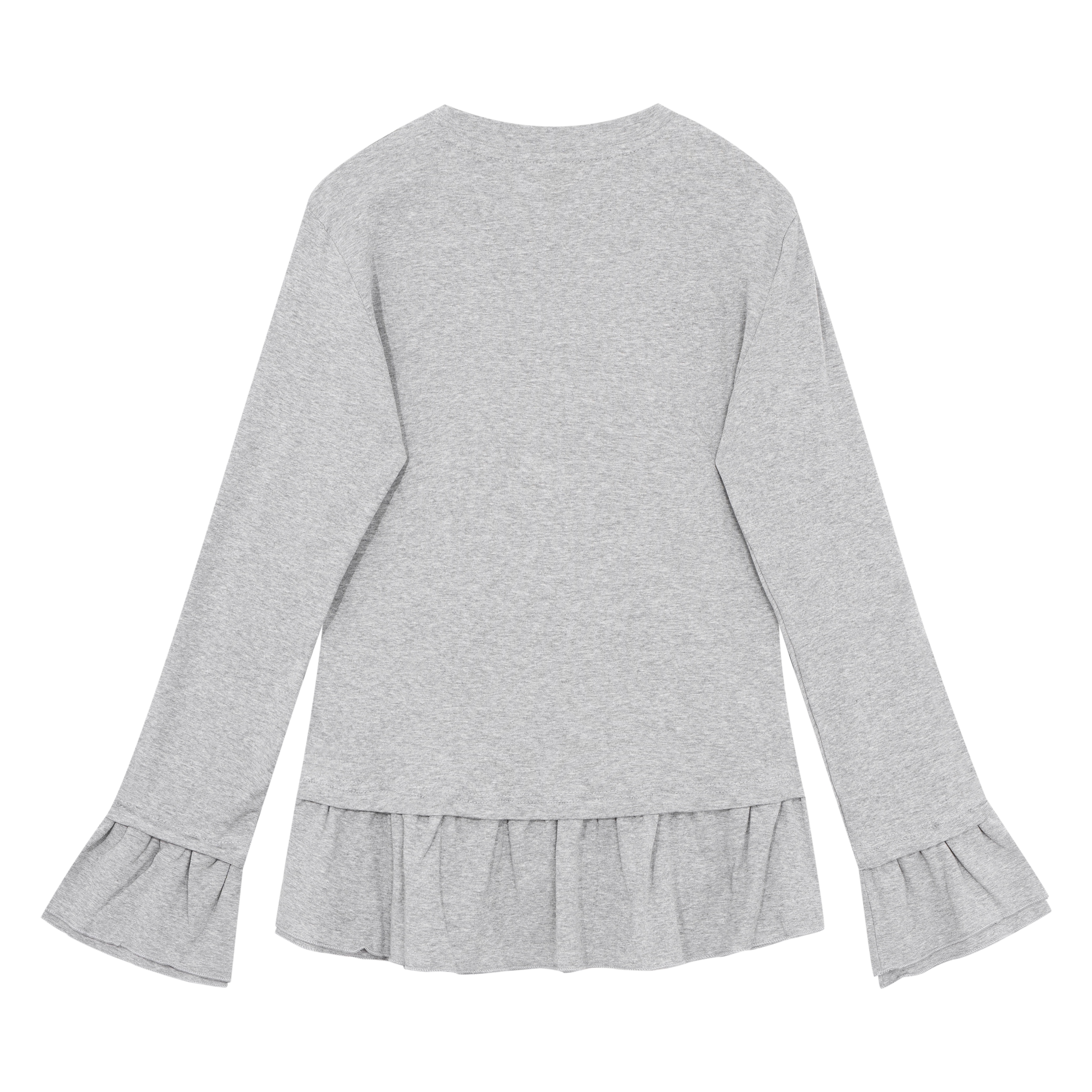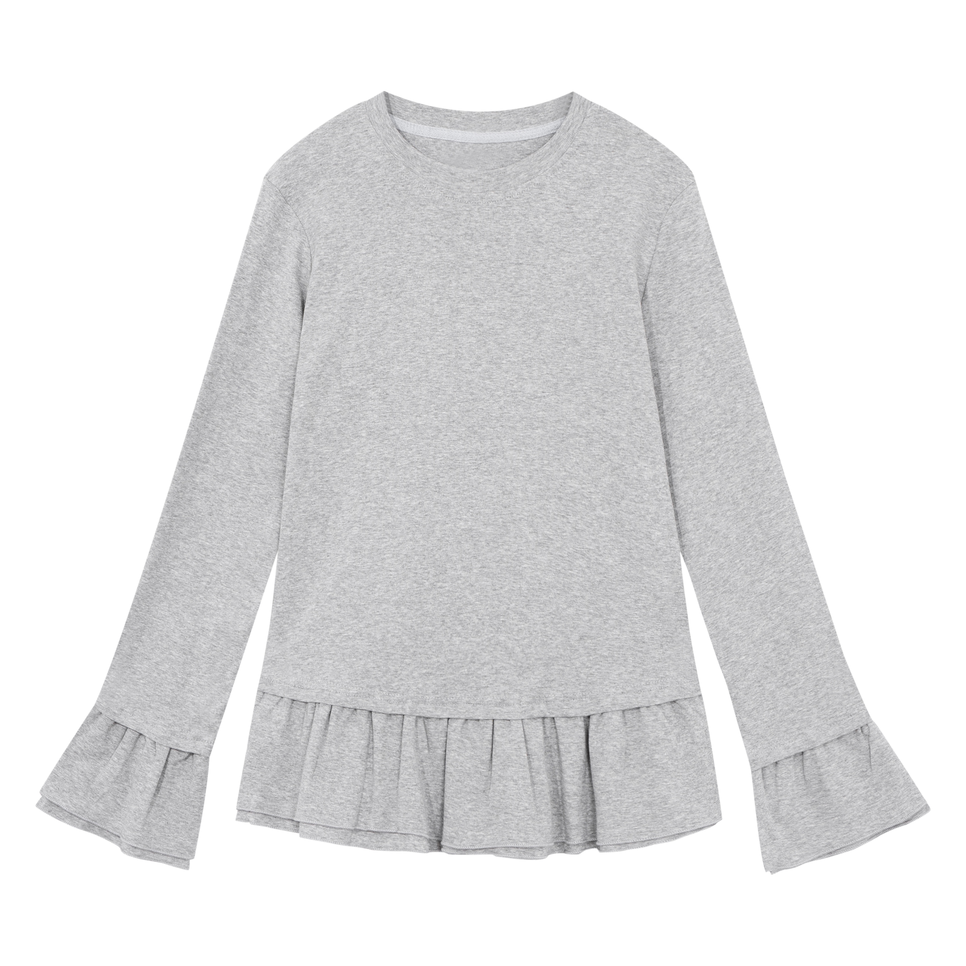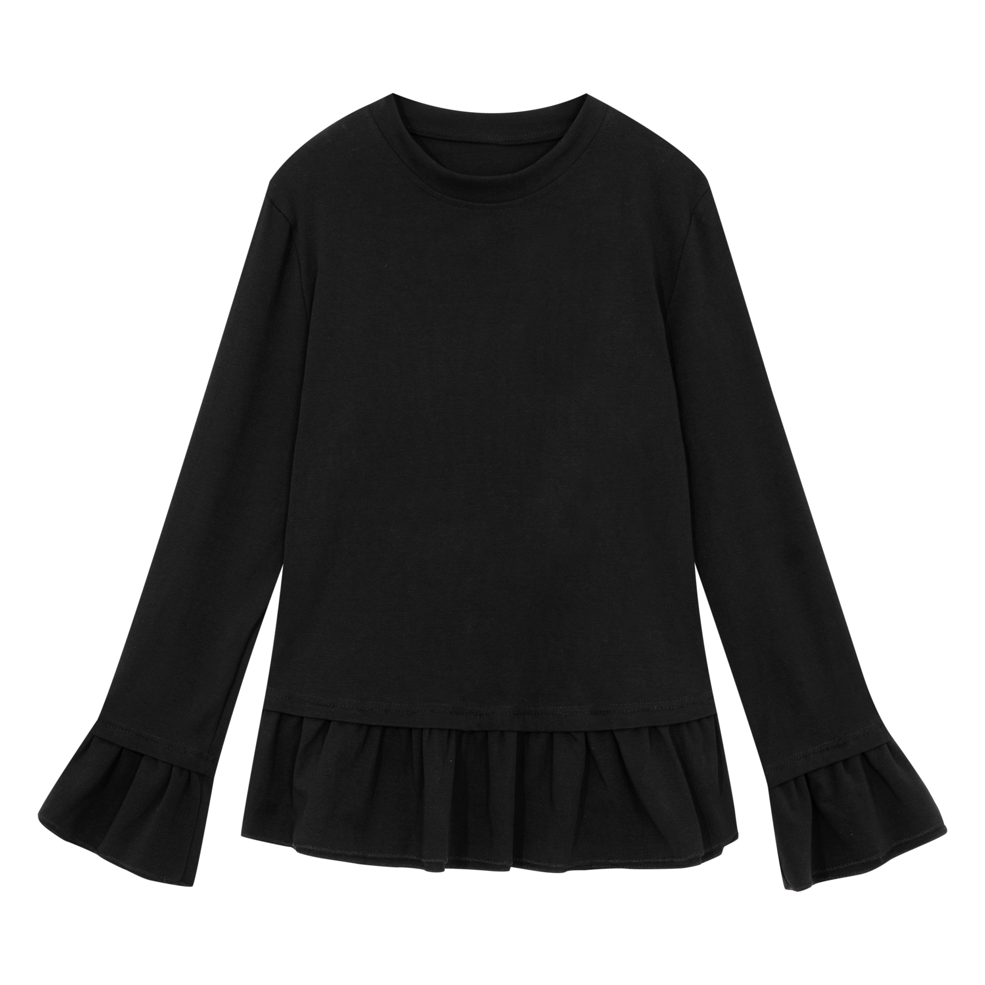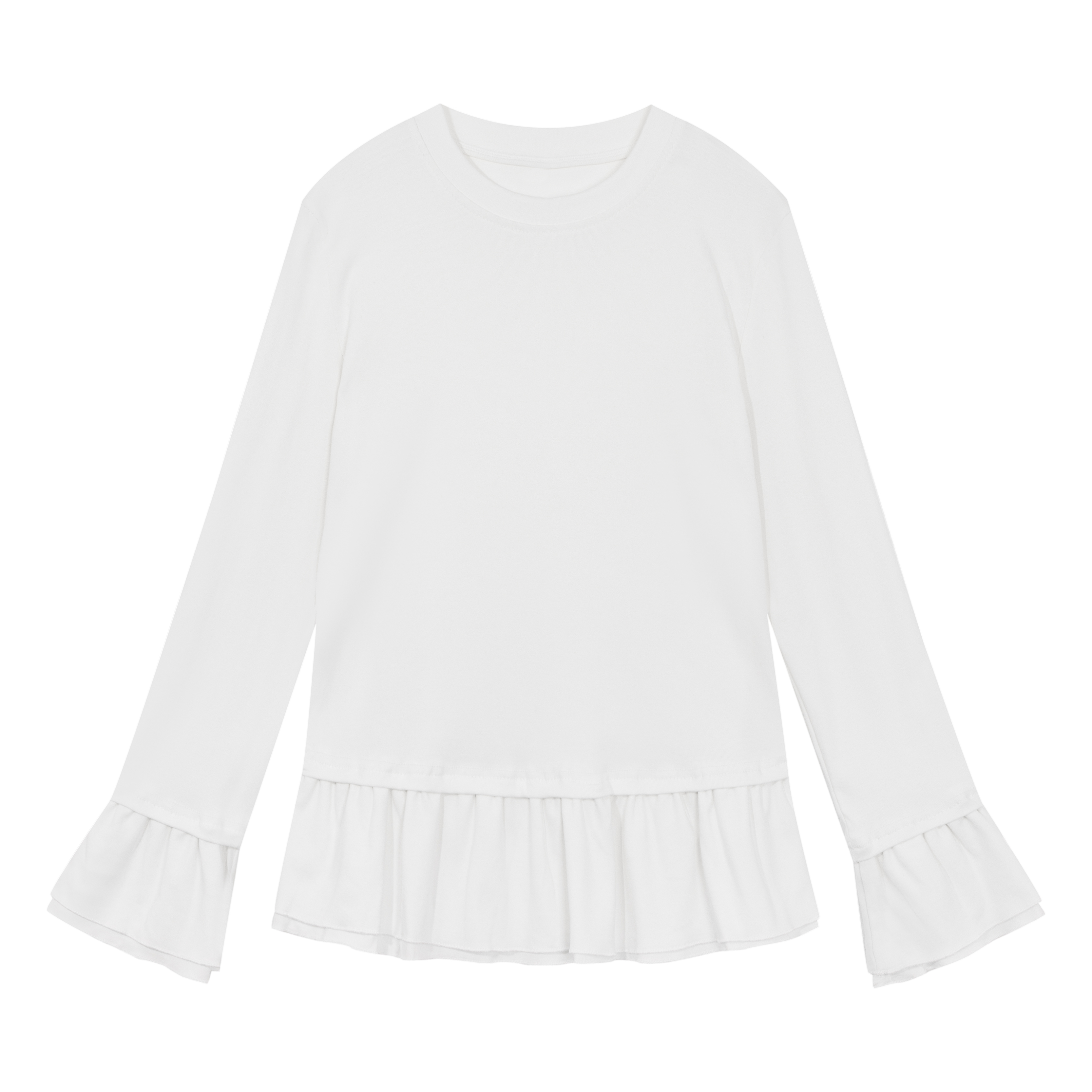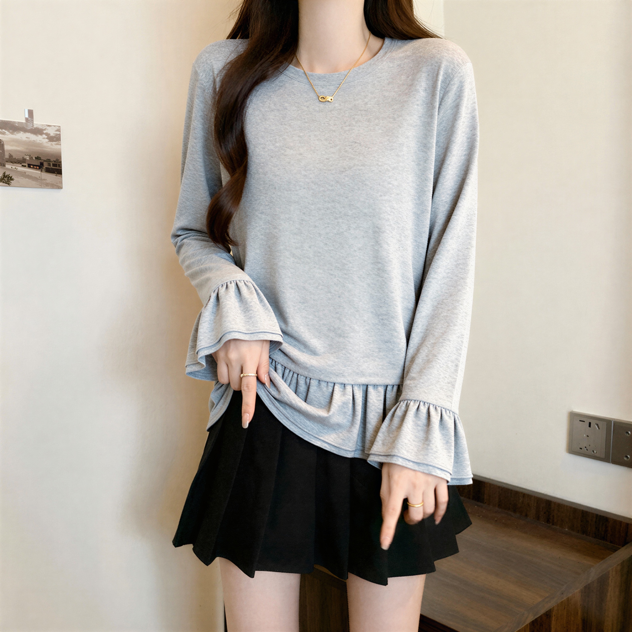 MY17455# 大码拼接木耳边长袖T恤新款胖mm遮肚子纯棉打底衫上衣女裝貨源服裝批發