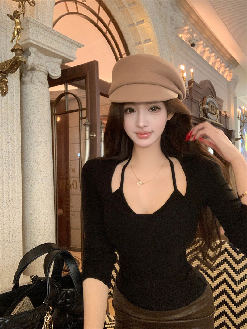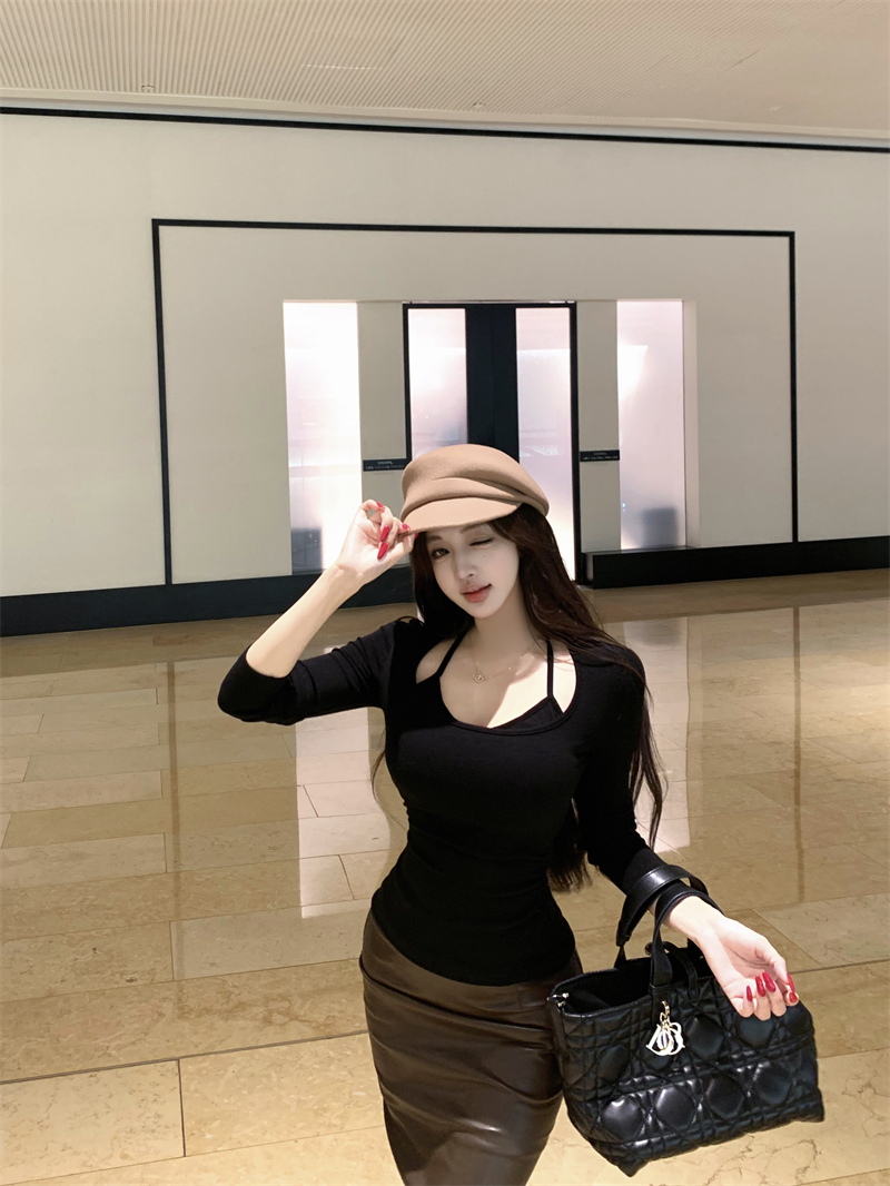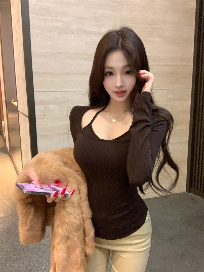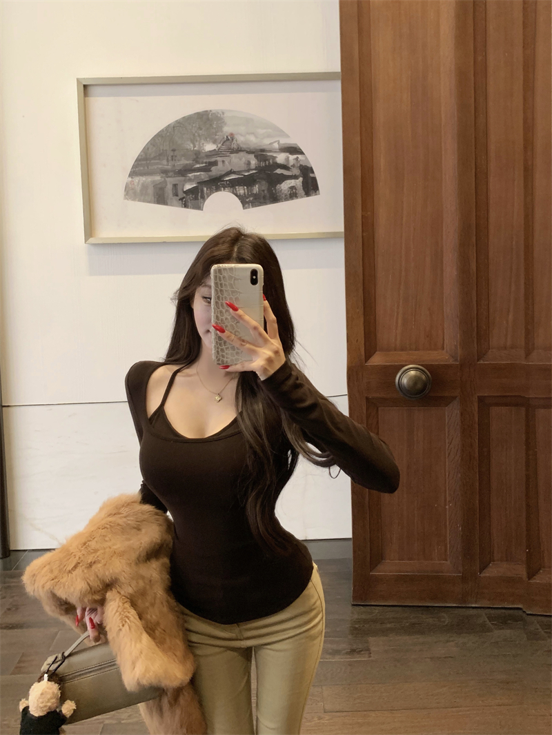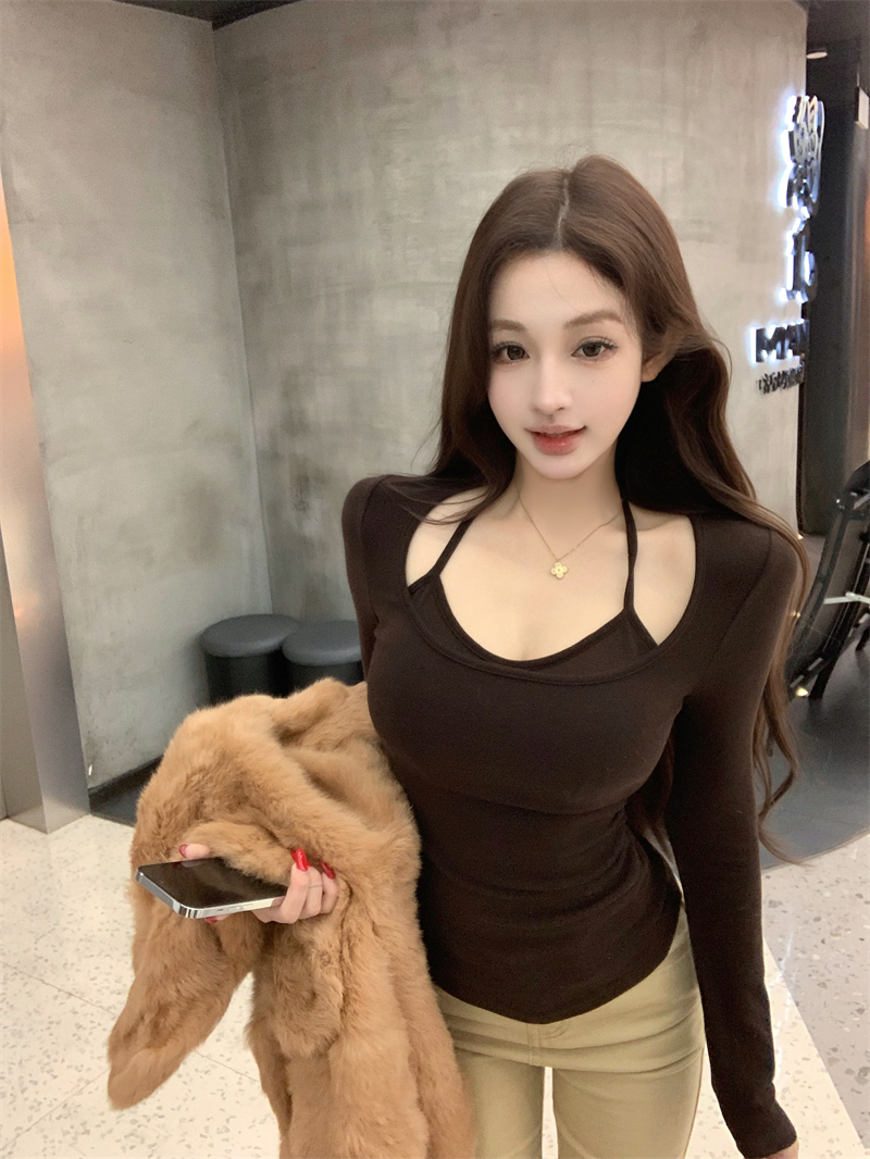 MY17461# 掐腰显瘦修身方领挂脖打底衫女裝貨源服裝批發