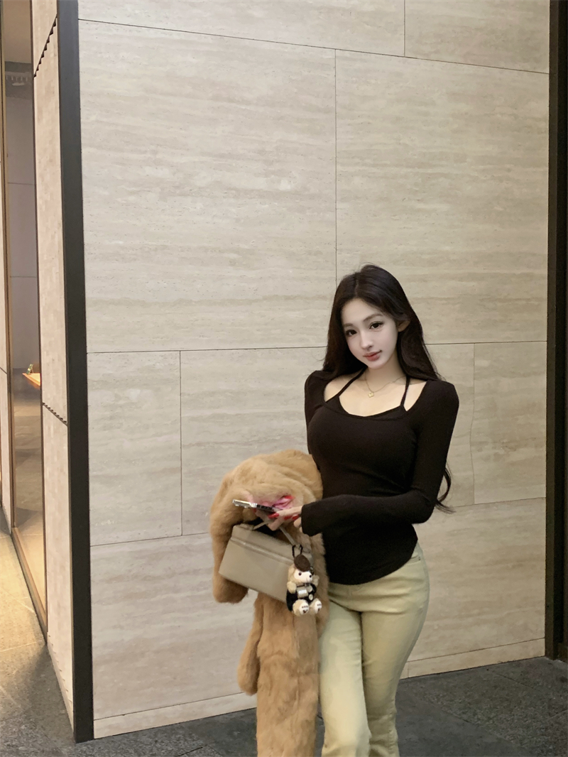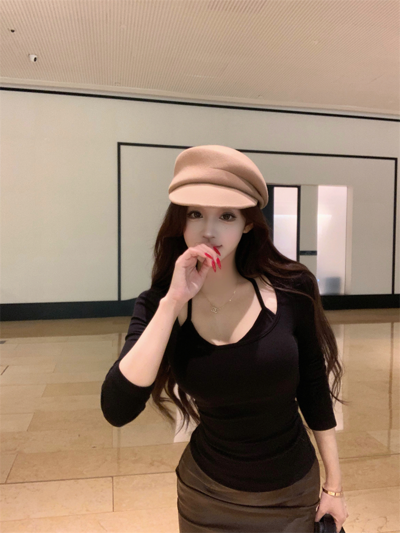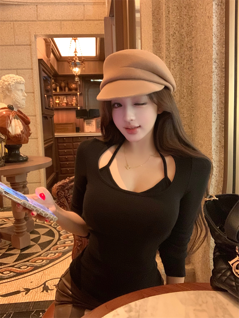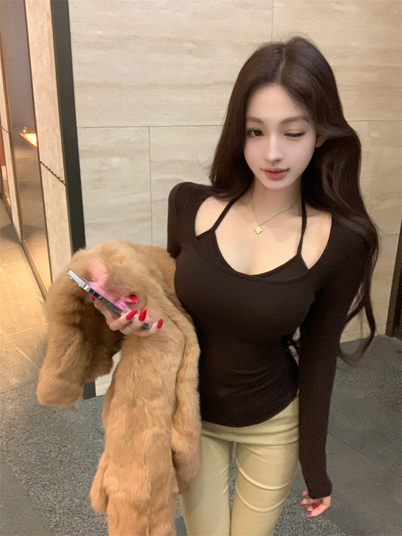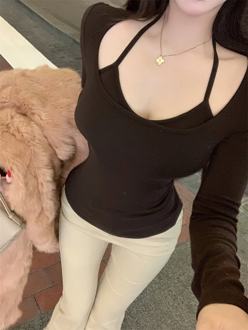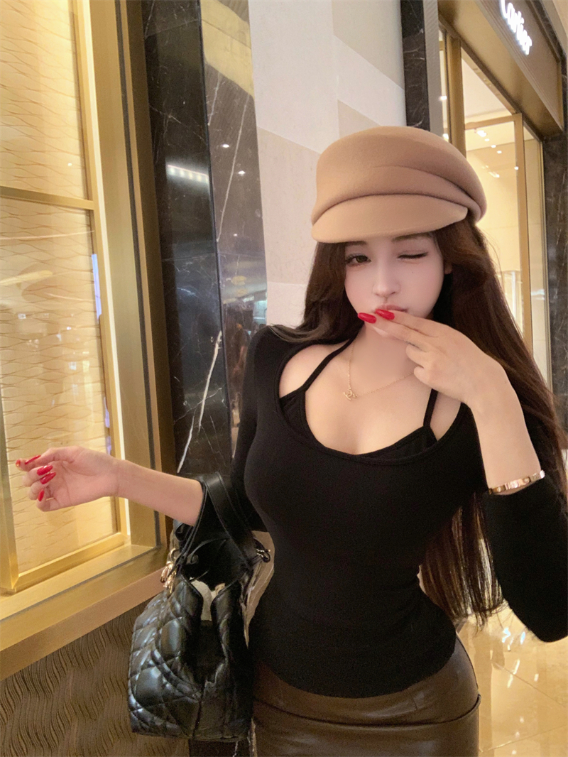 MY17461# 掐腰显瘦修身方领挂脖打底衫女裝貨源服裝批發
