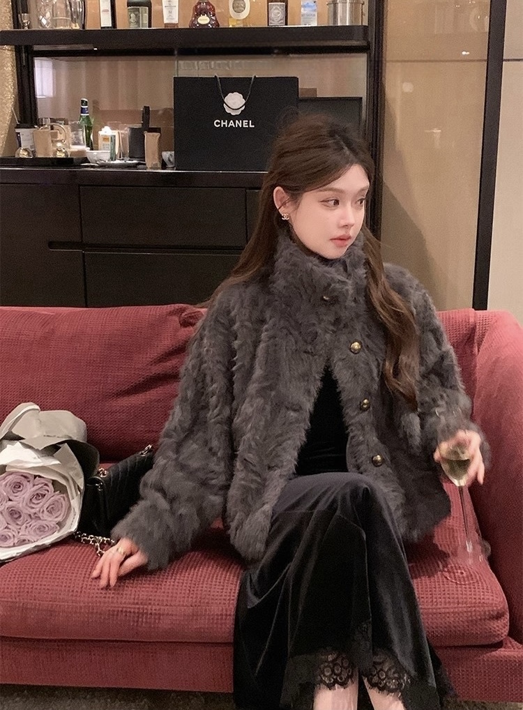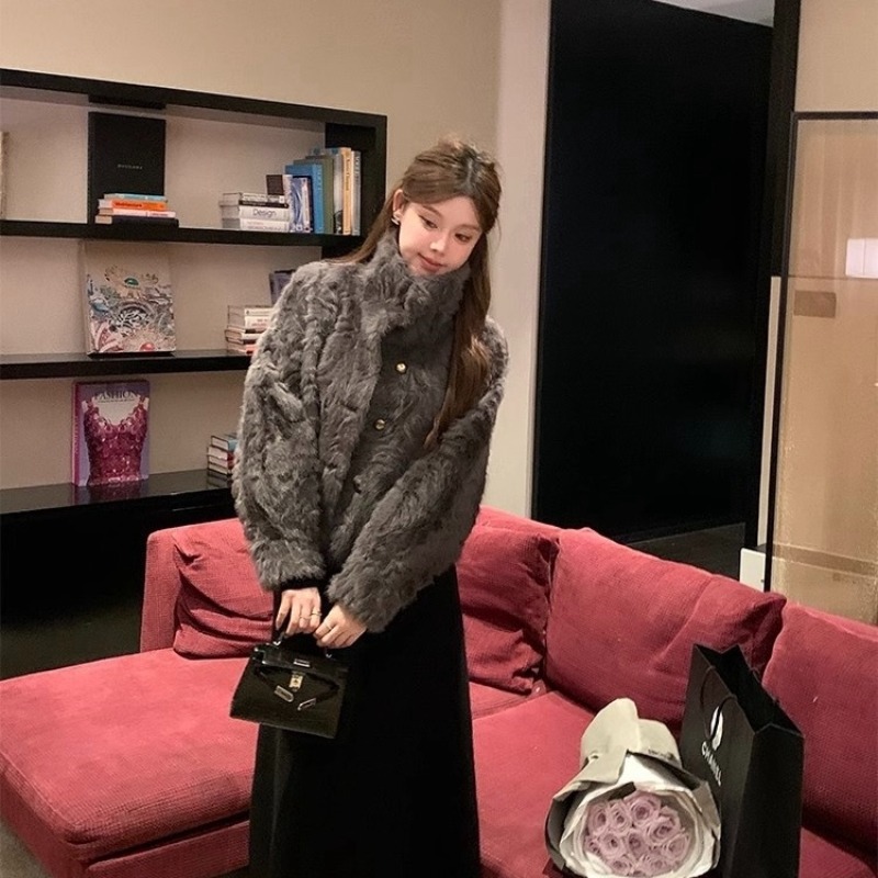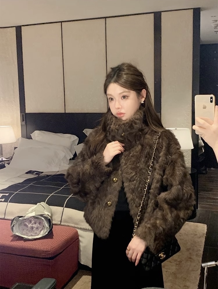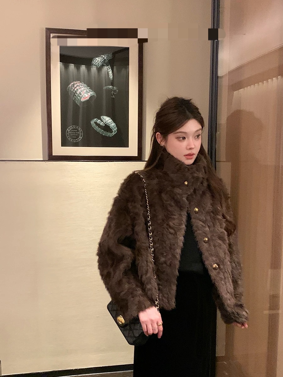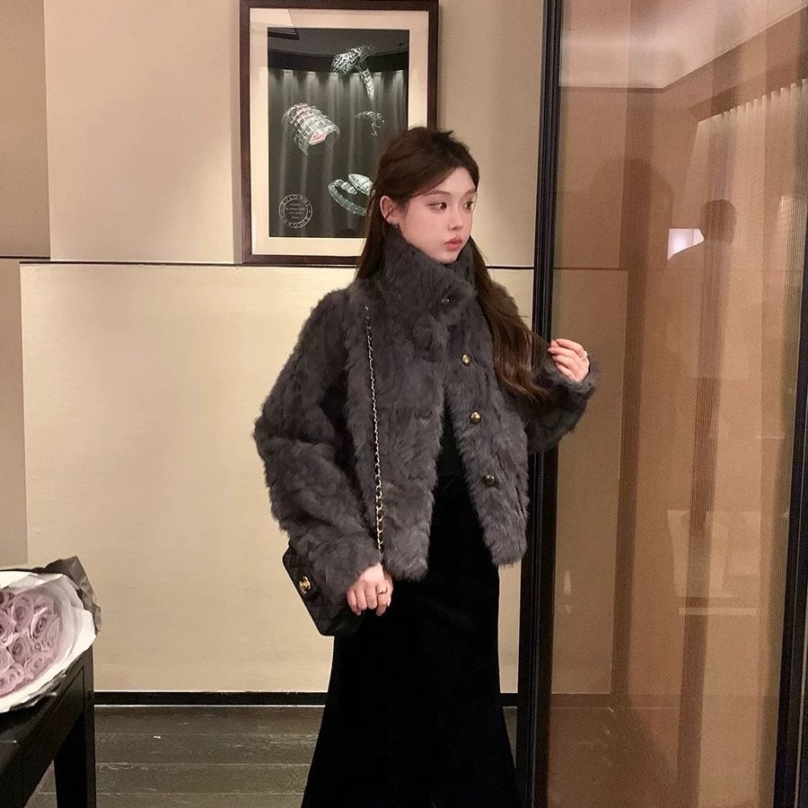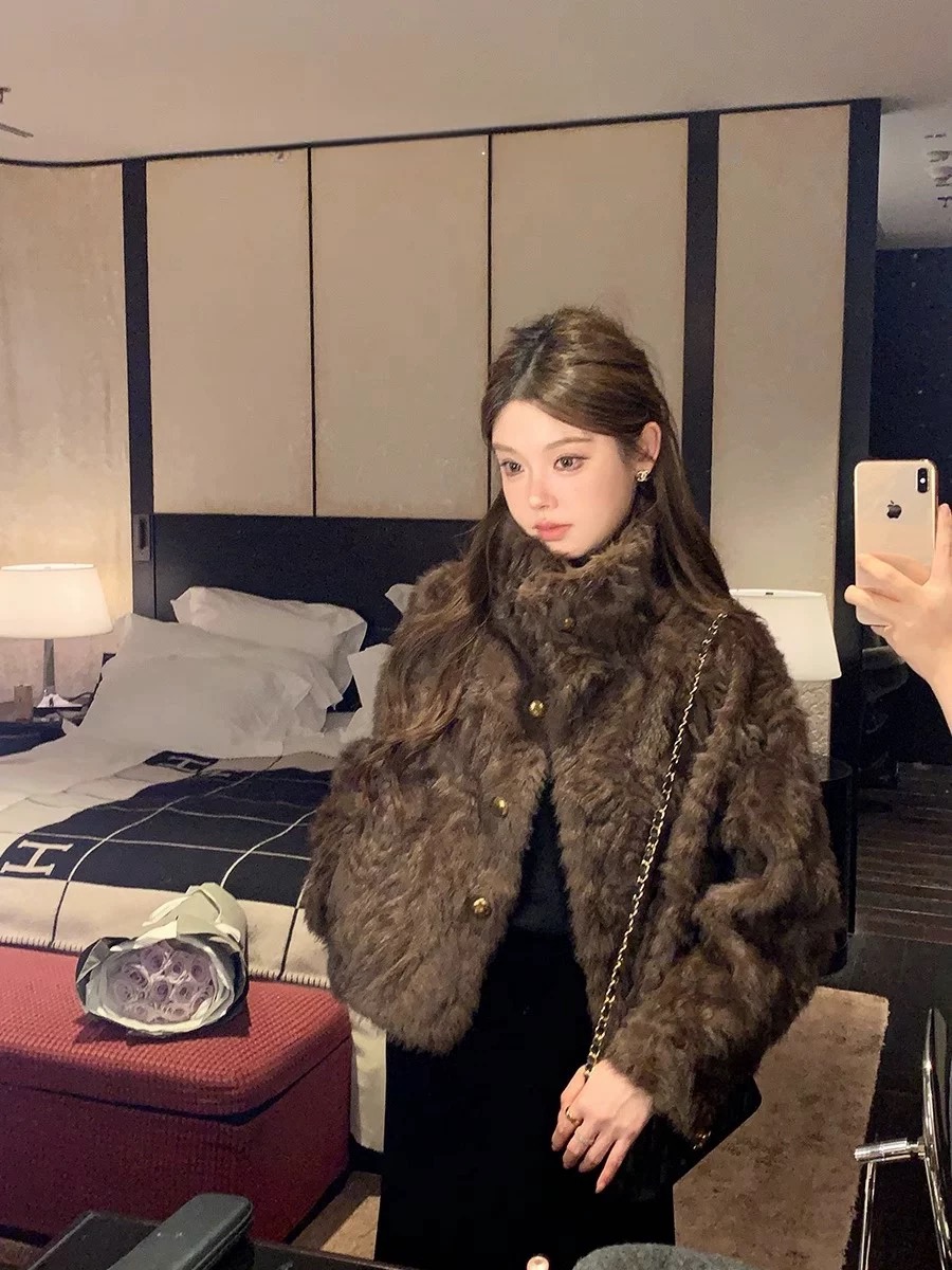 MY17490# 新款立领环保小湖羊女短款小个子仿皮草外套毛毛上衣女女裝貨源服裝批發