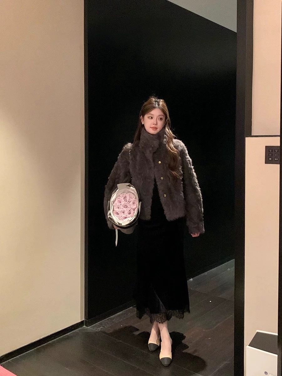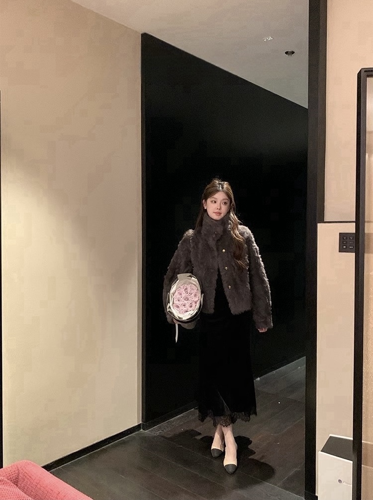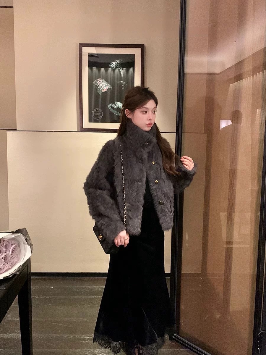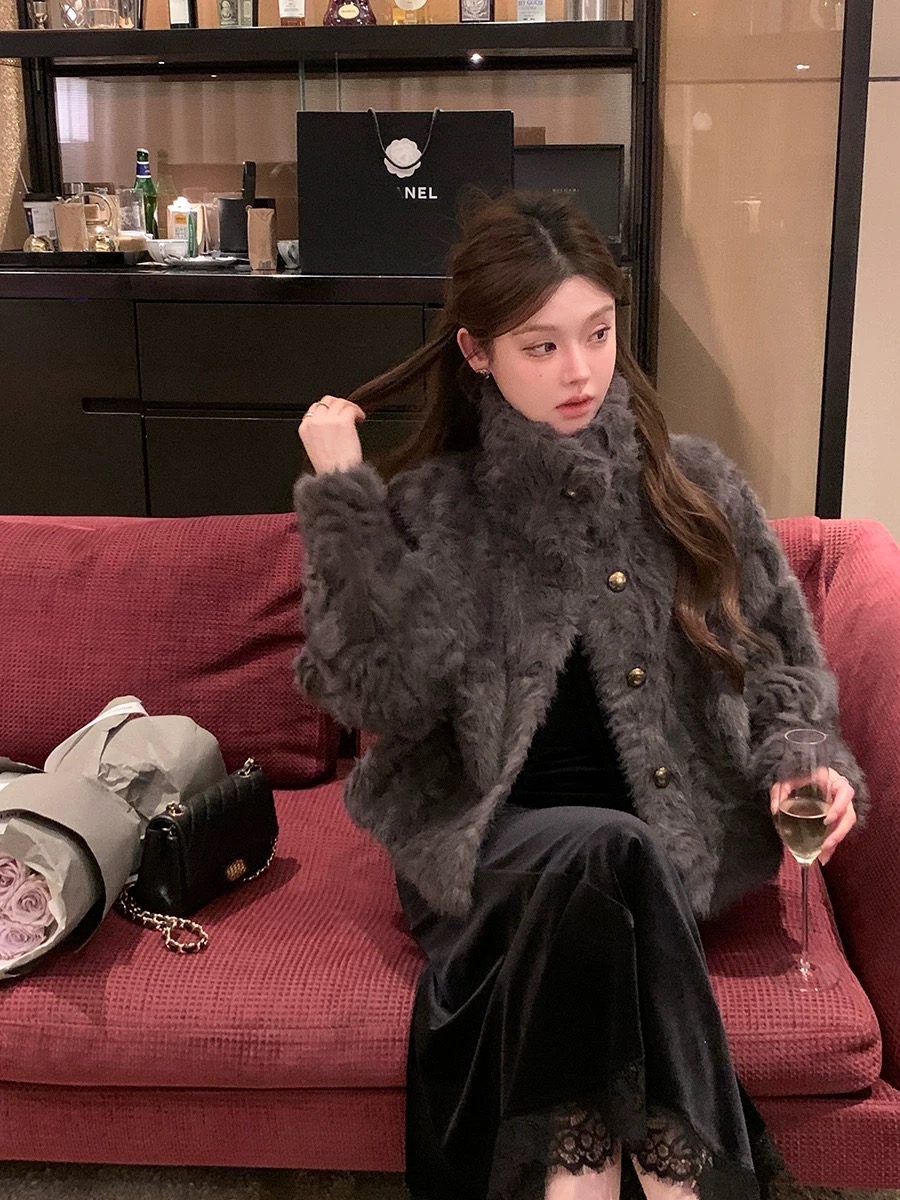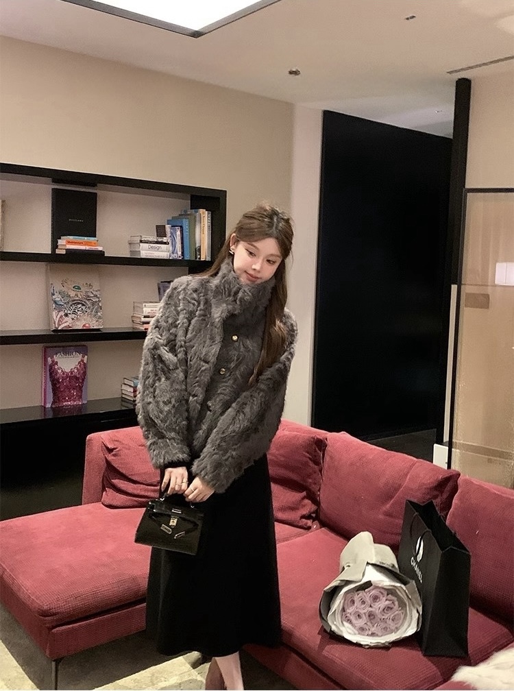 MY17490# 新款立领环保小湖羊女短款小个子仿皮草外套毛毛上衣女女裝貨源服裝批發