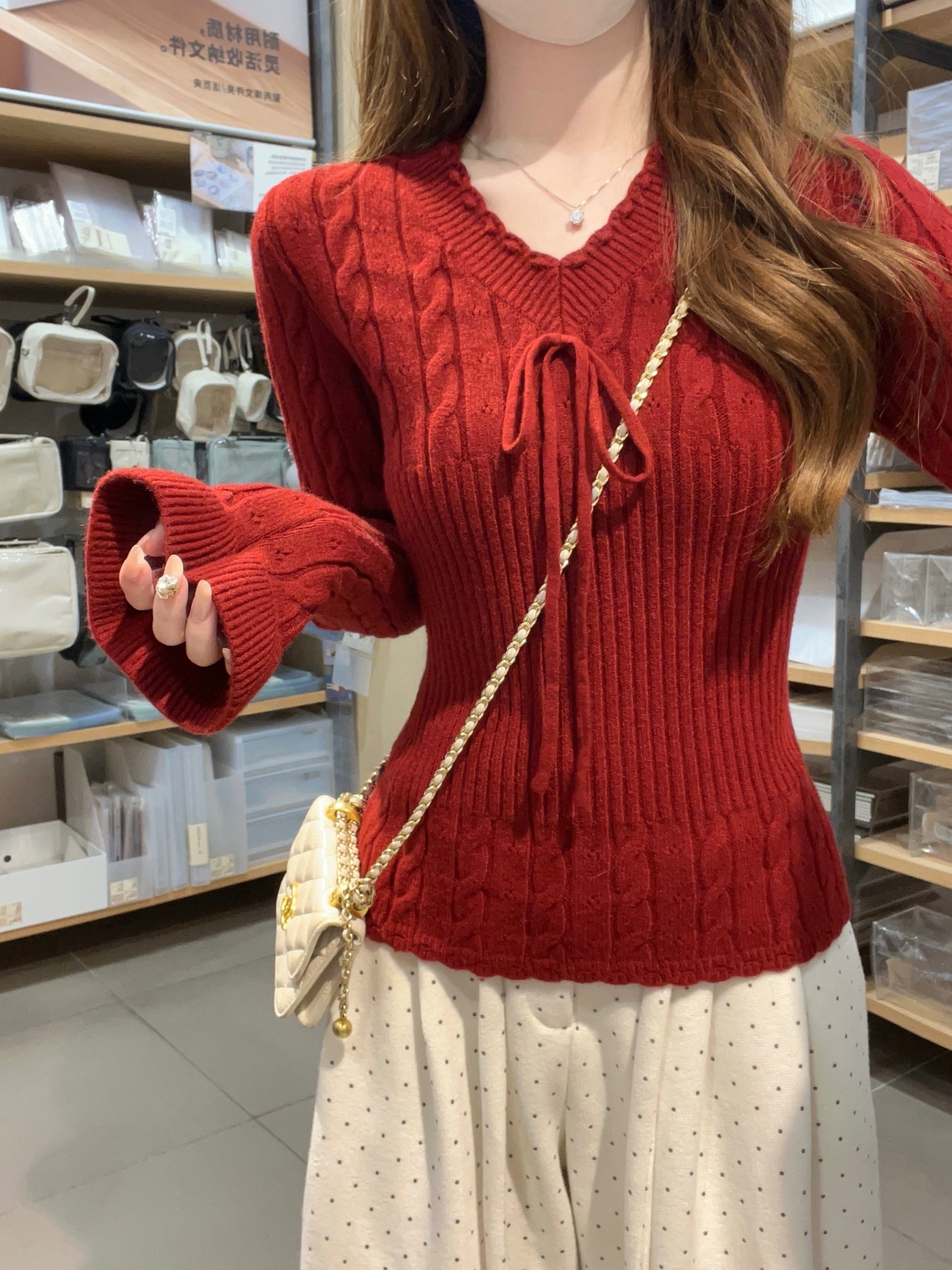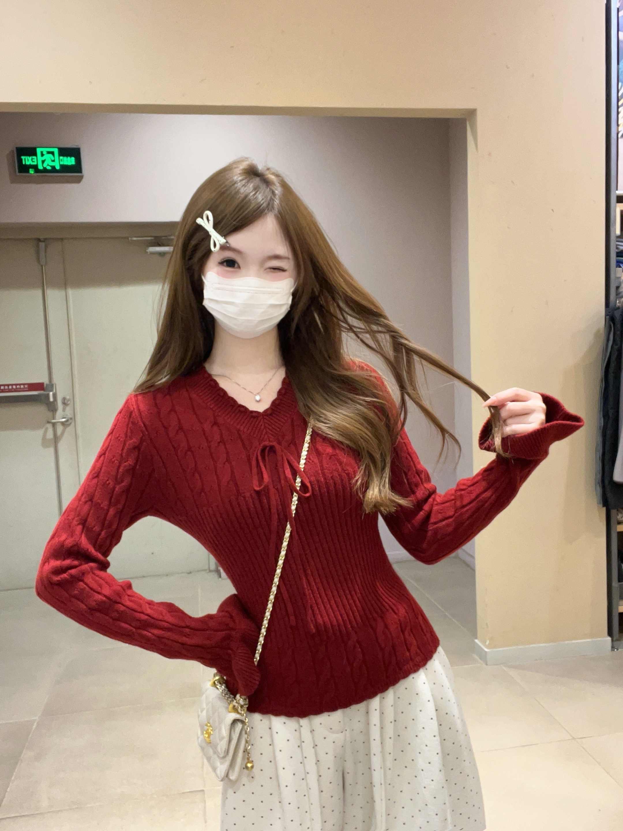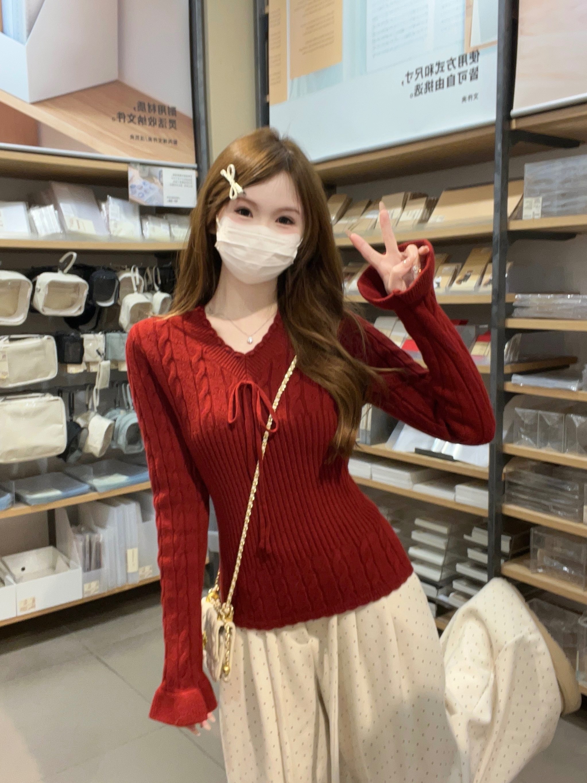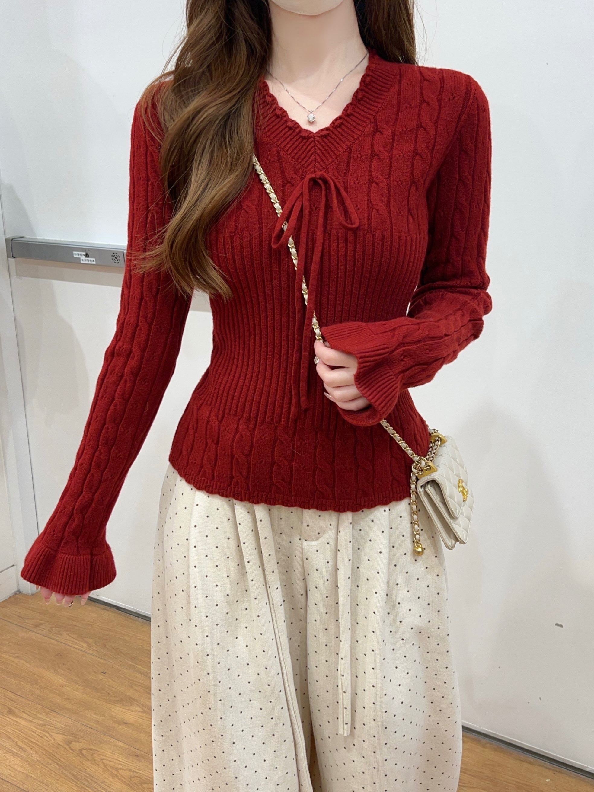 MY17492# 法式红色V领绑带喇叭袖针织衫新款收腰显瘦百搭毛衣上衣潮女裝貨源服裝批發