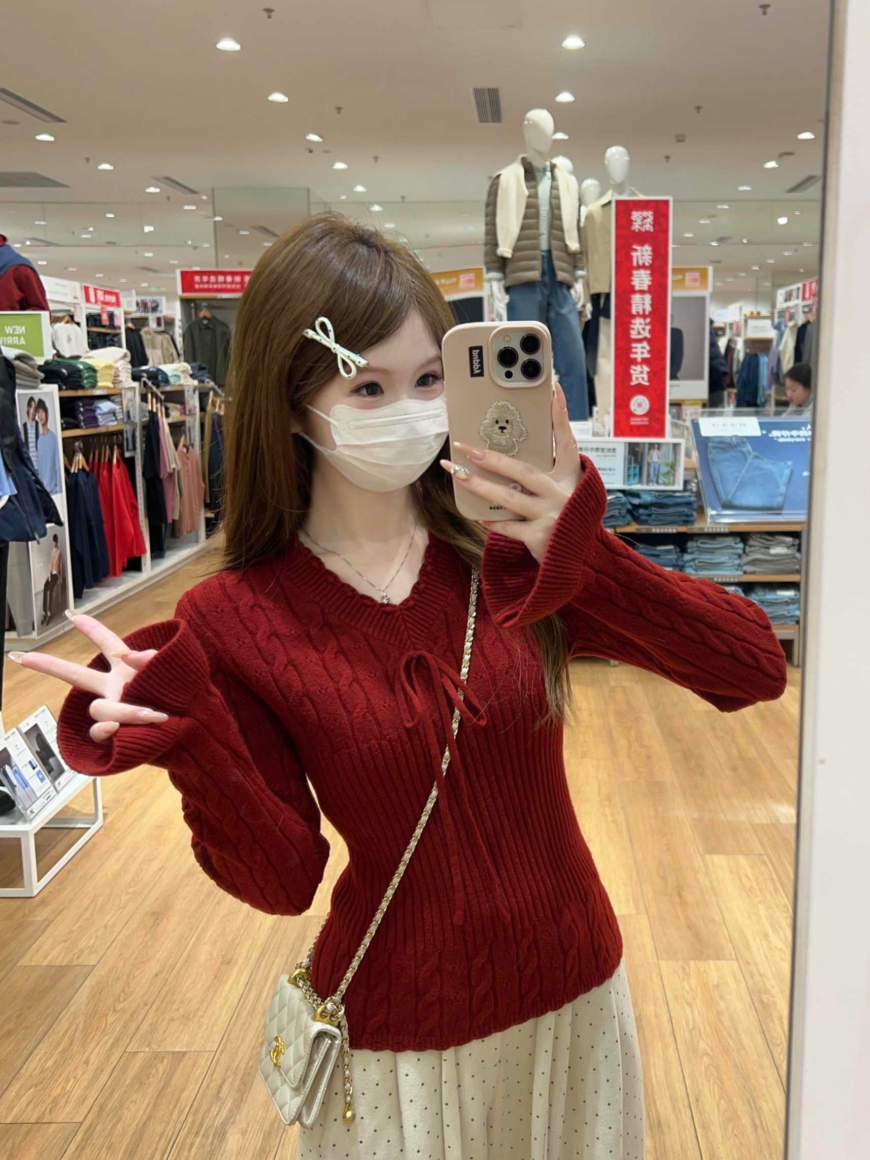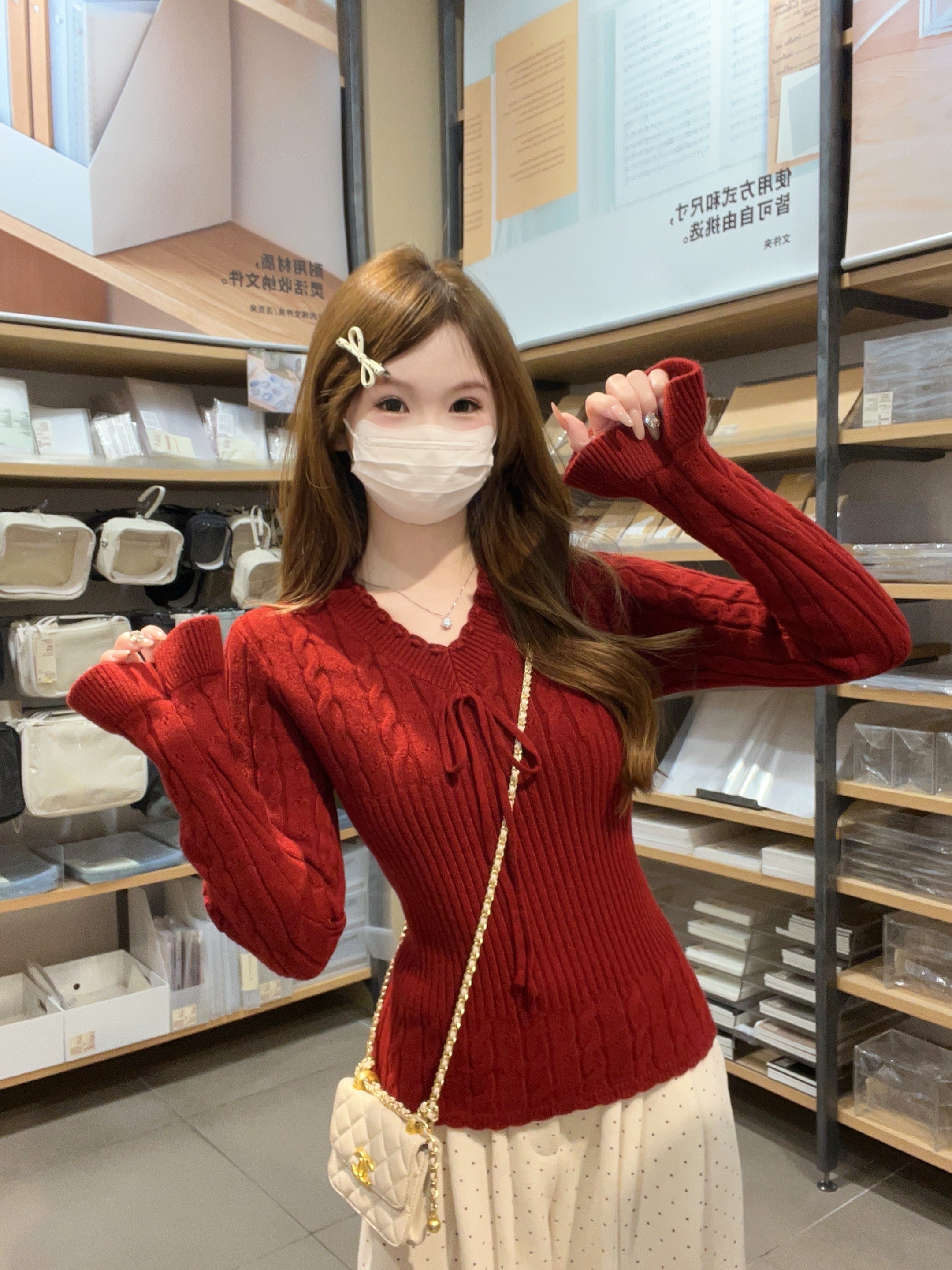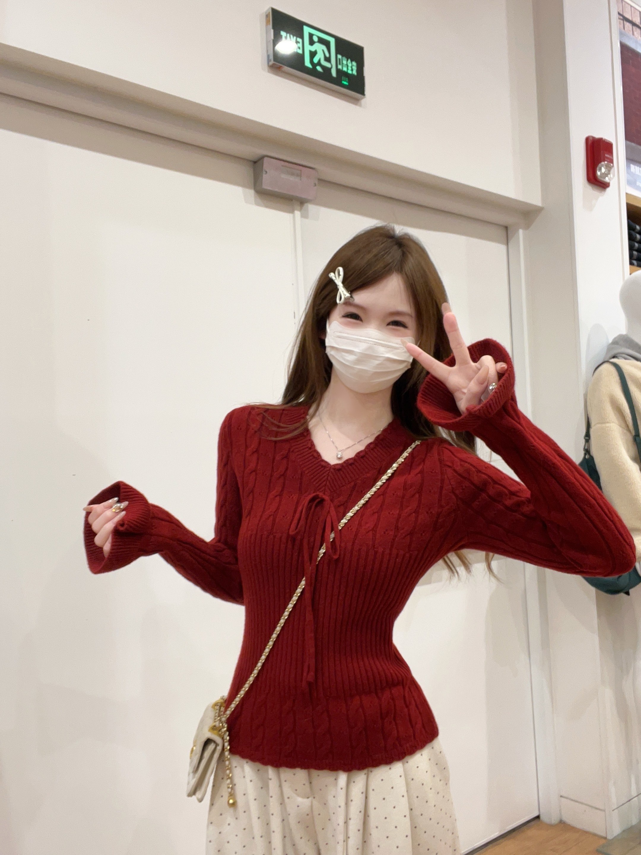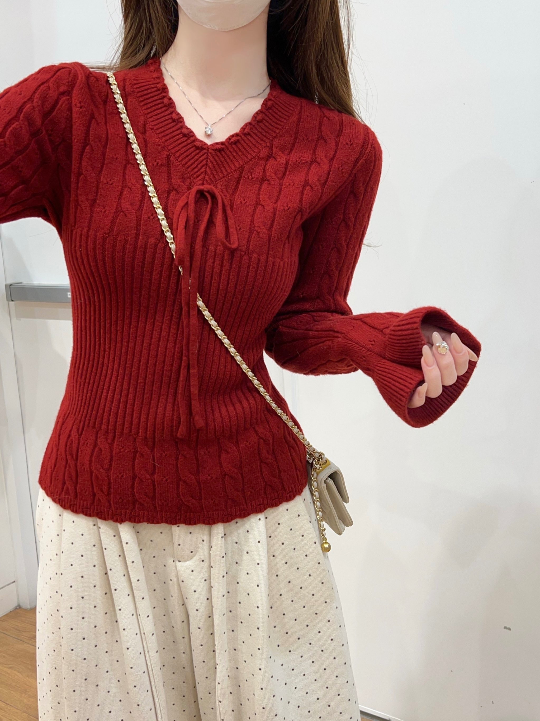 MY17492# 法式红色V领绑带喇叭袖针织衫新款收腰显瘦百搭毛衣上衣潮女裝貨源服裝批發