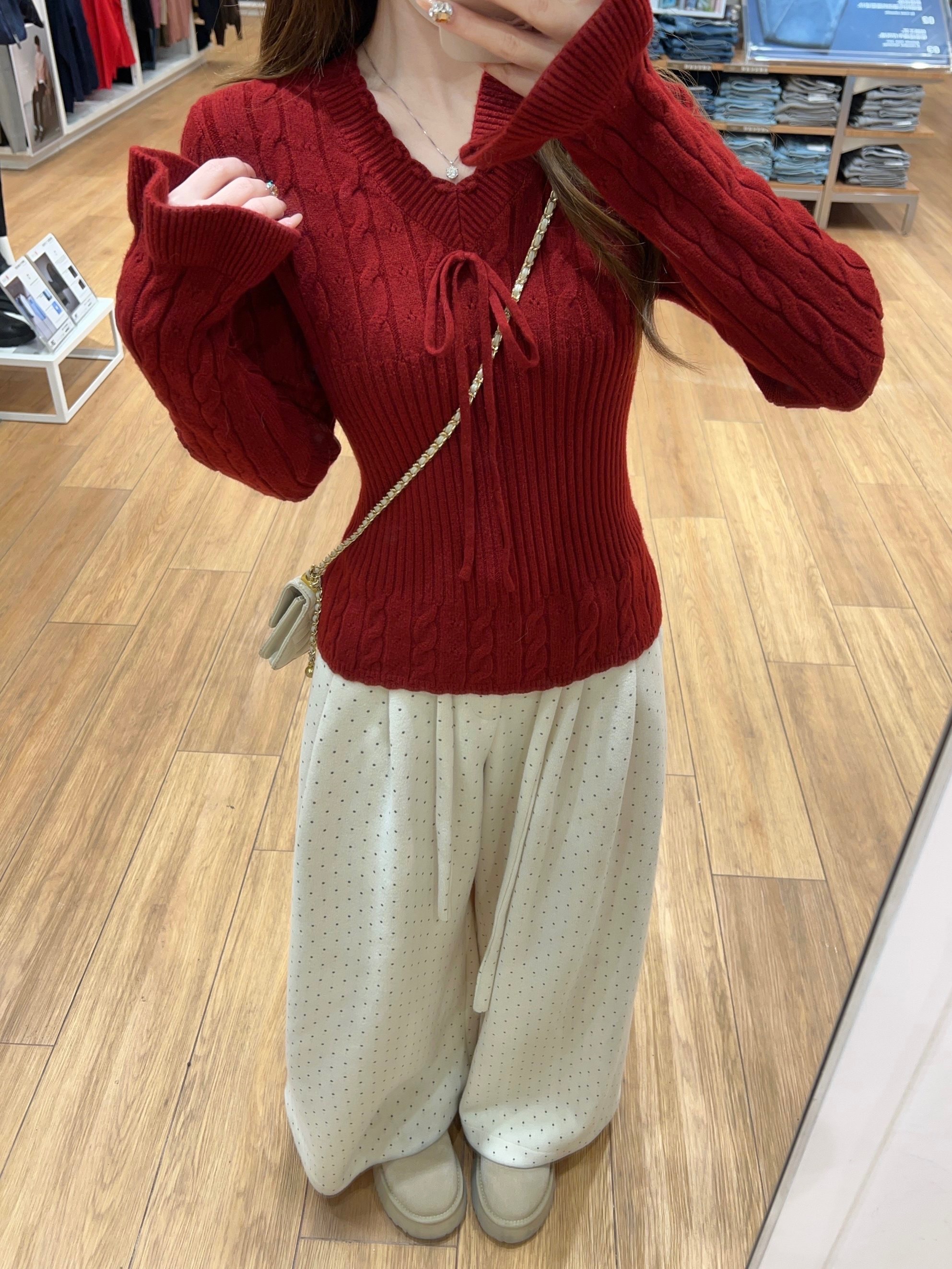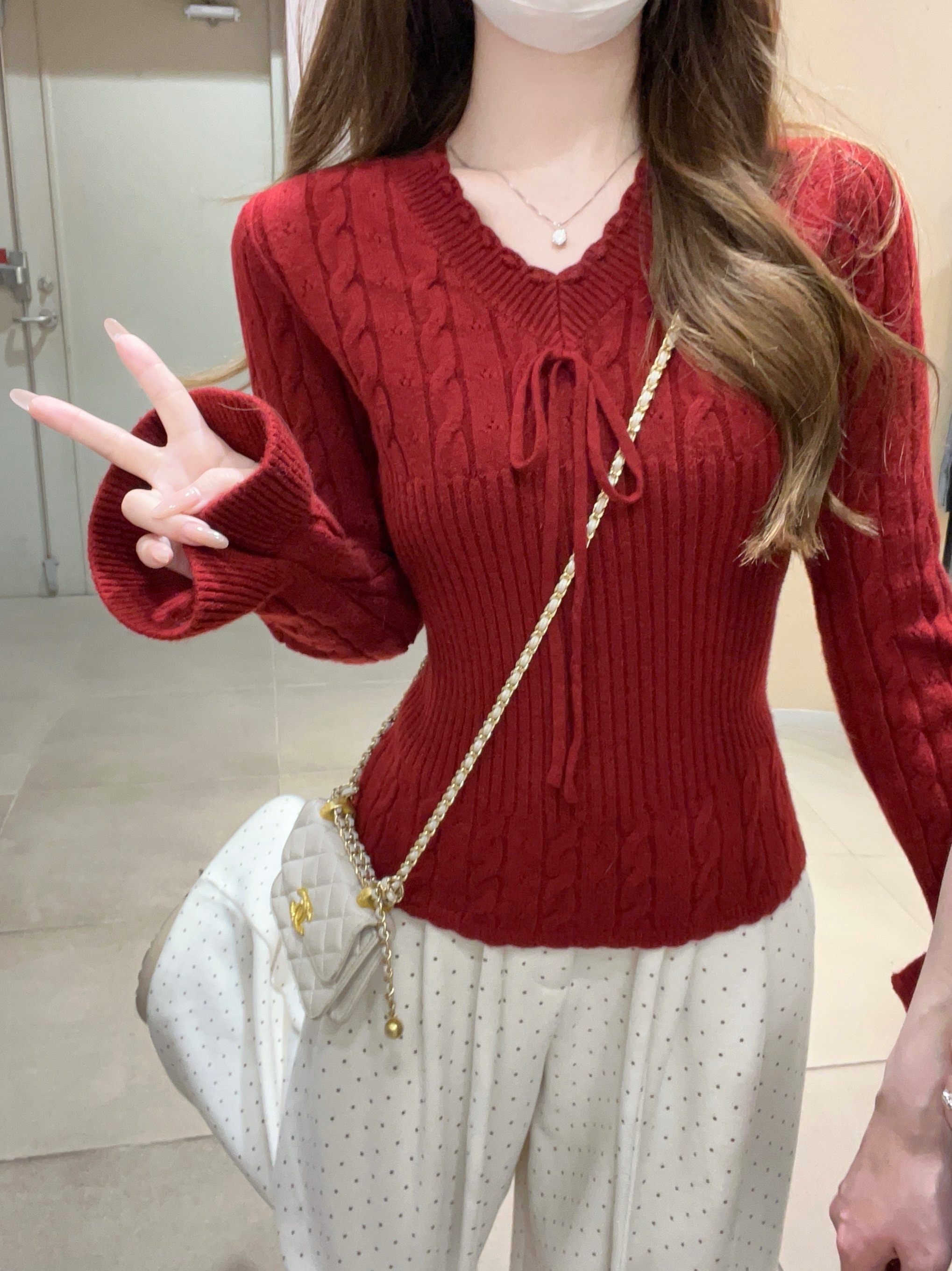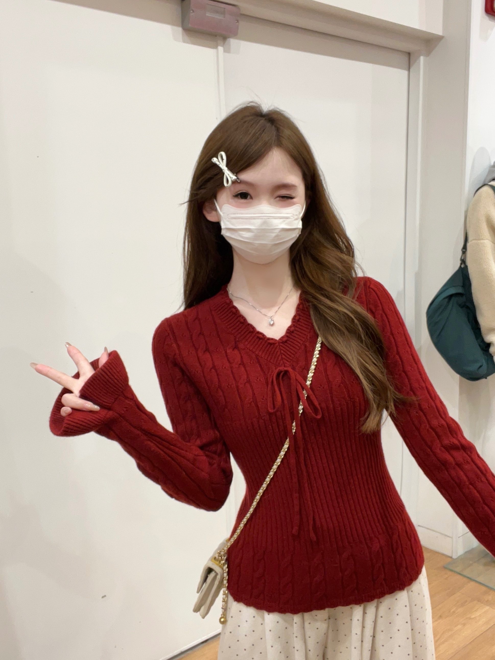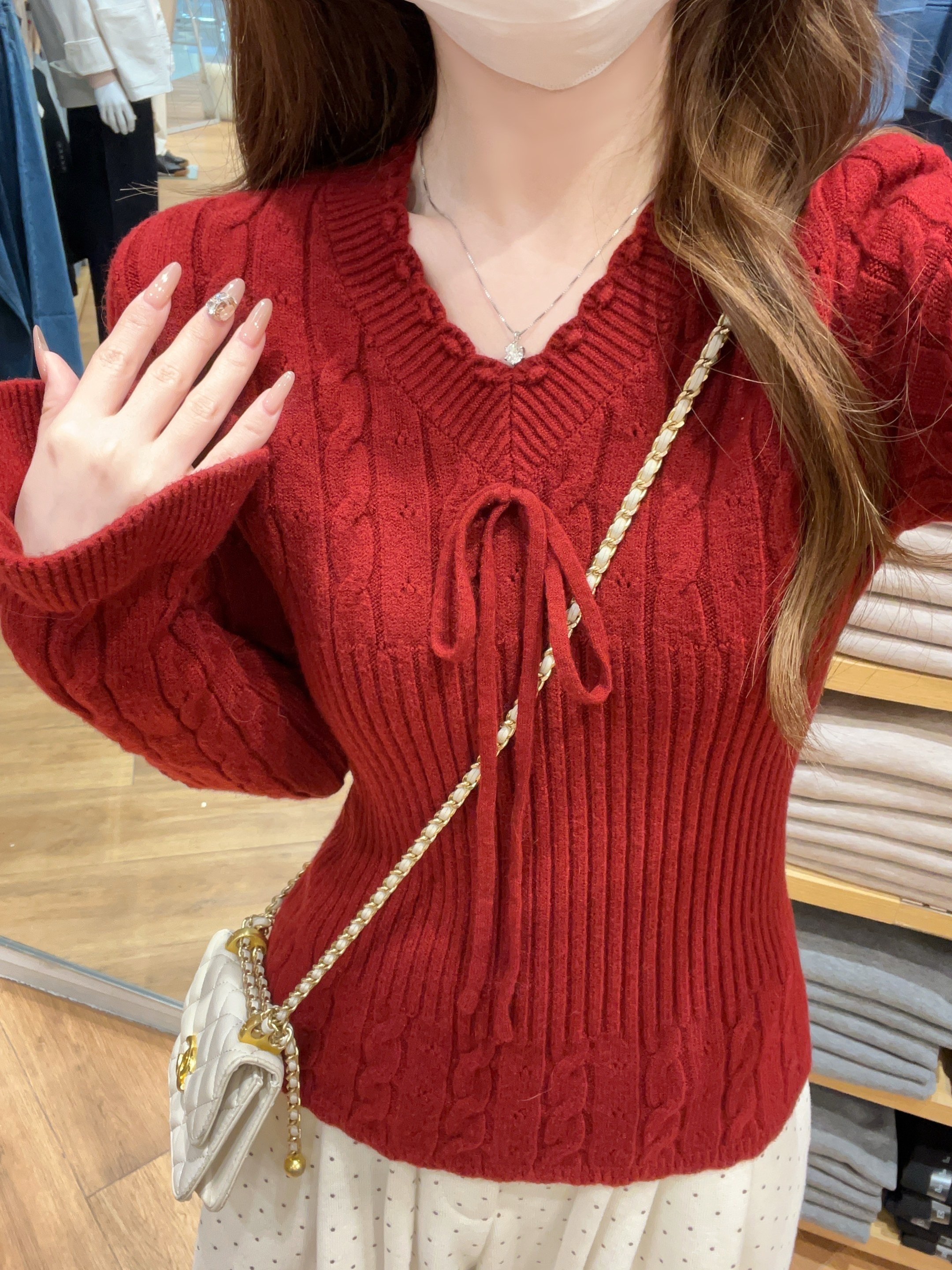 MY17492# 法式红色V领绑带喇叭袖针织衫新款收腰显瘦百搭毛衣上衣潮女裝貨源服裝批發