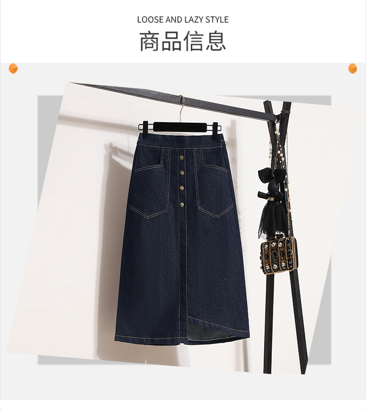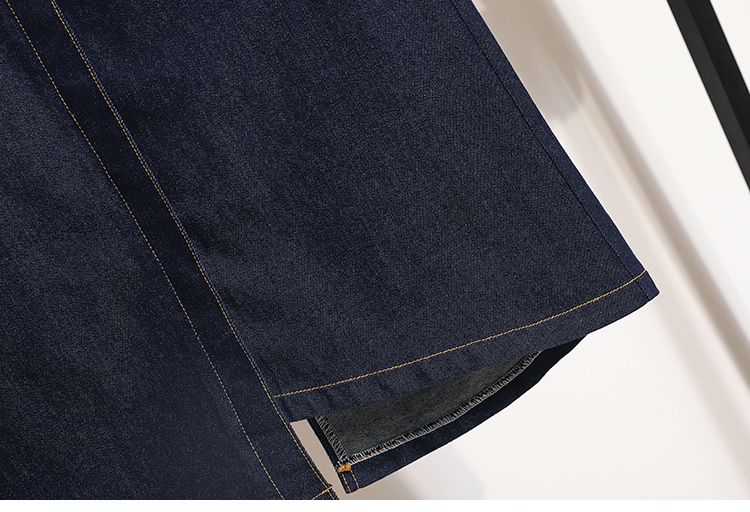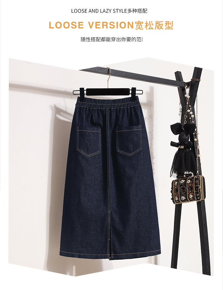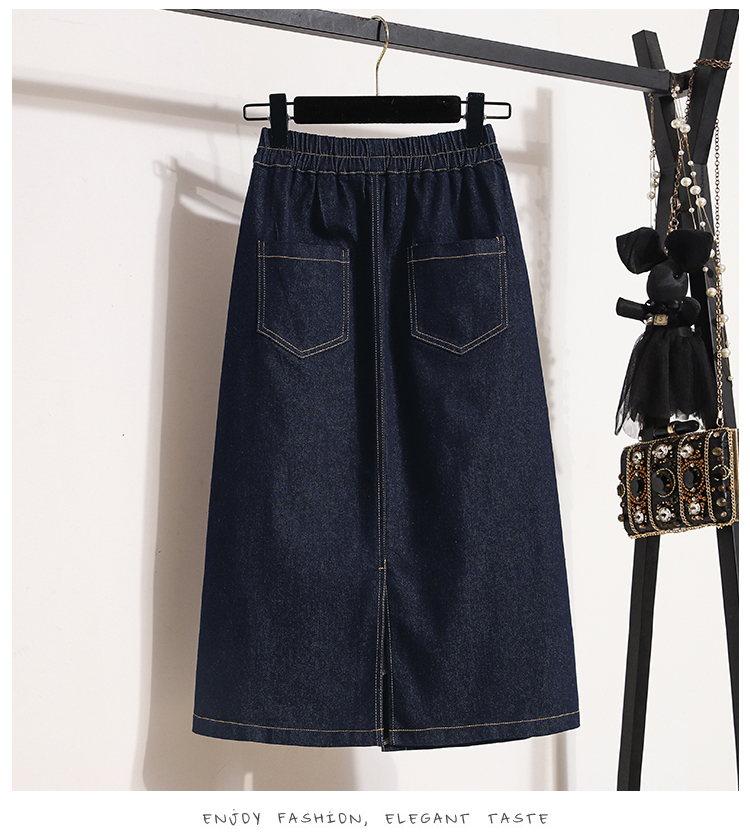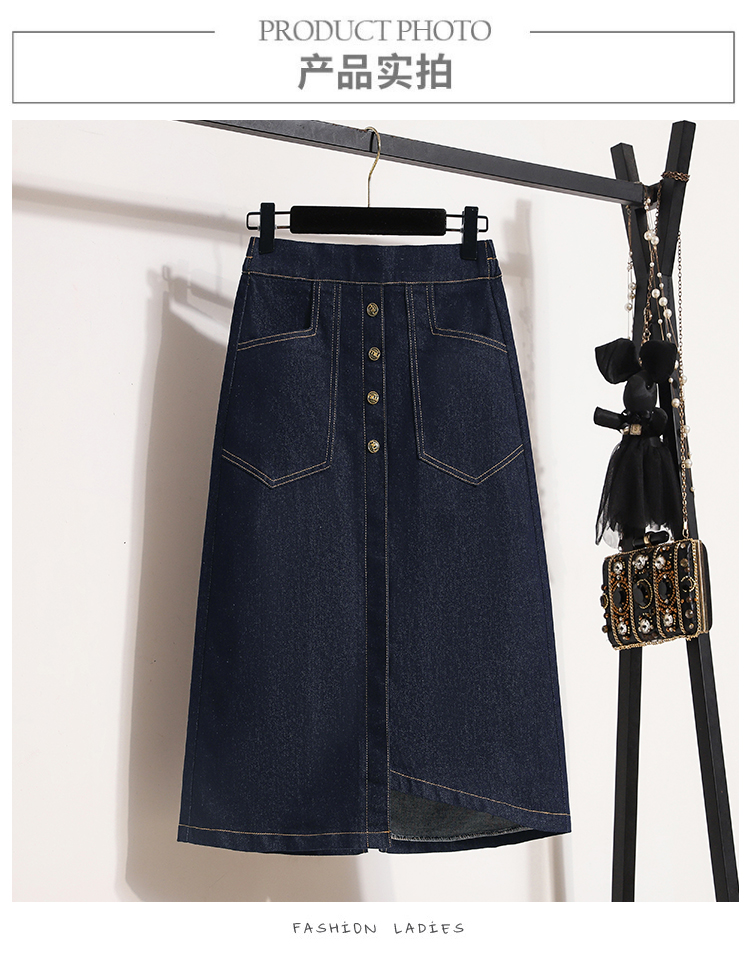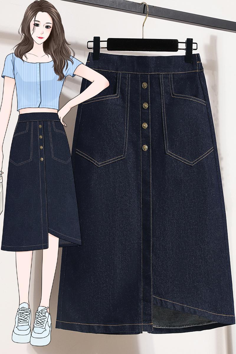MY17509# 大码深蓝色弹力牛仔半身裙女胖MM中长款高腰A字开叉裙子女裝貨源服裝批發