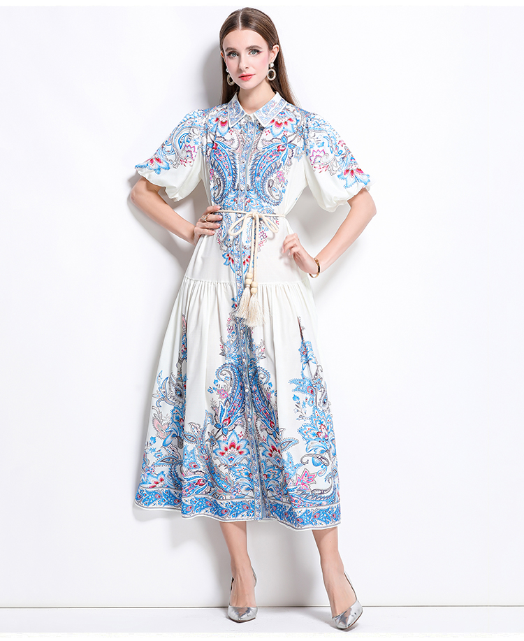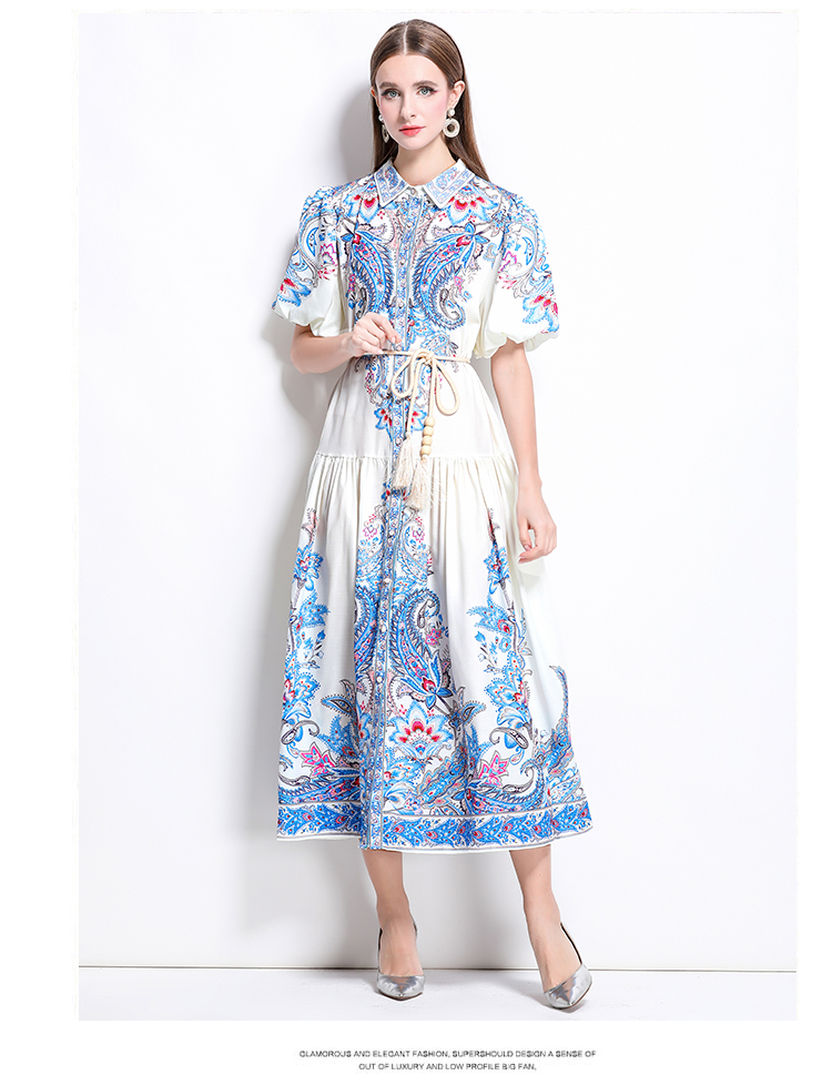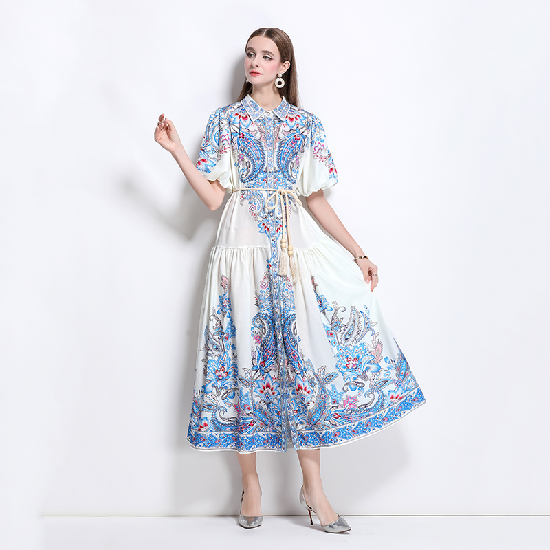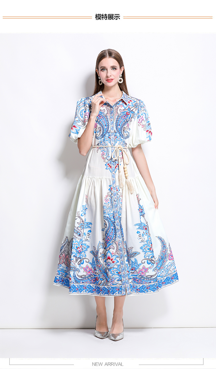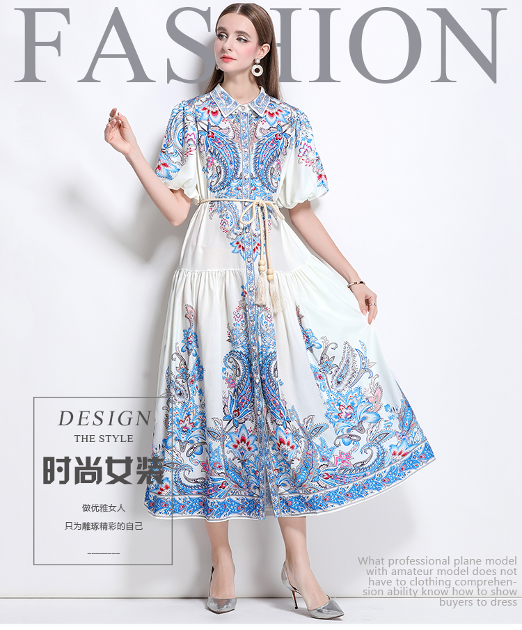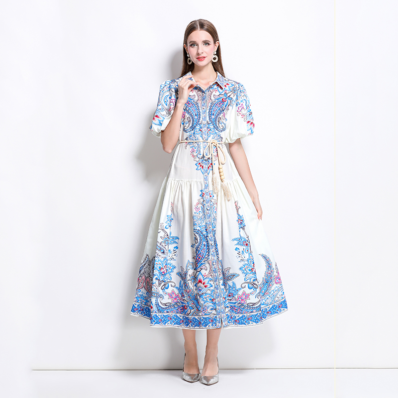 MY17517# 新款复古棉麻翻领灯笼袖印花连衣裙长裙女裝貨源服裝批發