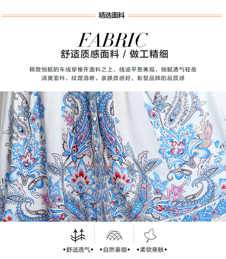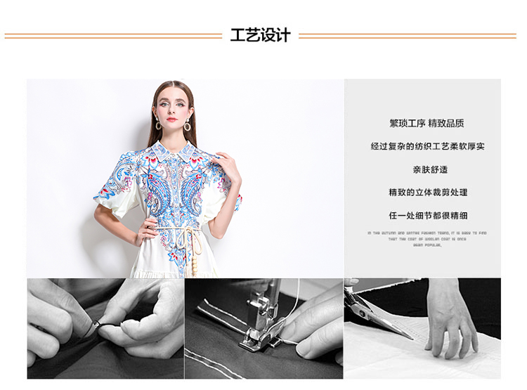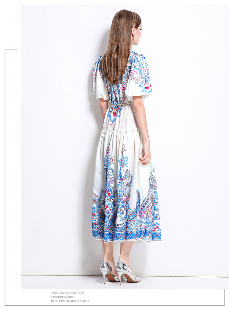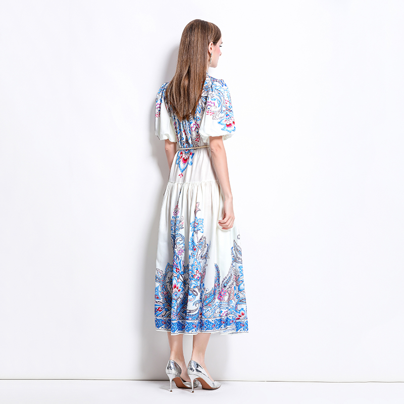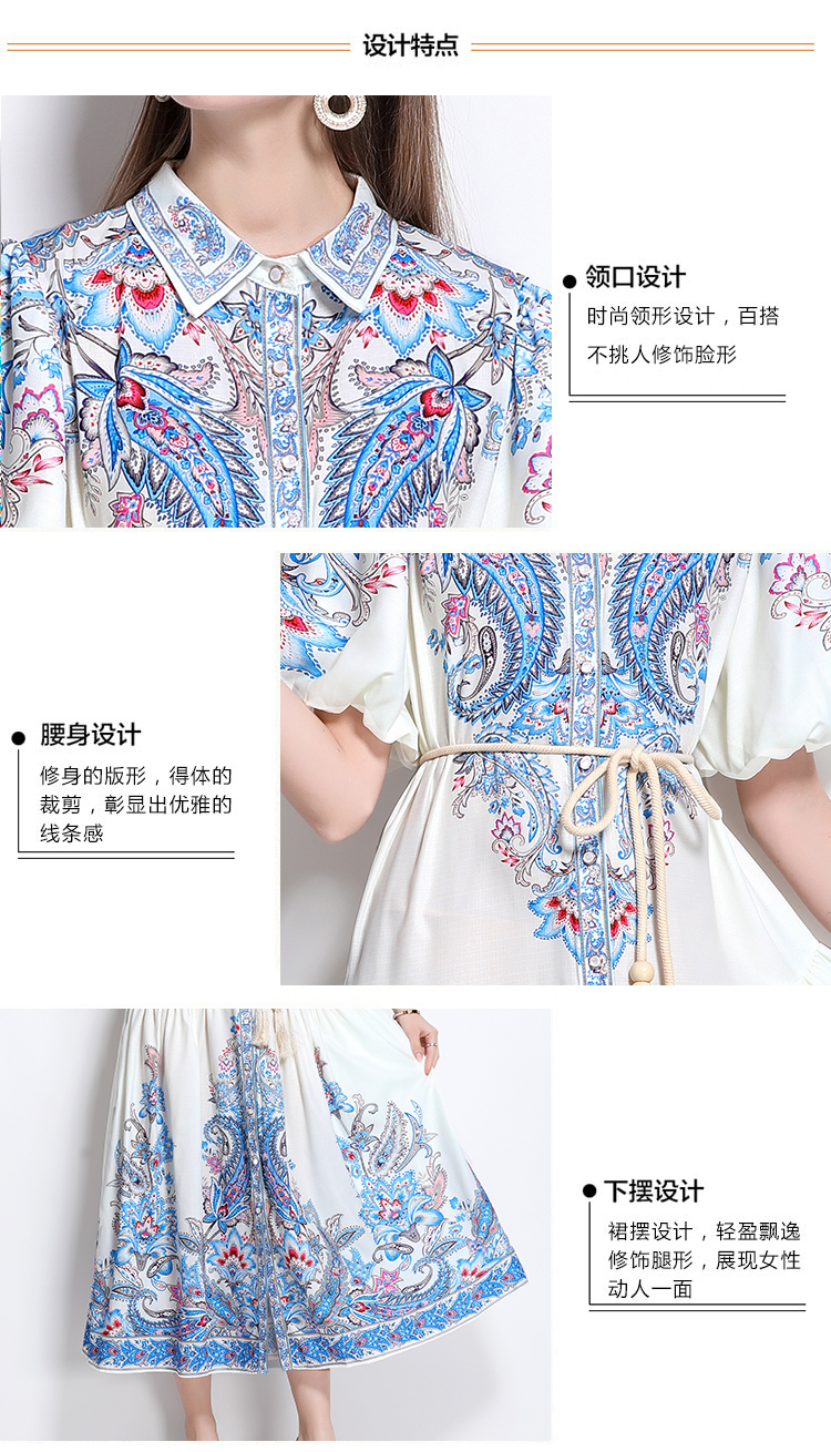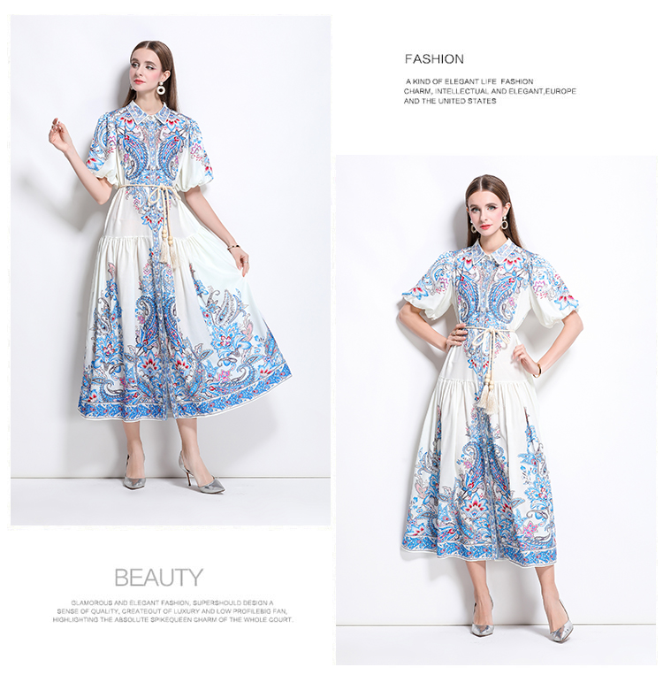 MY17517# 新款复古棉麻翻领灯笼袖印花连衣裙长裙女裝貨源服裝批發