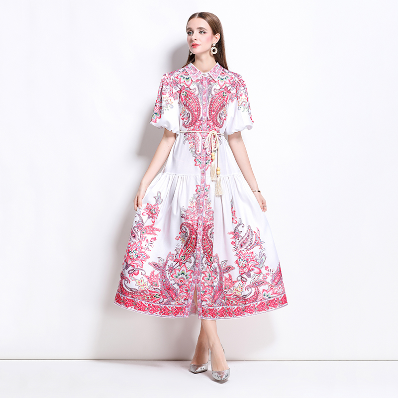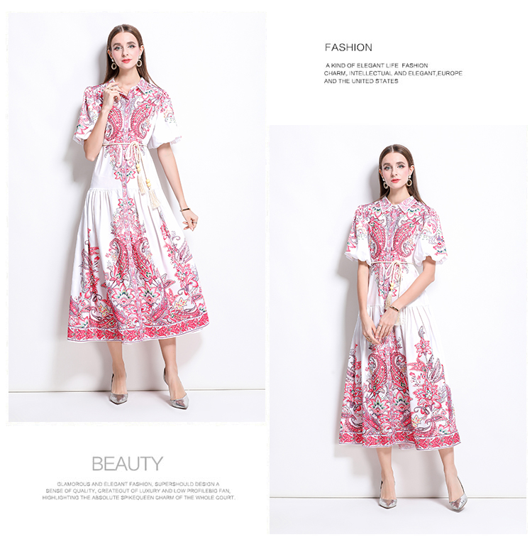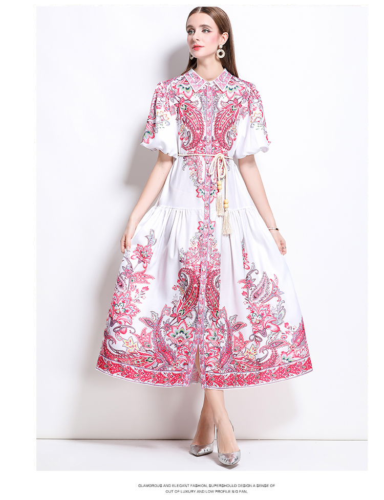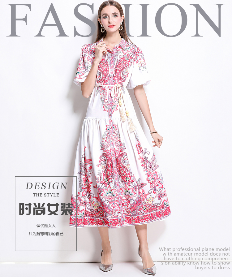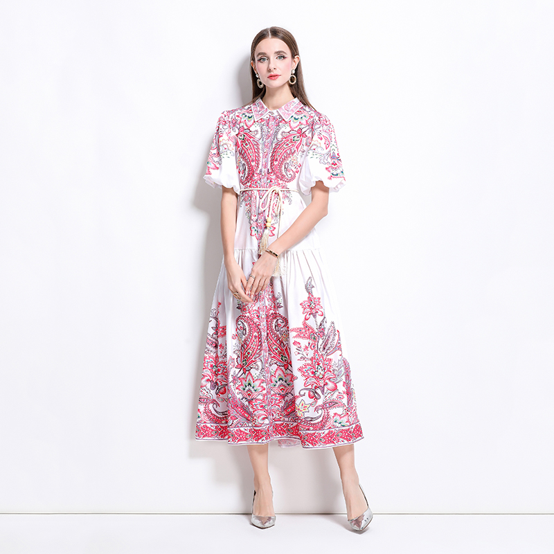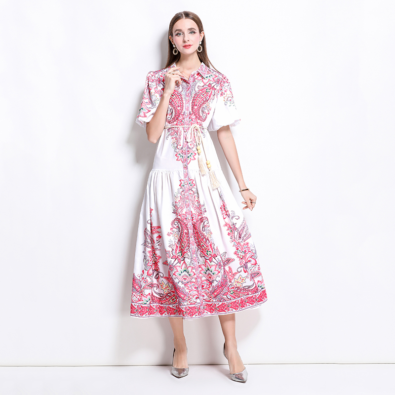 MY17518# 新款复古棉麻翻领灯笼袖印花连衣裙长裙女裝貨源服裝批發
