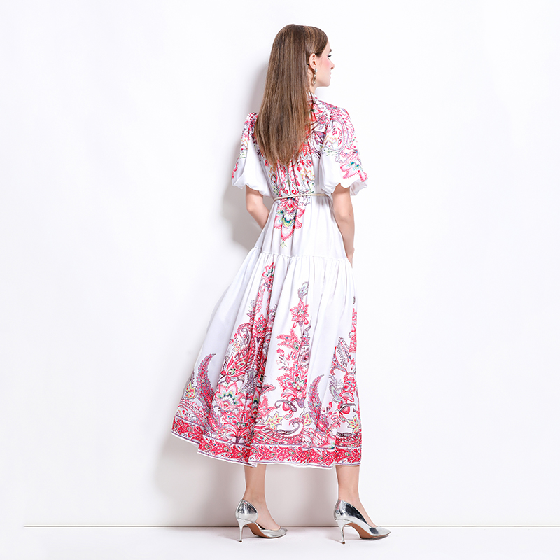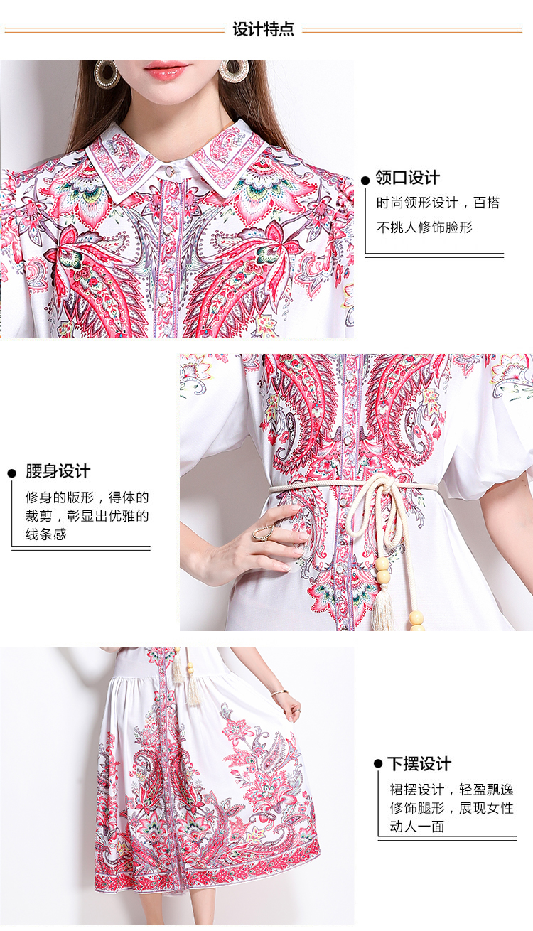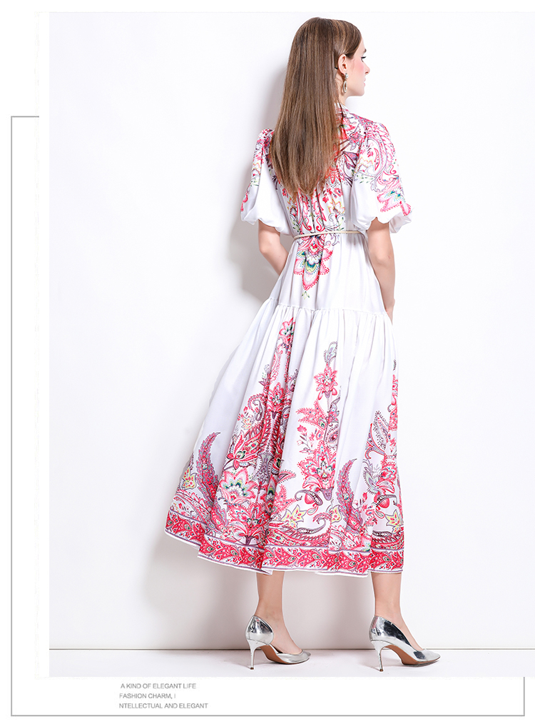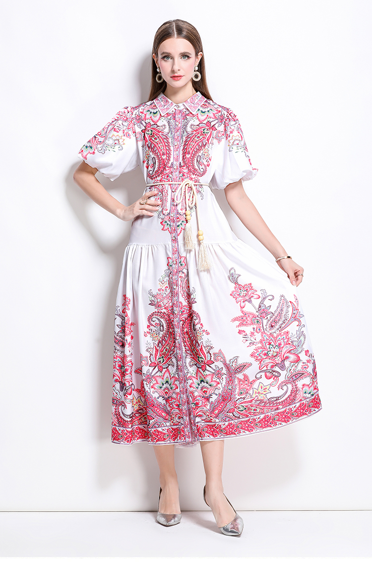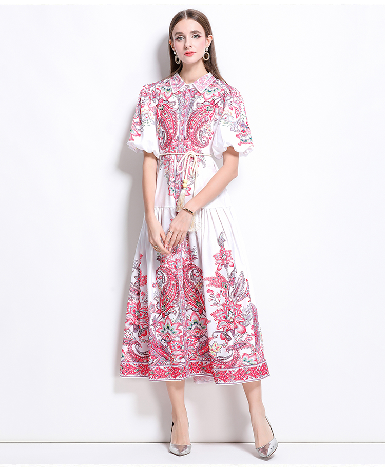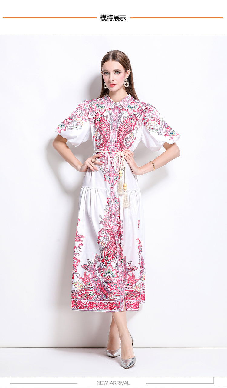 MY17518# 新款复古棉麻翻领灯笼袖印花连衣裙长裙女裝貨源服裝批發