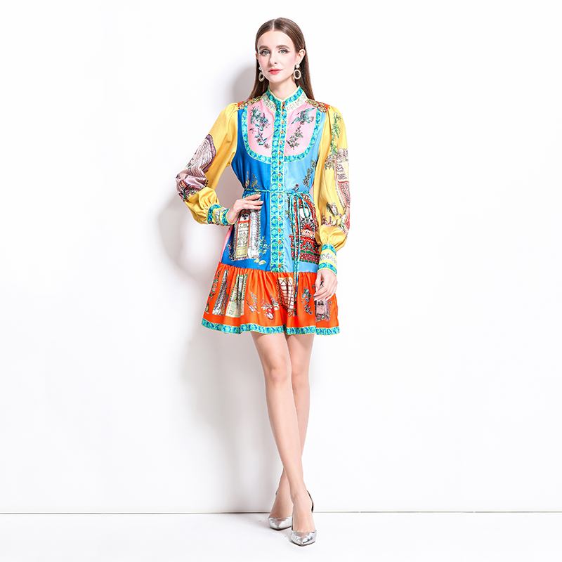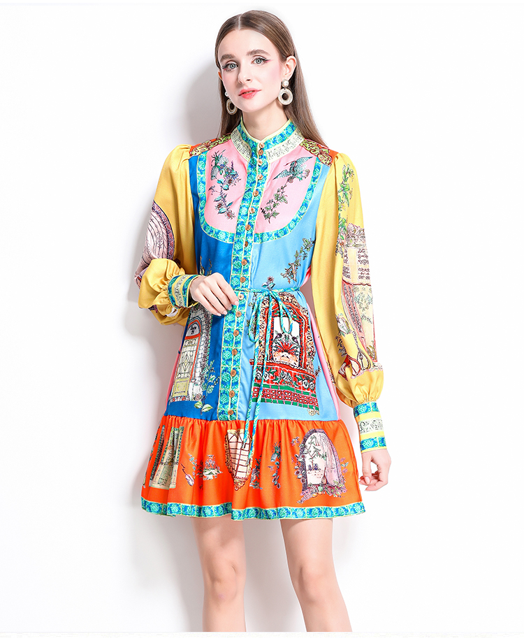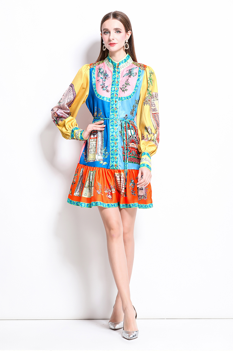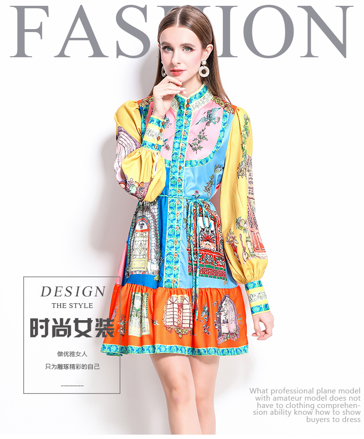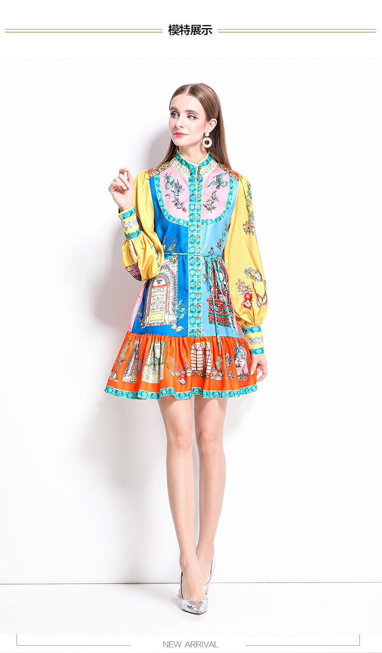 MY17519# 新款复古印花灯笼袖荷叶边连衣裙女裝貨源服裝批發