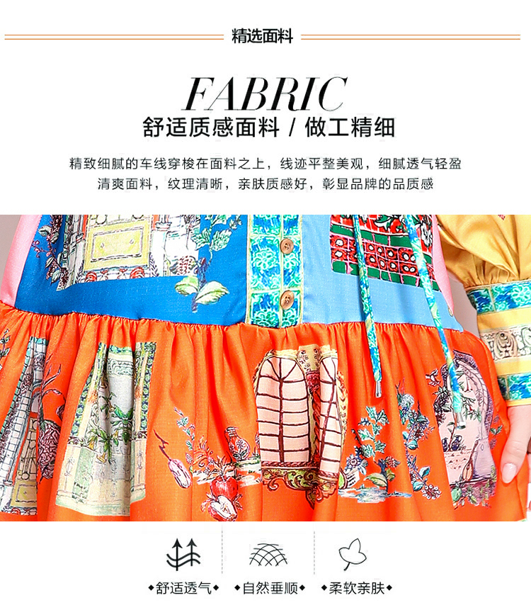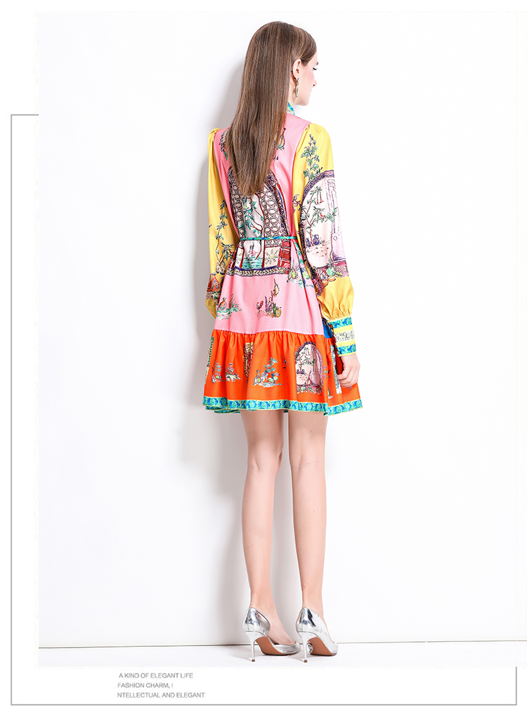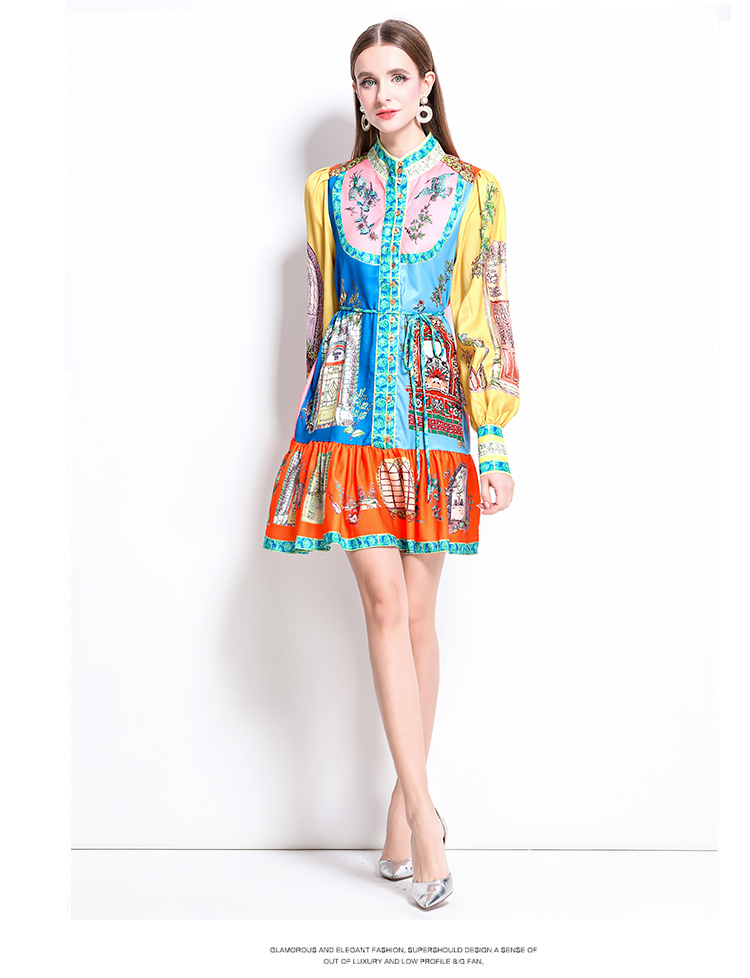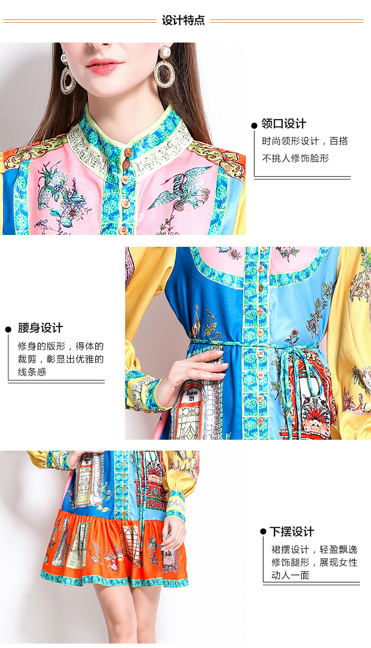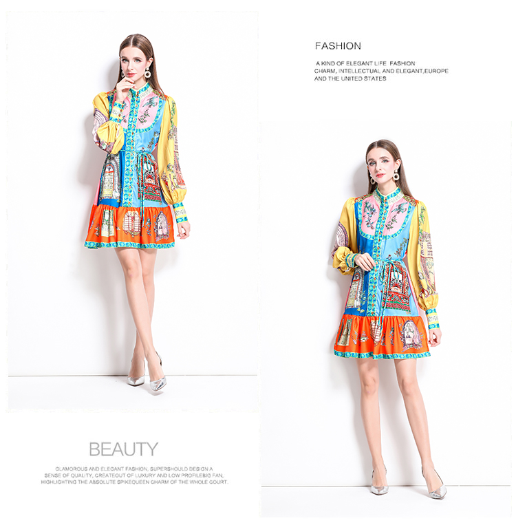 MY17519# 新款复古印花灯笼袖荷叶边连衣裙女裝貨源服裝批發