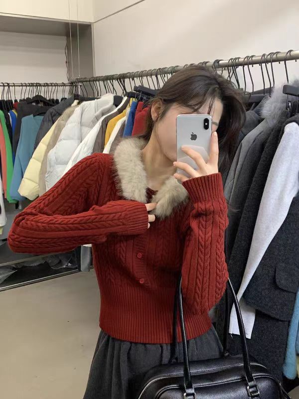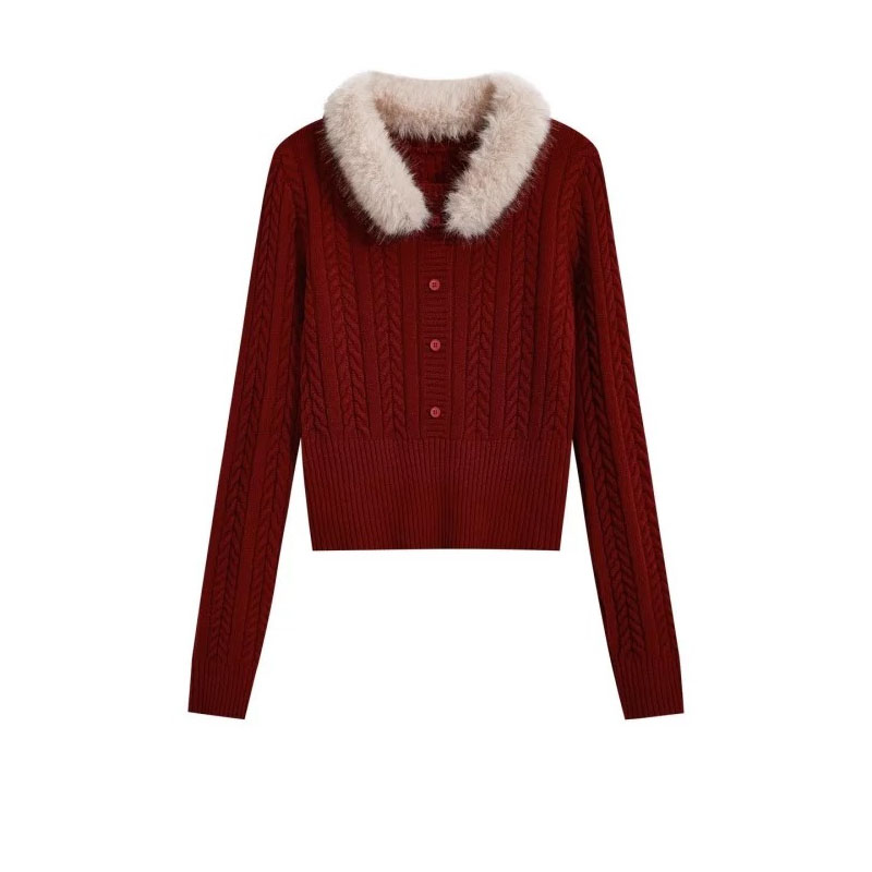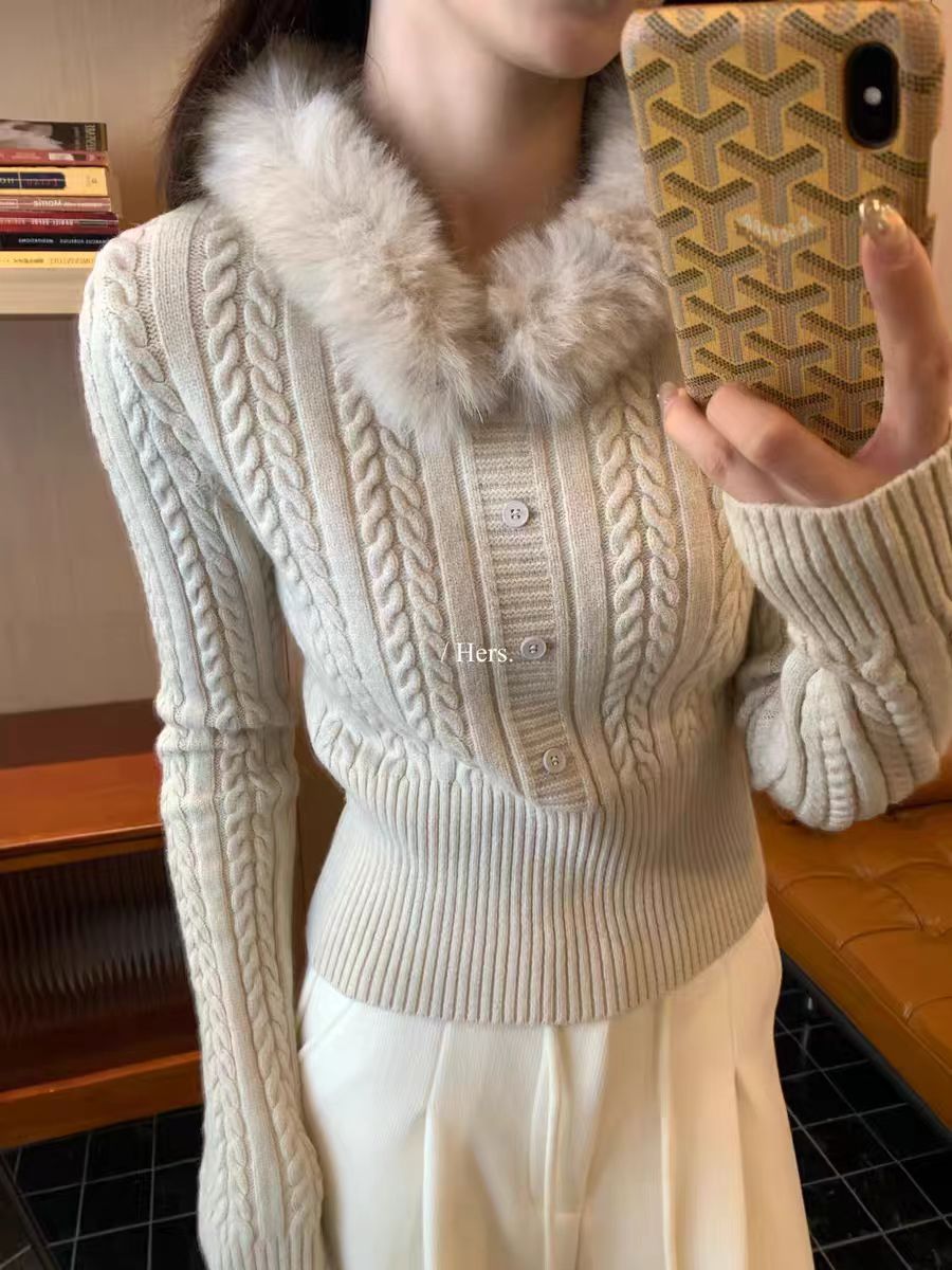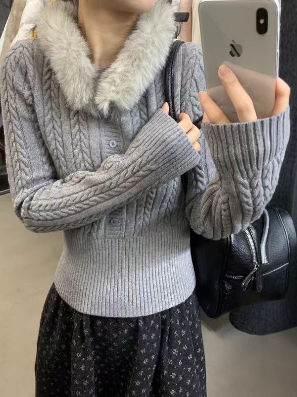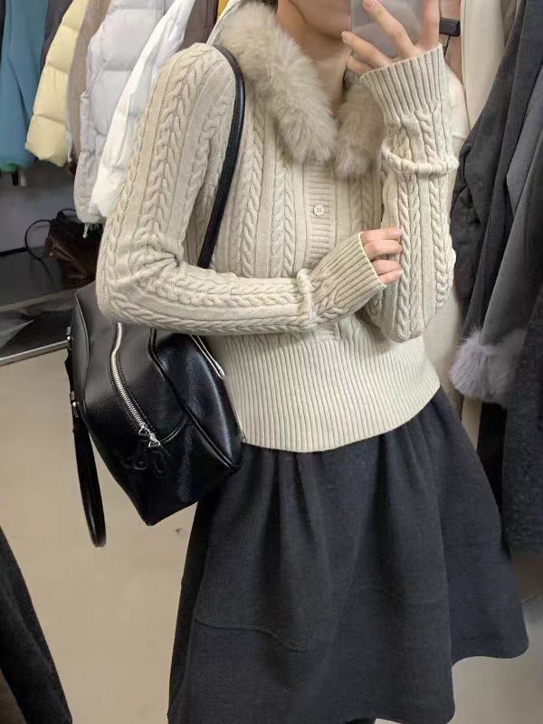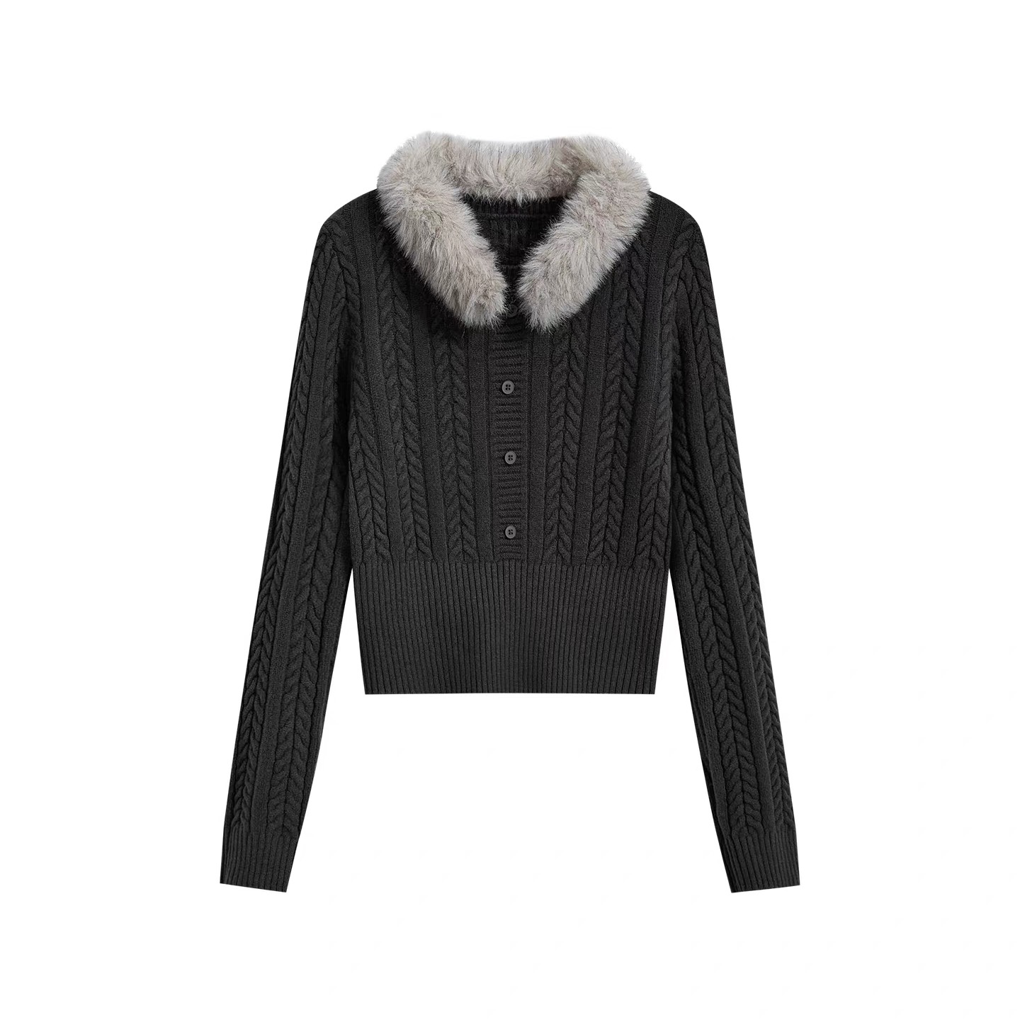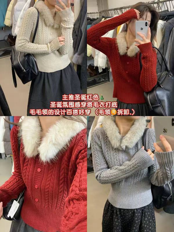MY17533# 韩系简约气质百搭显瘦针织衫女可拆卸毛领麻花保暖毛衣女裝貨源服裝批發