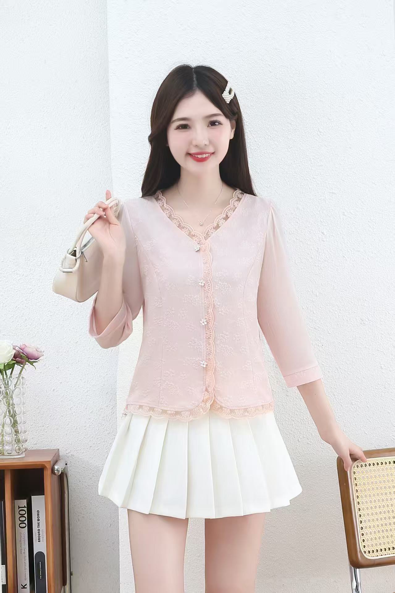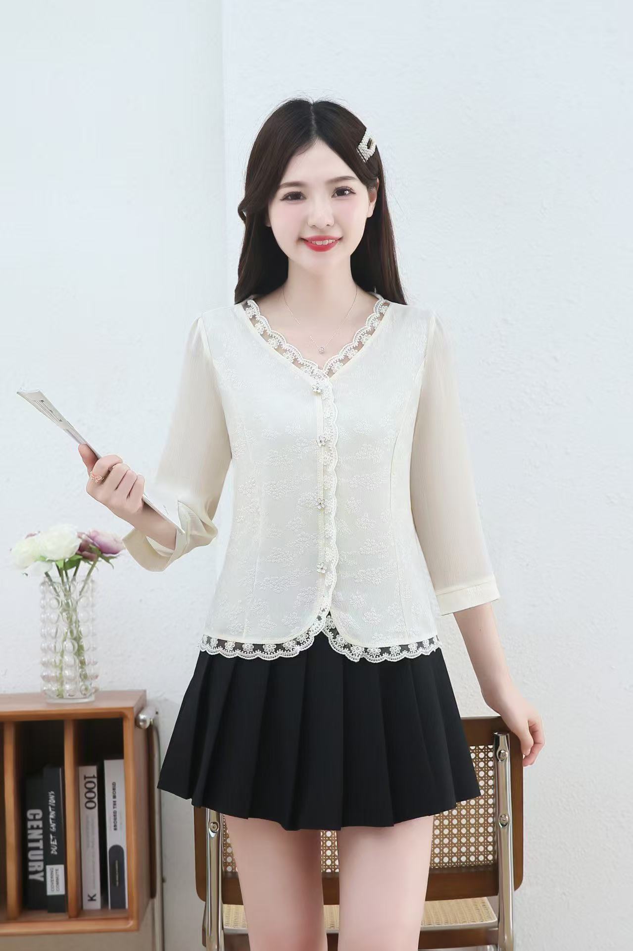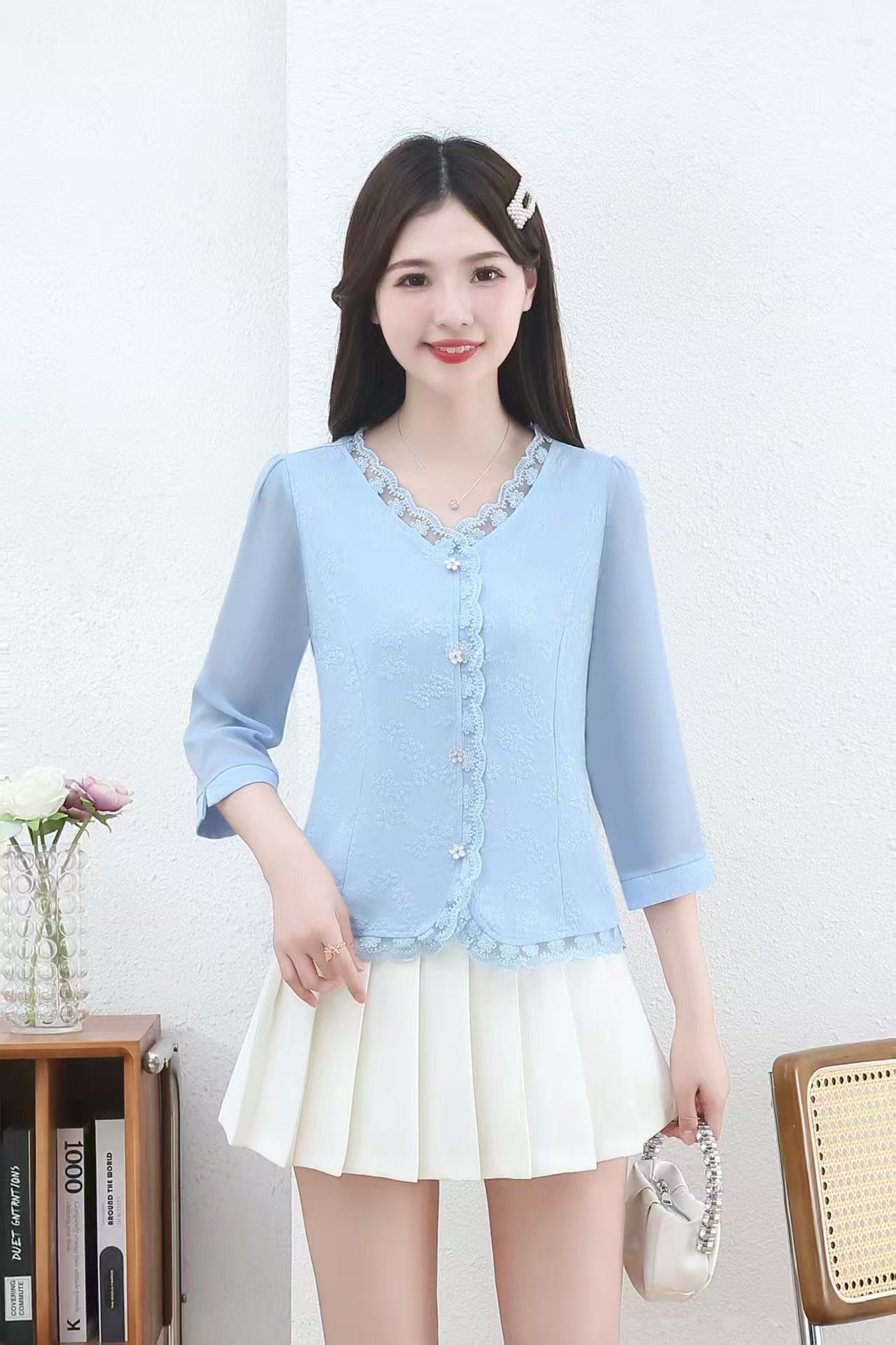 MY17537# 七分袖雪纺女衬衫轻奢高级感木耳边小衫新款法式短款上衣女裝貨源服裝批發