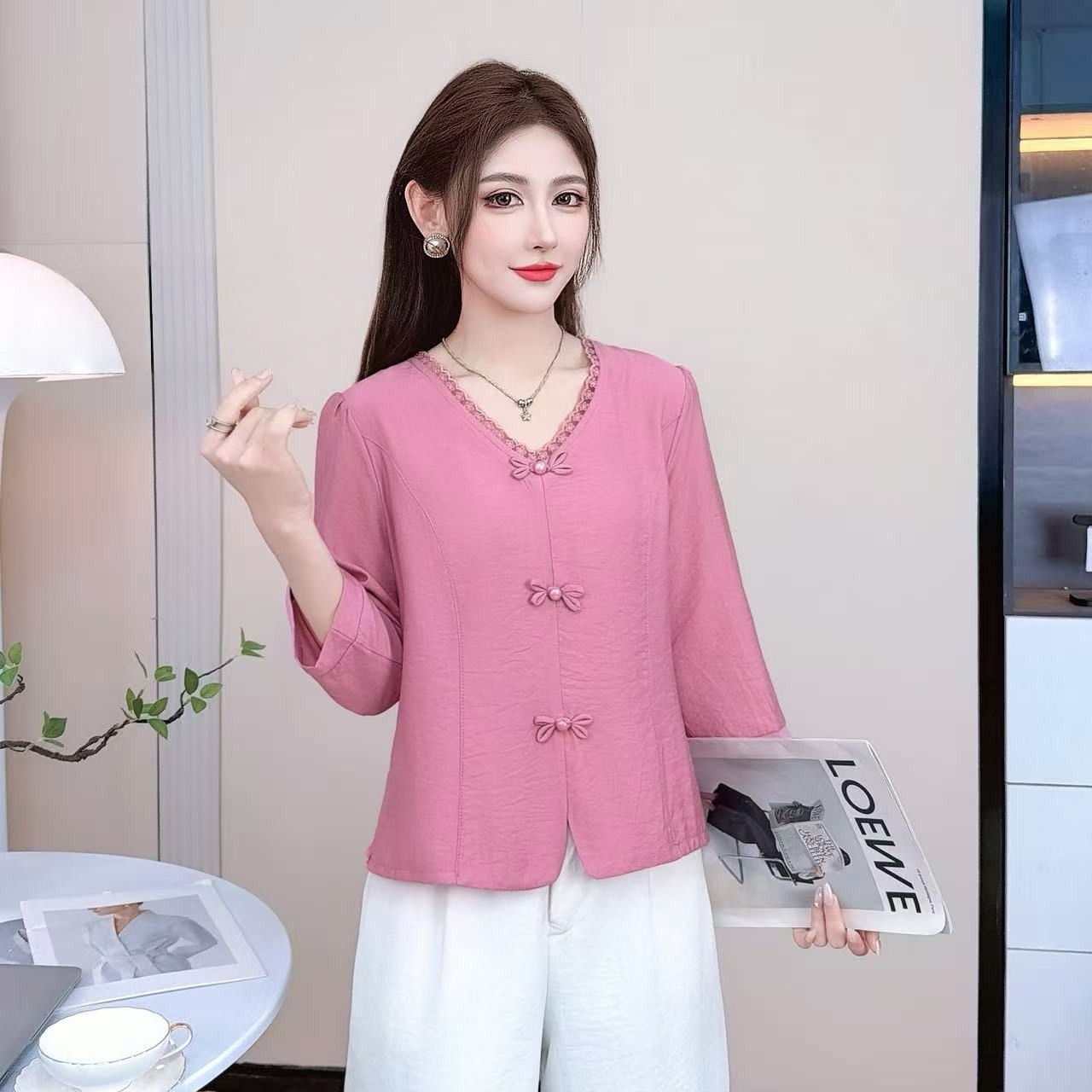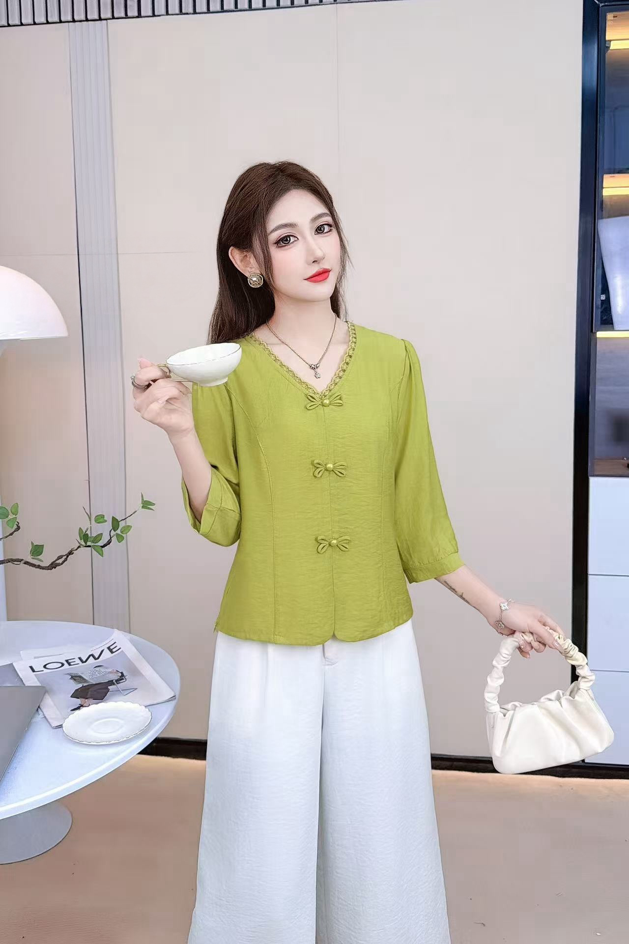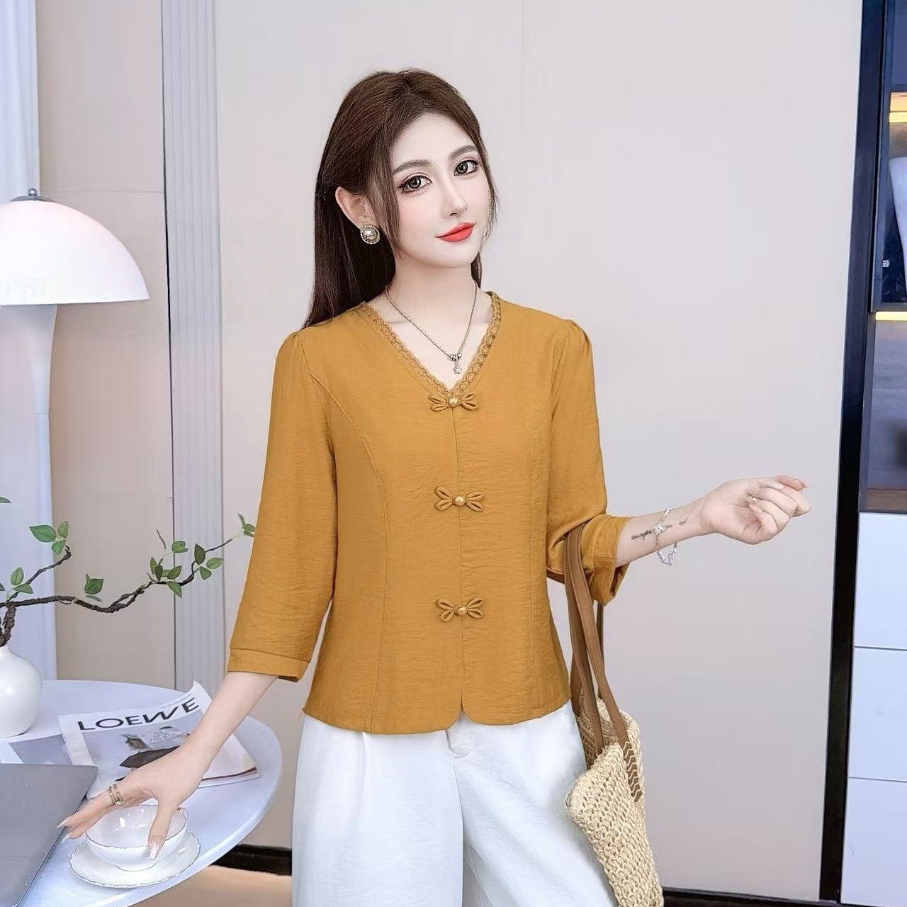 MY17538# 国风盘扣雪纺衬衫女七分袖新款收腰气质小衫修身短款上衣女裝貨源服裝批發