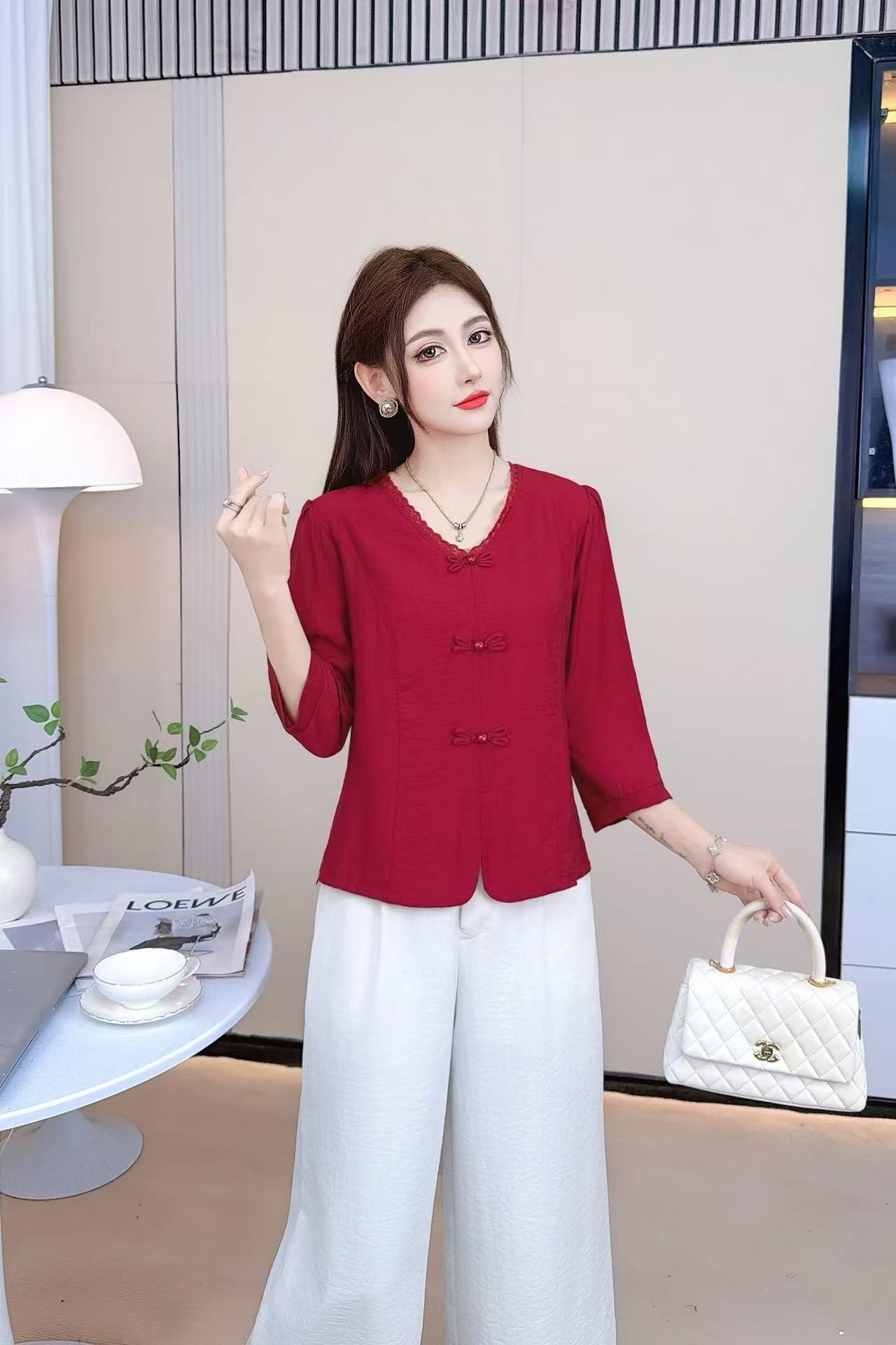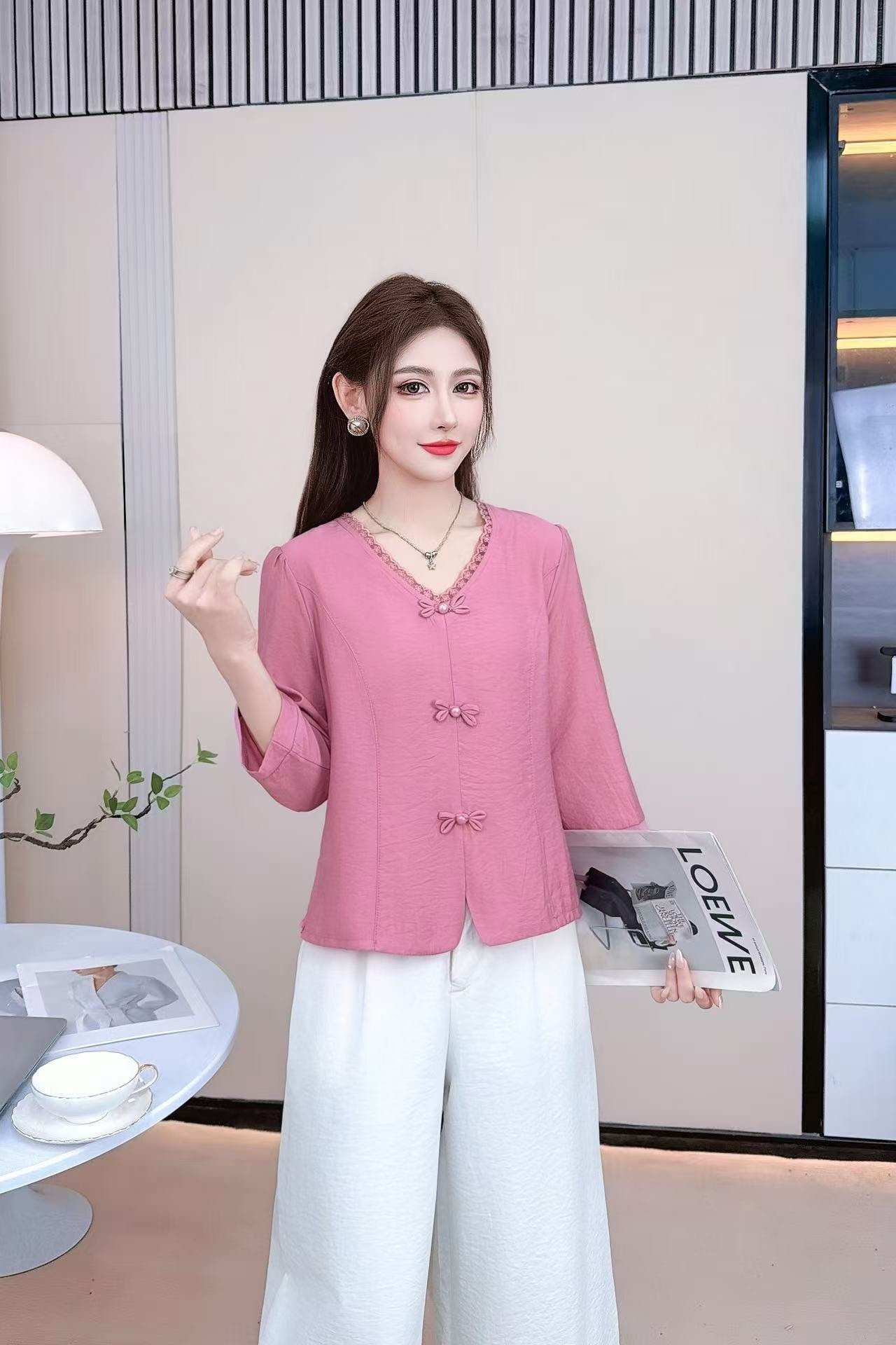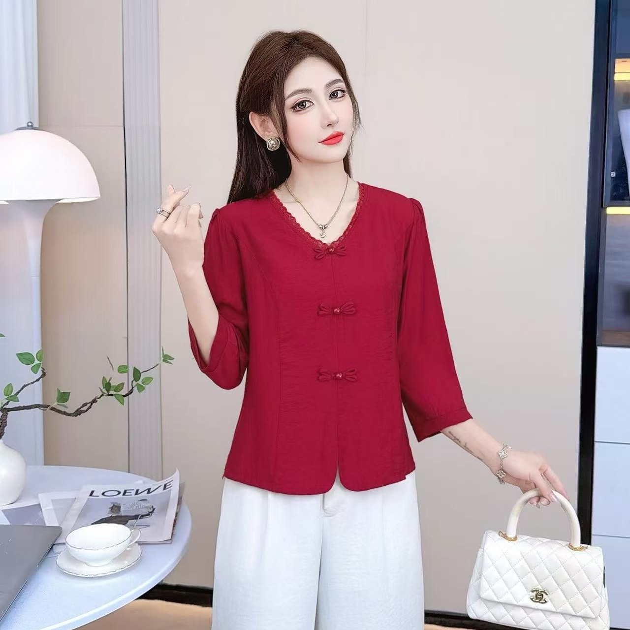 MY17538# 国风盘扣雪纺衬衫女七分袖新款收腰气质小衫修身短款上衣女裝貨源服裝批發