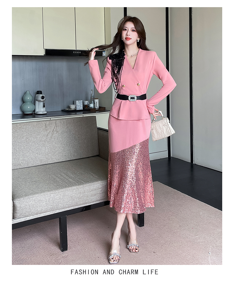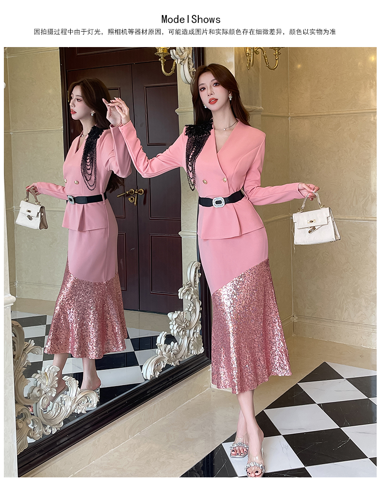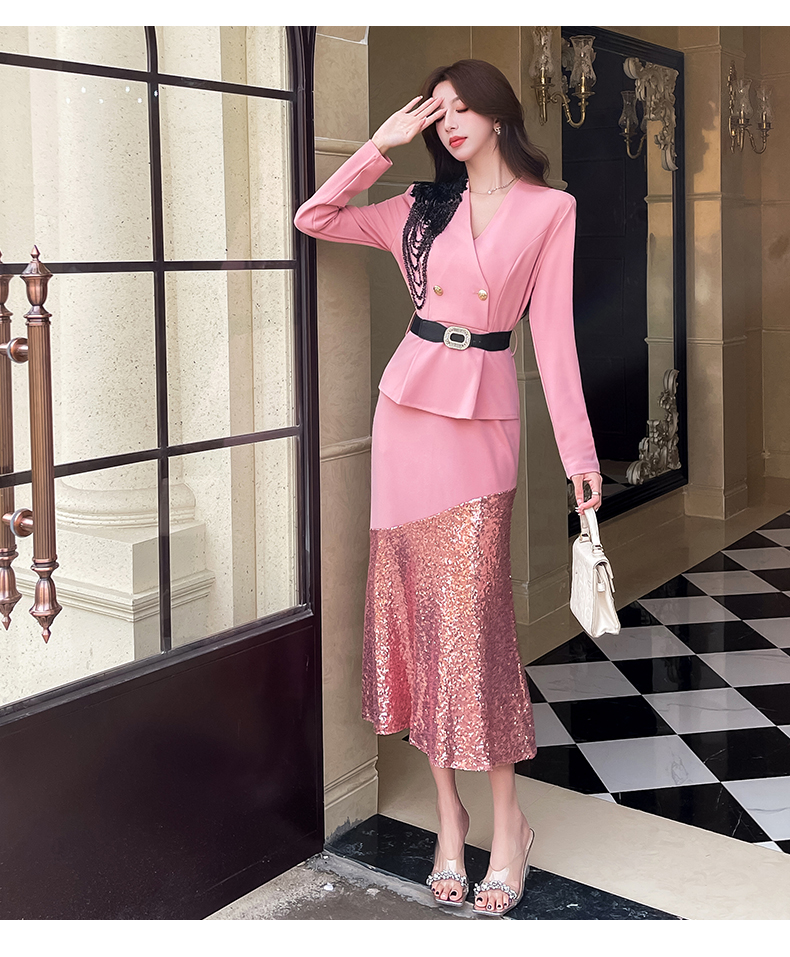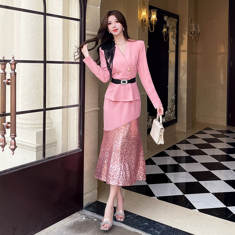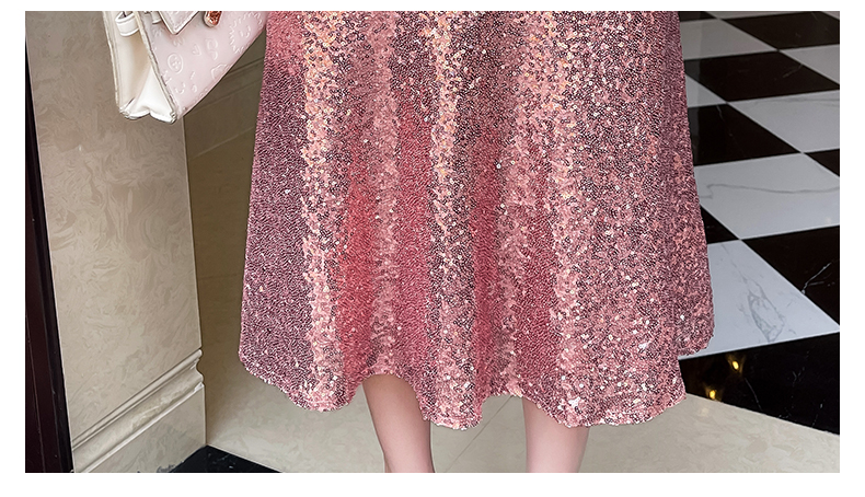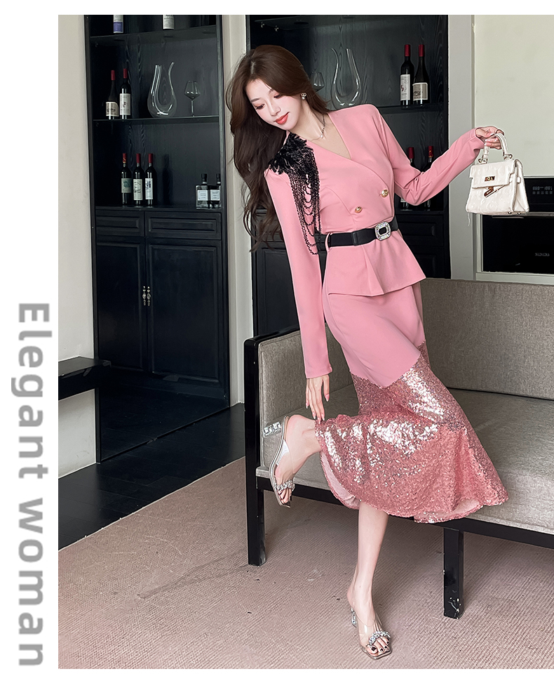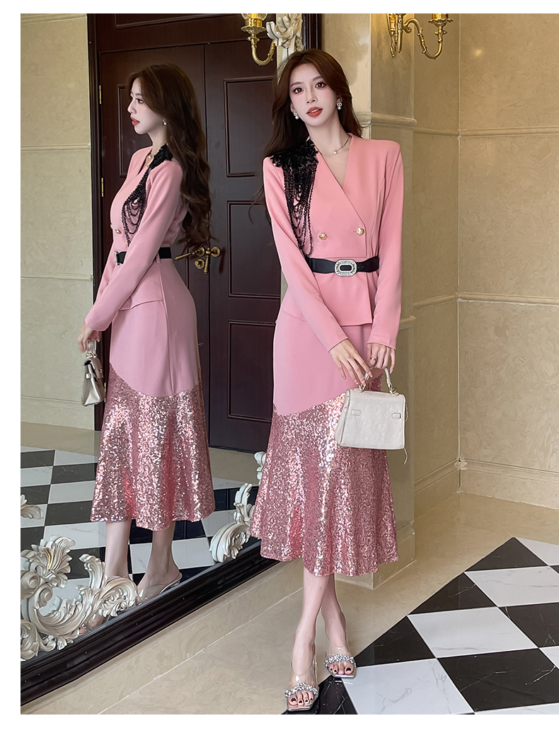 MY17551# 新款时尚网红v领双排扣长裙亮片拼接连衣裙女裝貨源服裝批發