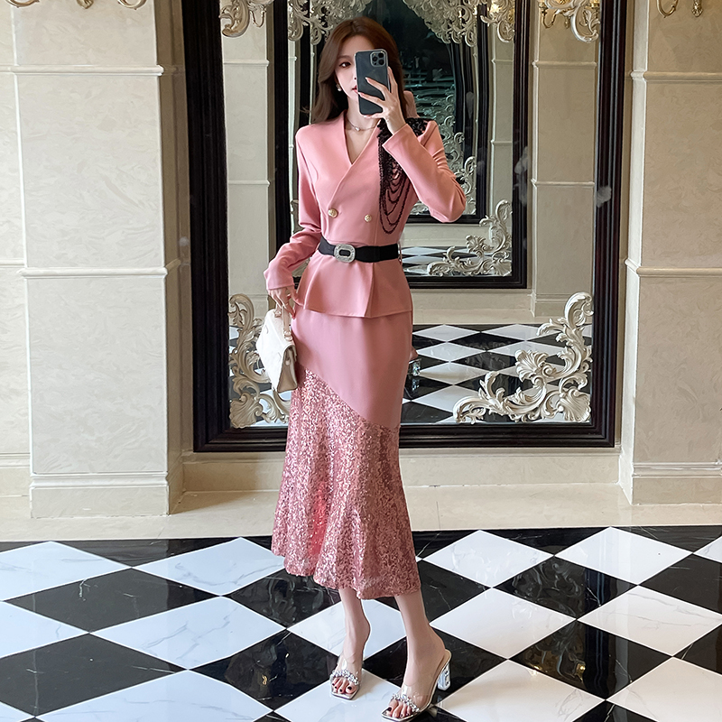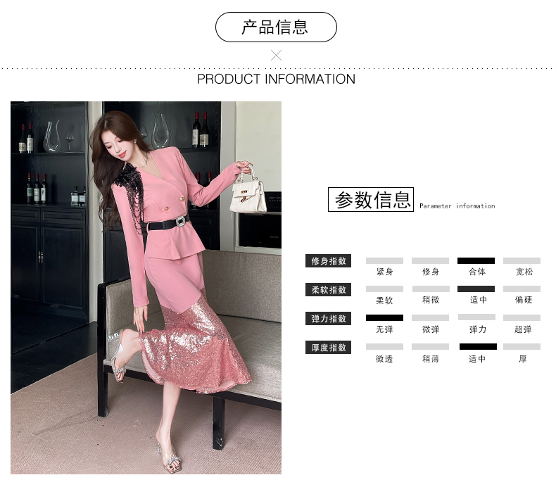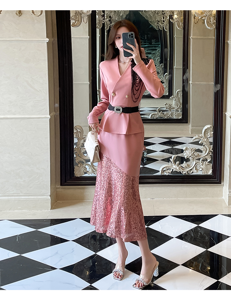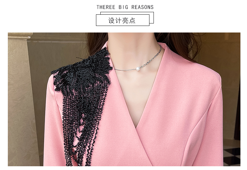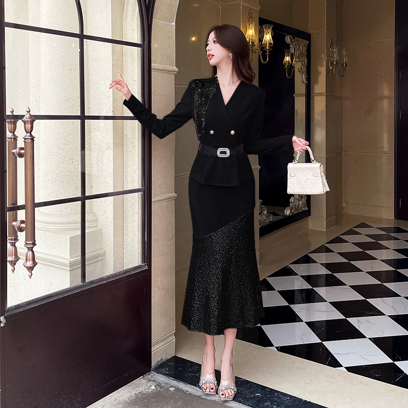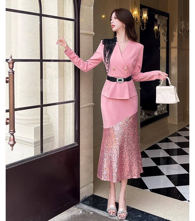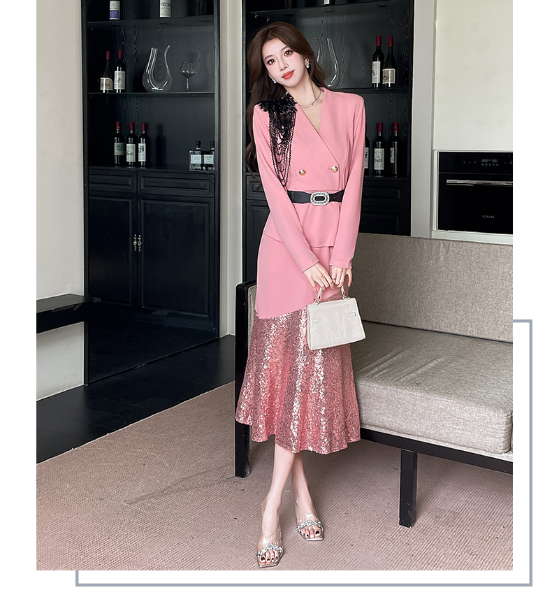 MY17551# 新款时尚网红v领双排扣长裙亮片拼接连衣裙女裝貨源服裝批發