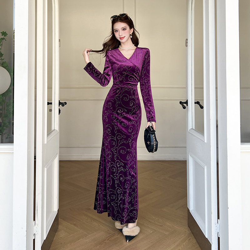 MY17560# 时尚印花v领长裙包臀连衣裙女裝貨源服裝批發