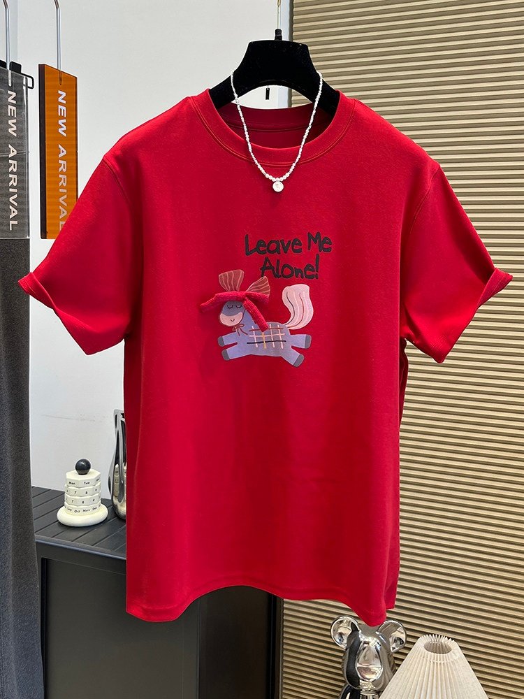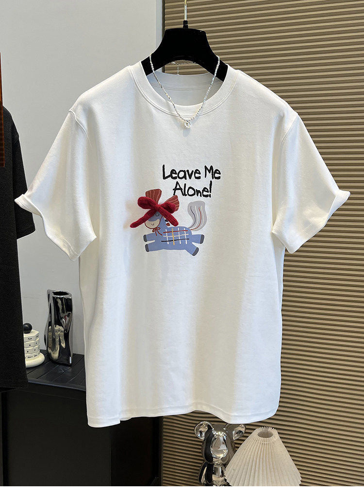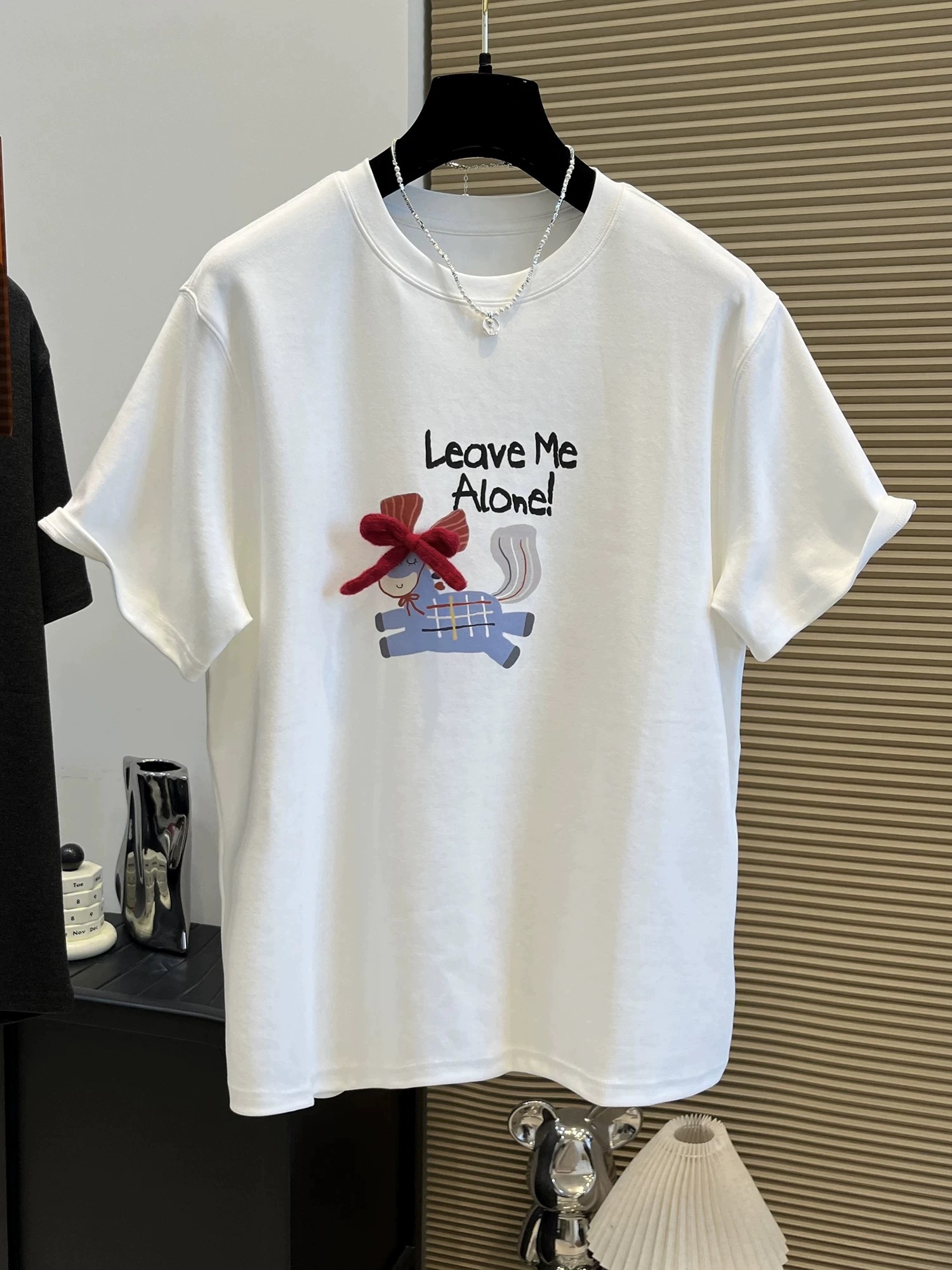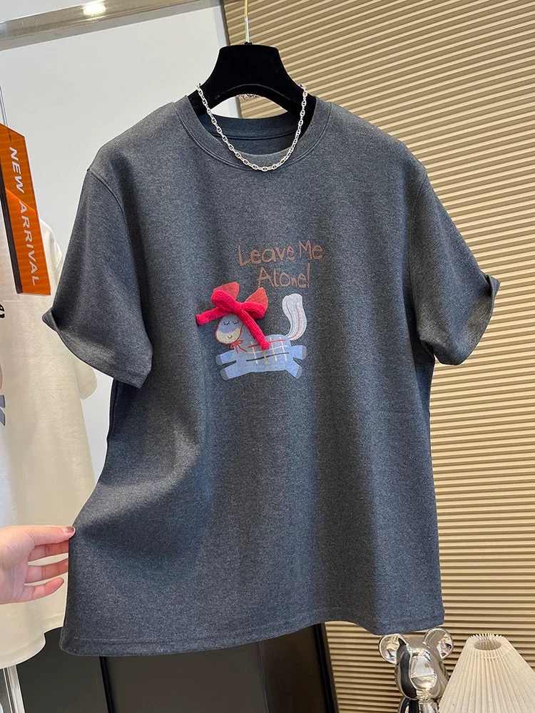 MY17565# 德绒特大码300斤韩版百搭休闲蝴蝶结刺绣德绒加厚短袖T恤女裝貨源服裝批發