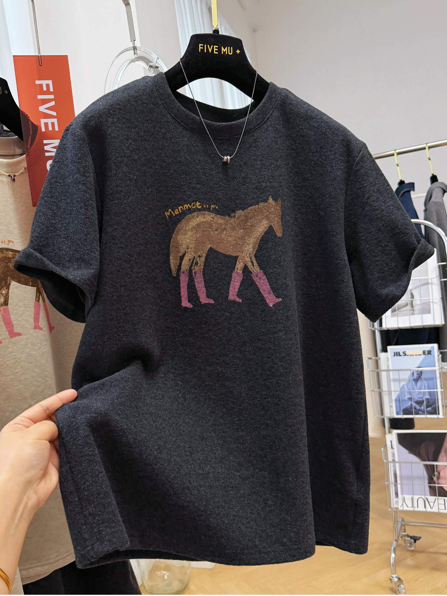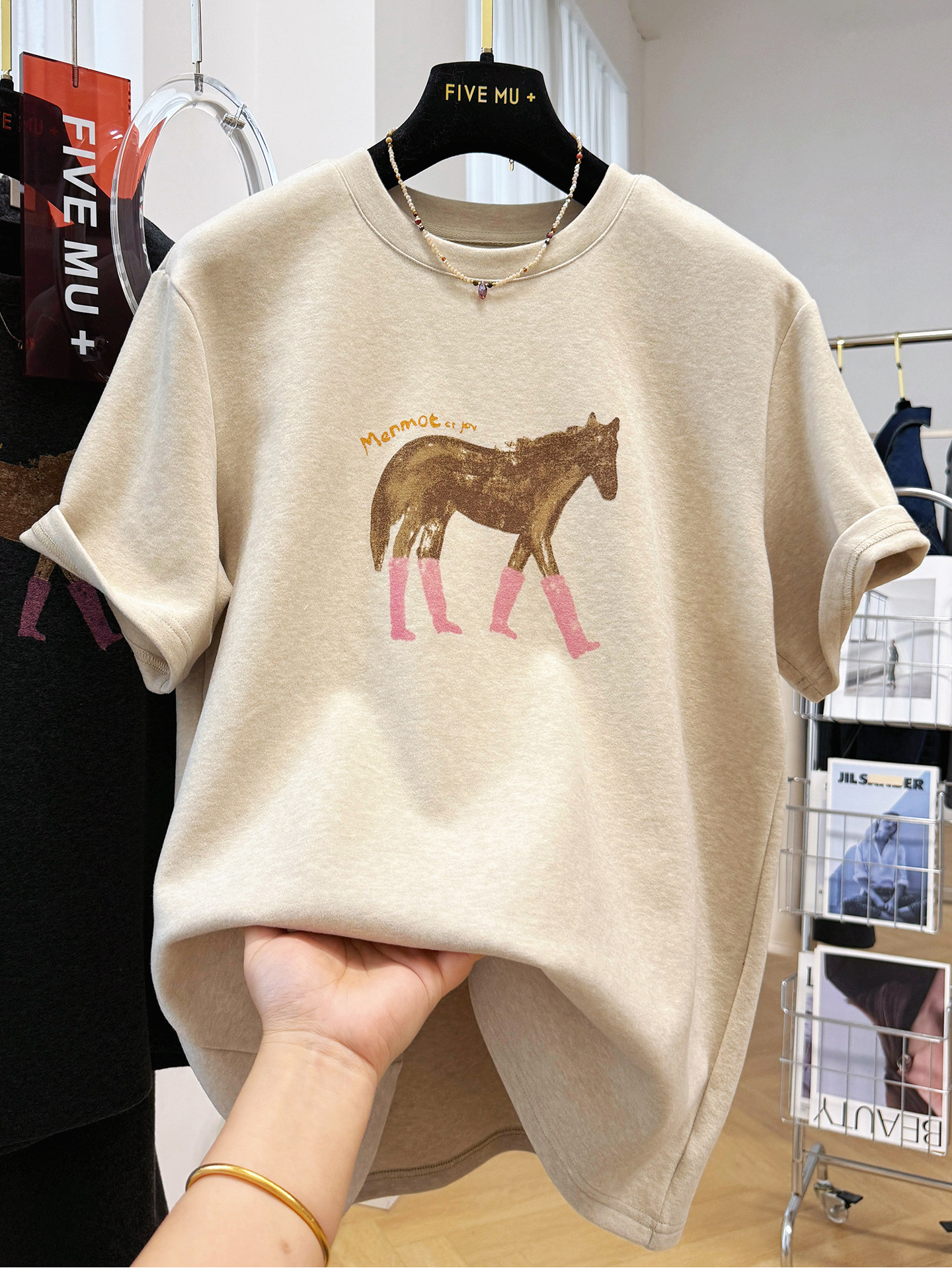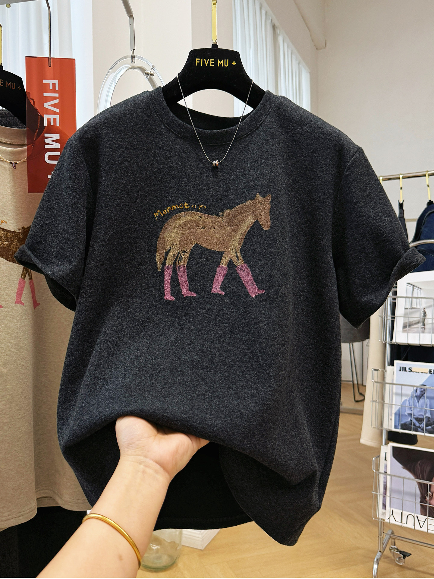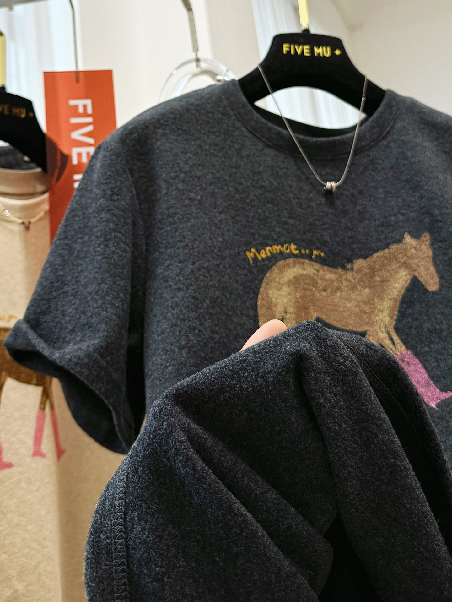 MY17575# 螺纹德绒大码300斤磨毛短袖T恤女卡通印花宽松半袖打底衫上衣女裝貨源服裝批發