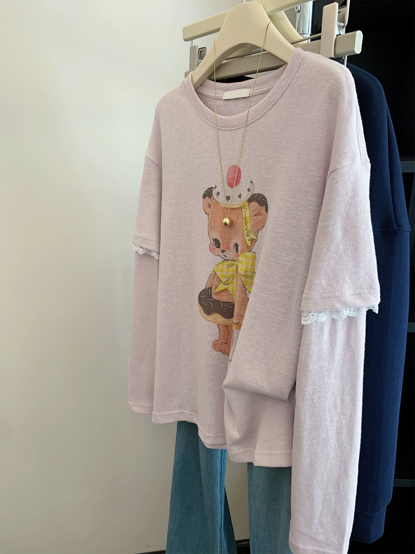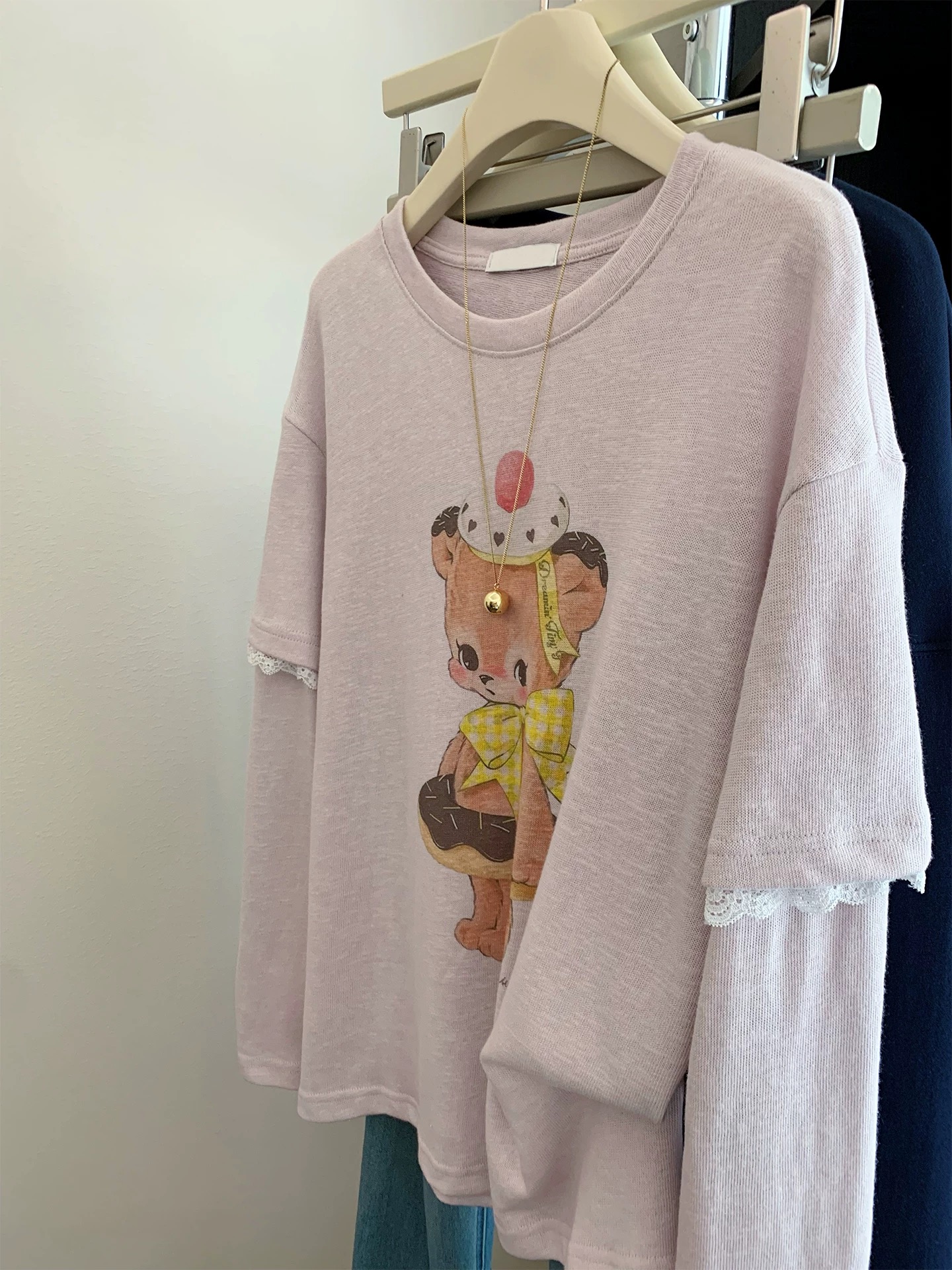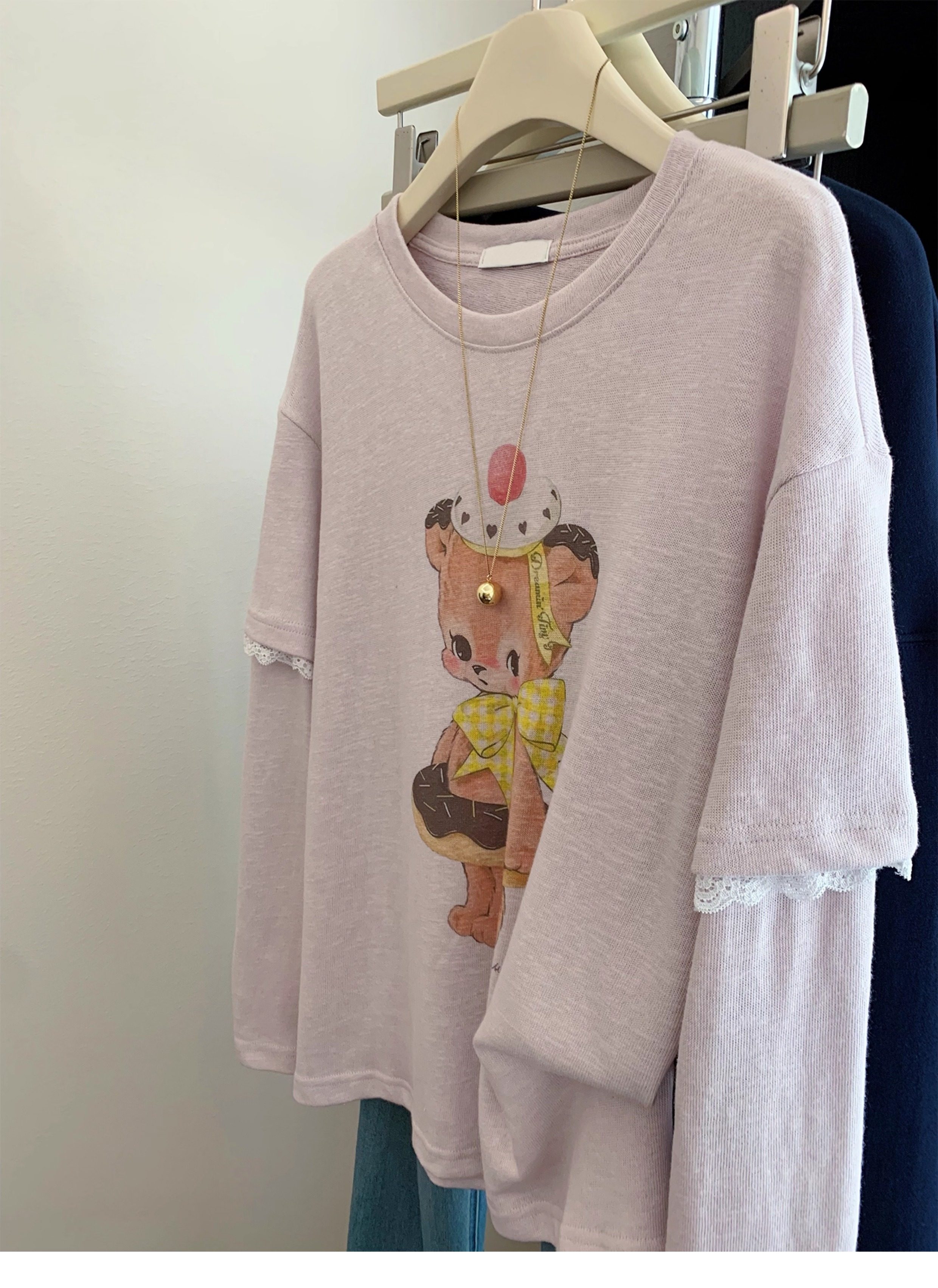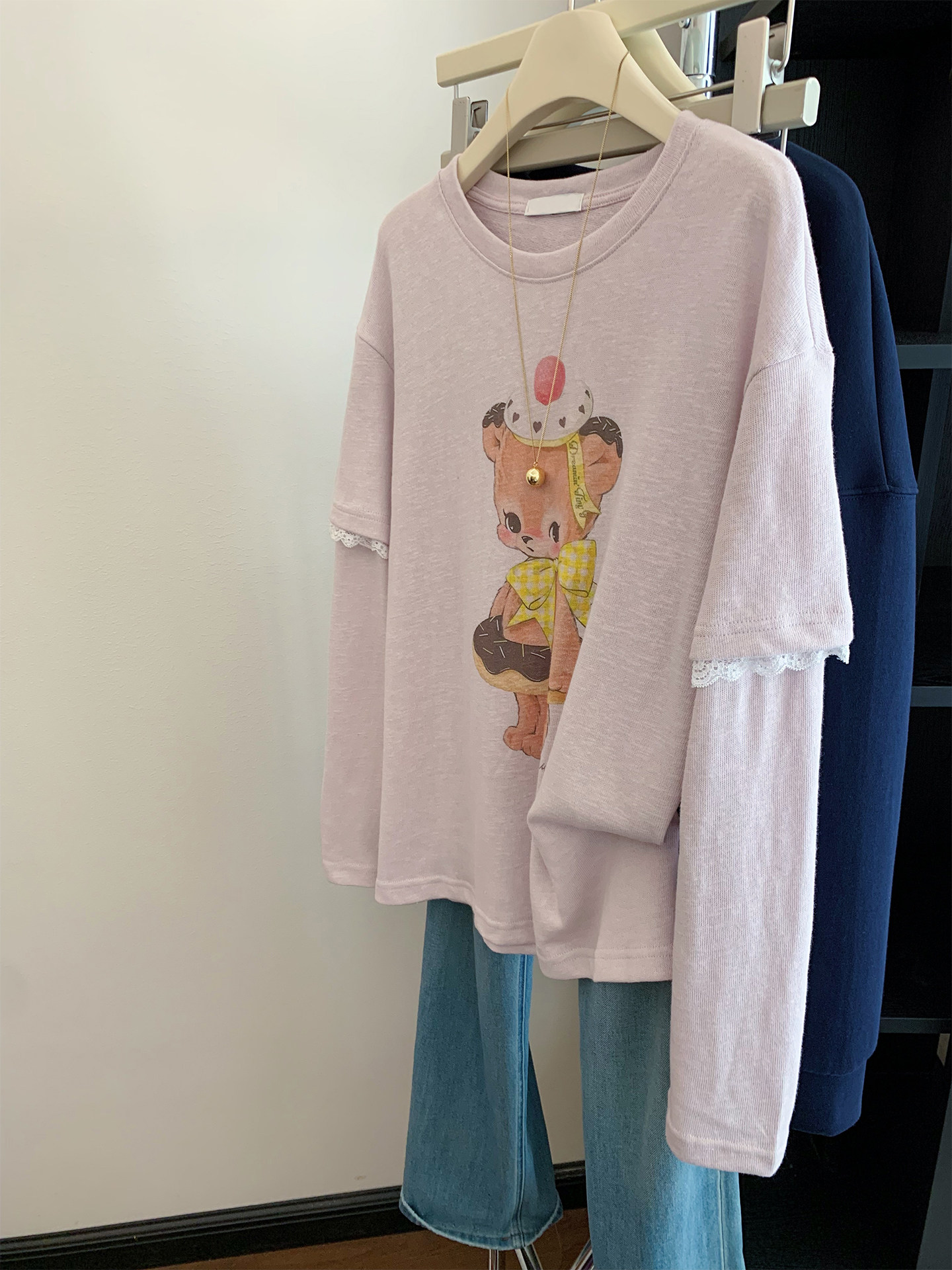 MY17578# 纯棉特大码300斤韩版百搭休闲粉色小熊印花蕾丝花边长袖t恤女上衣女裝貨源服裝批發