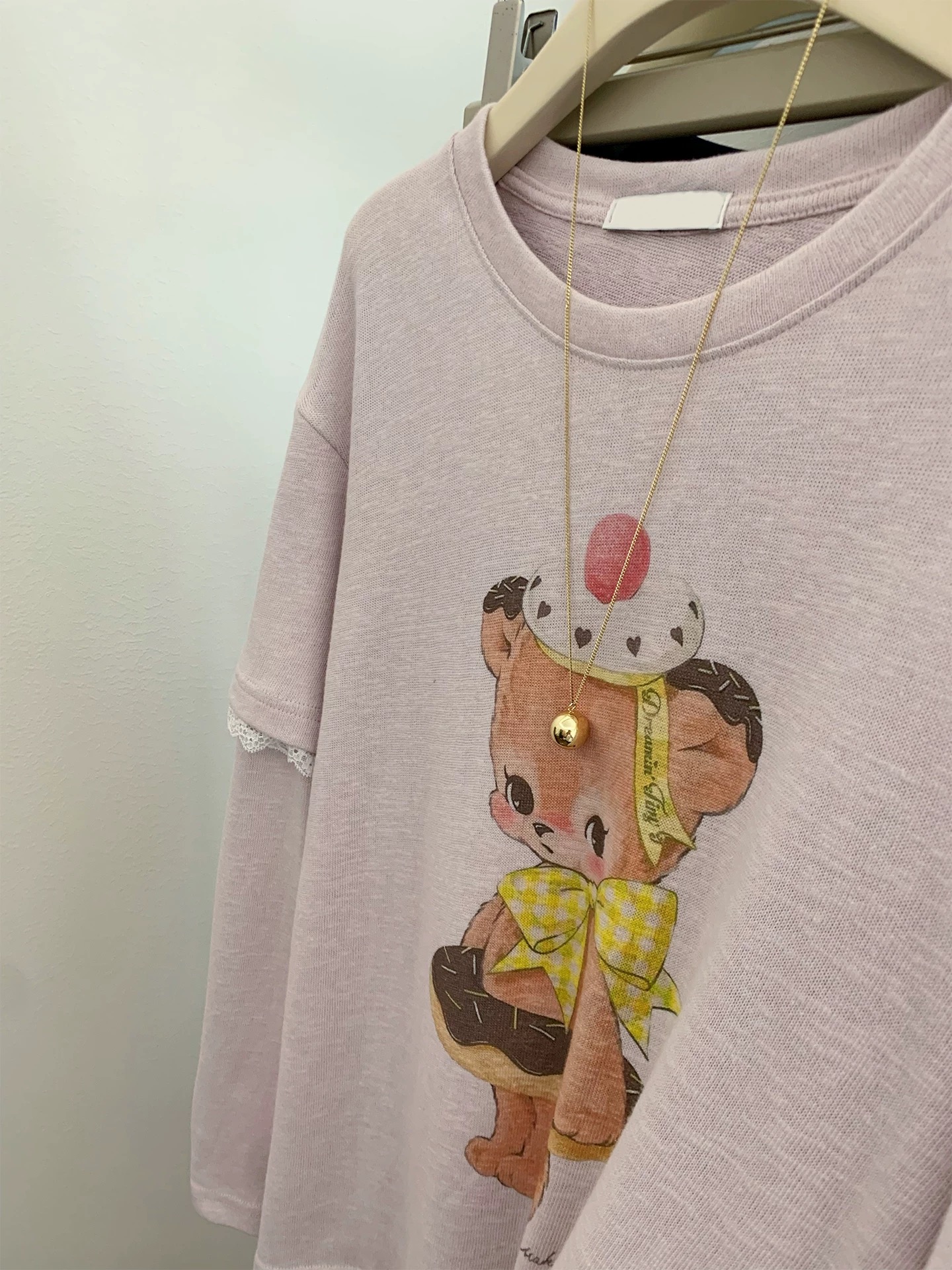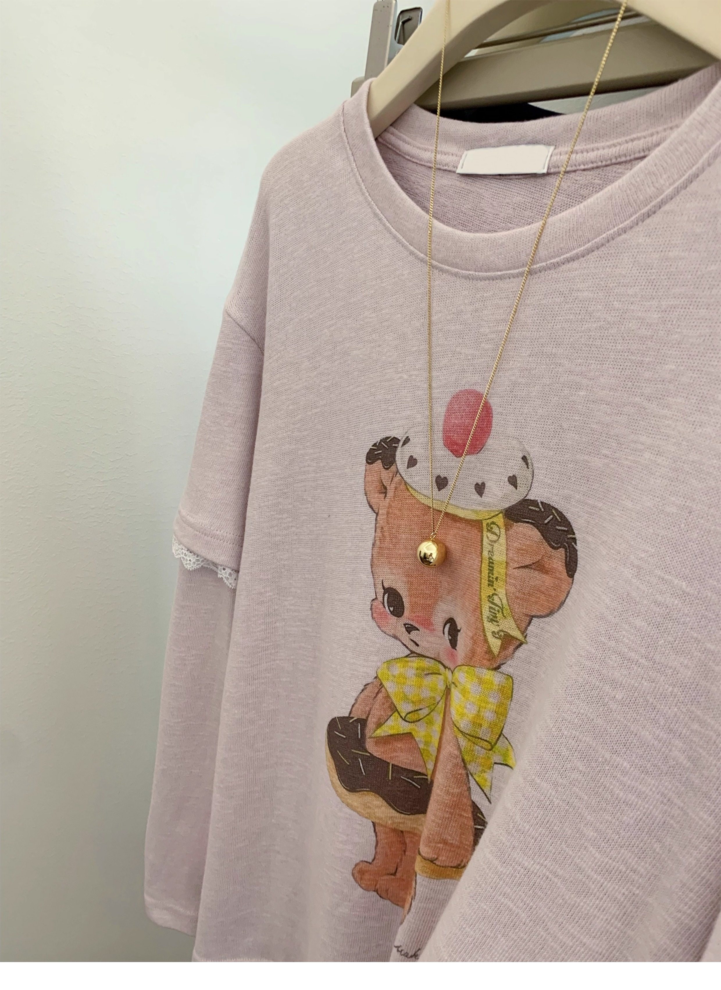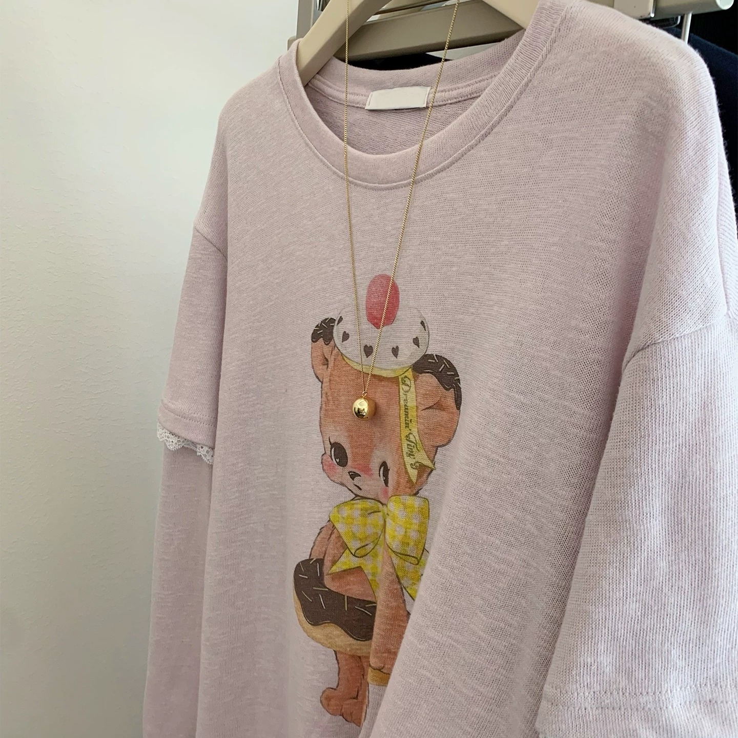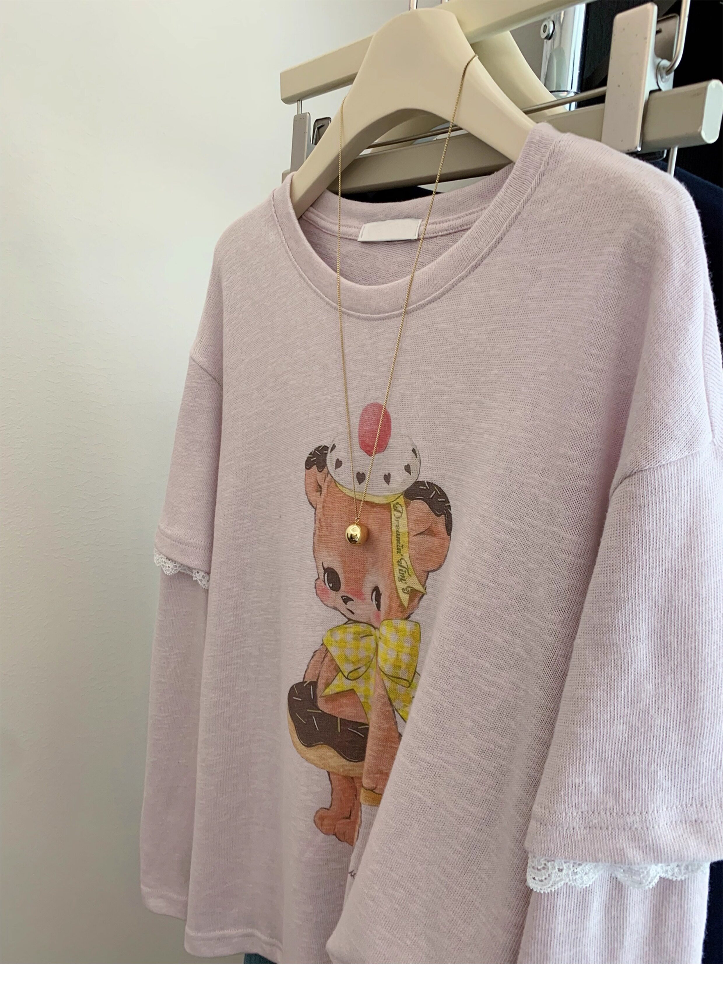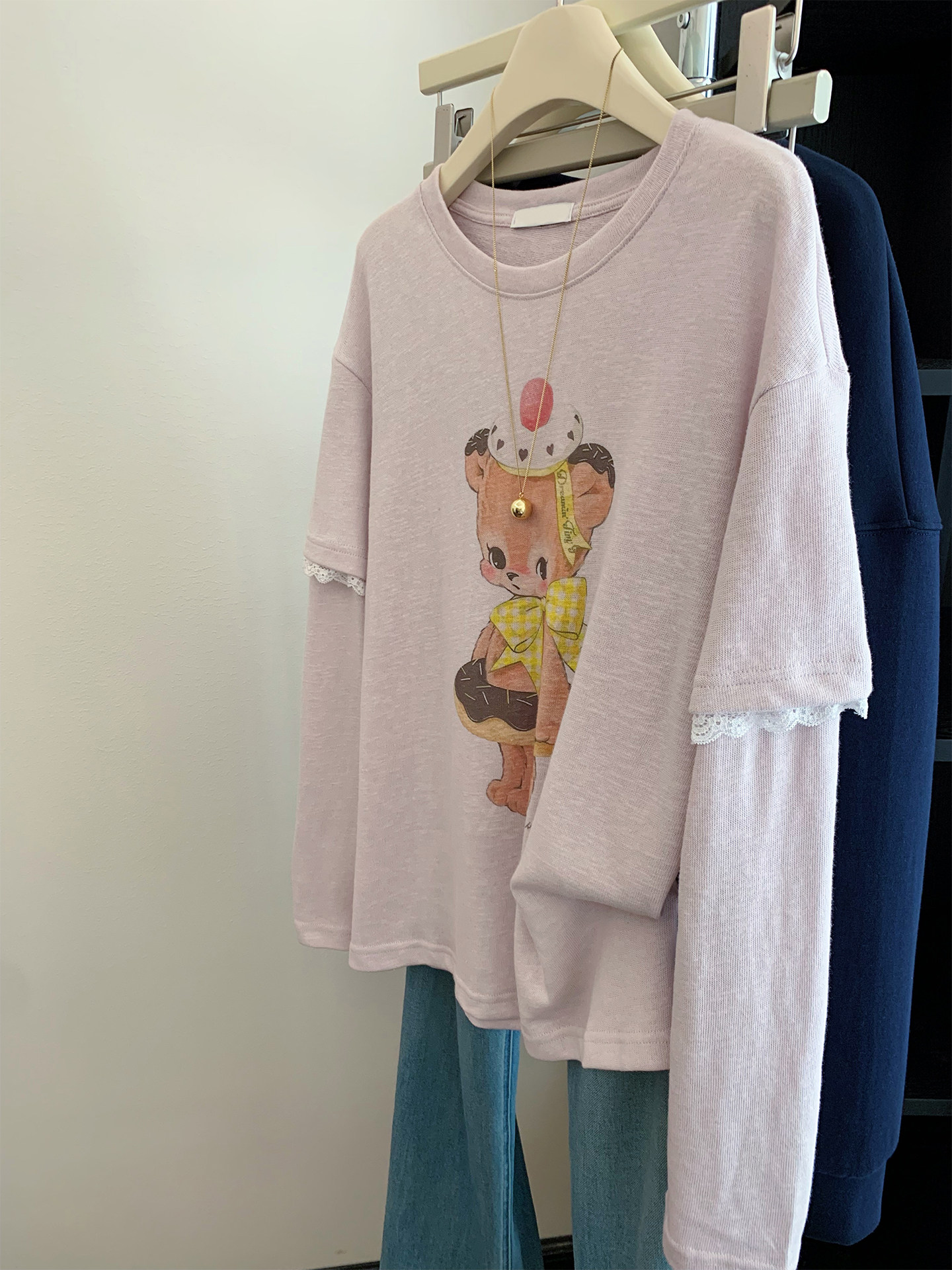 MY17578# 纯棉特大码300斤韩版百搭休闲粉色小熊印花蕾丝花边长袖t恤女上衣女裝貨源服裝批發