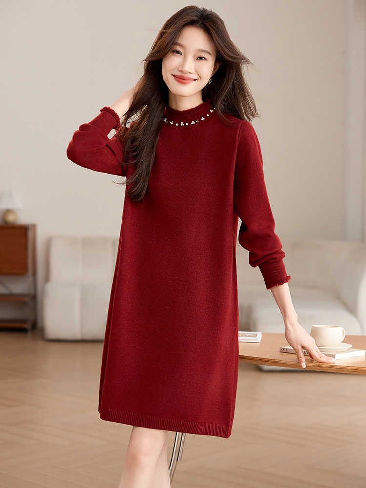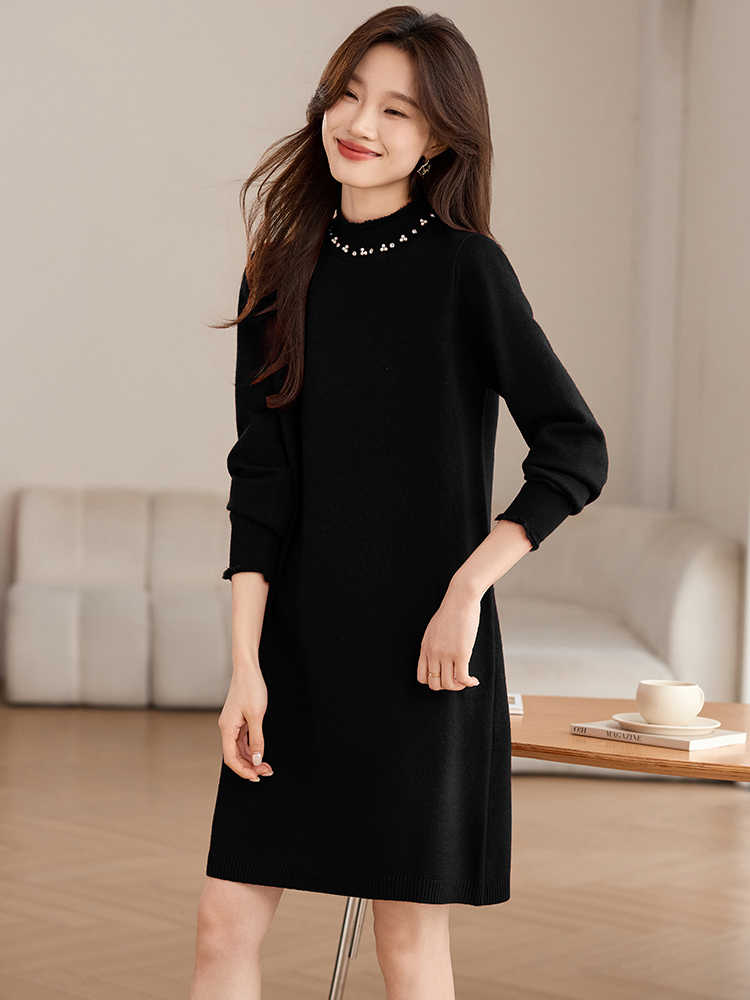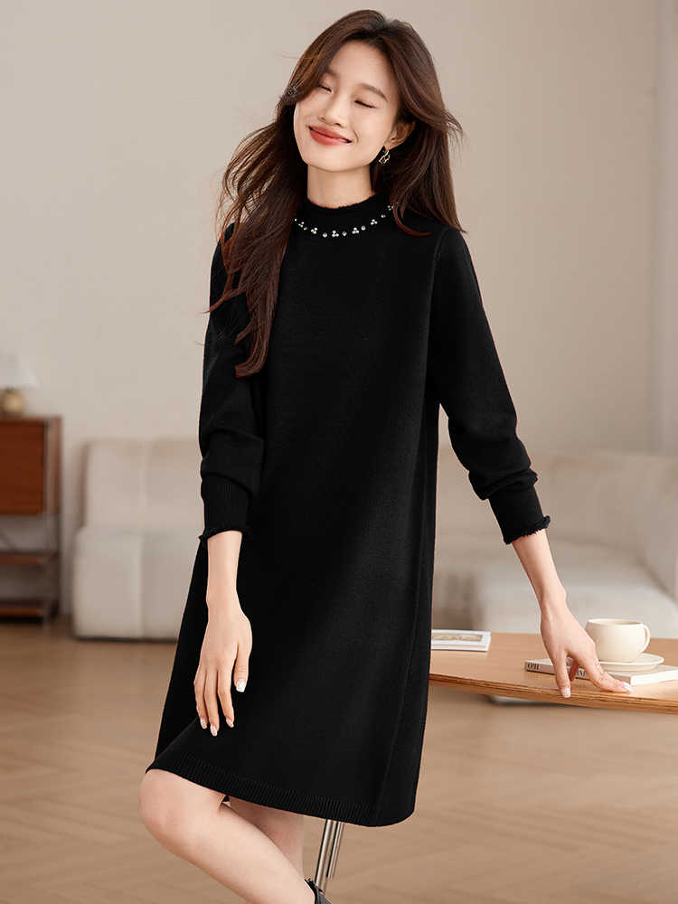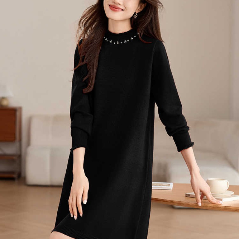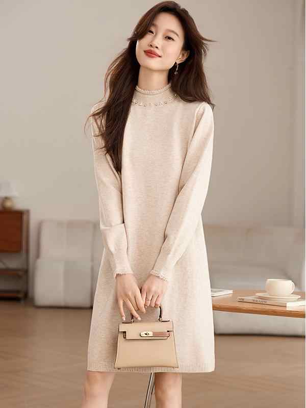 MY17579# 新款配大衣A字毛衣裙女半高领中长款打底毛衣针织纯色连衣裙女裝貨源服裝批發