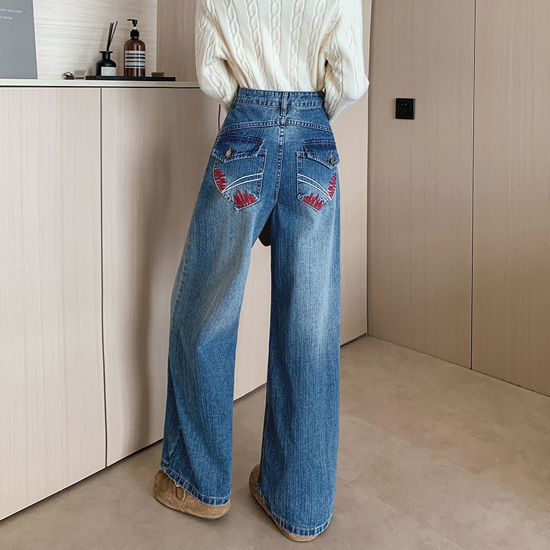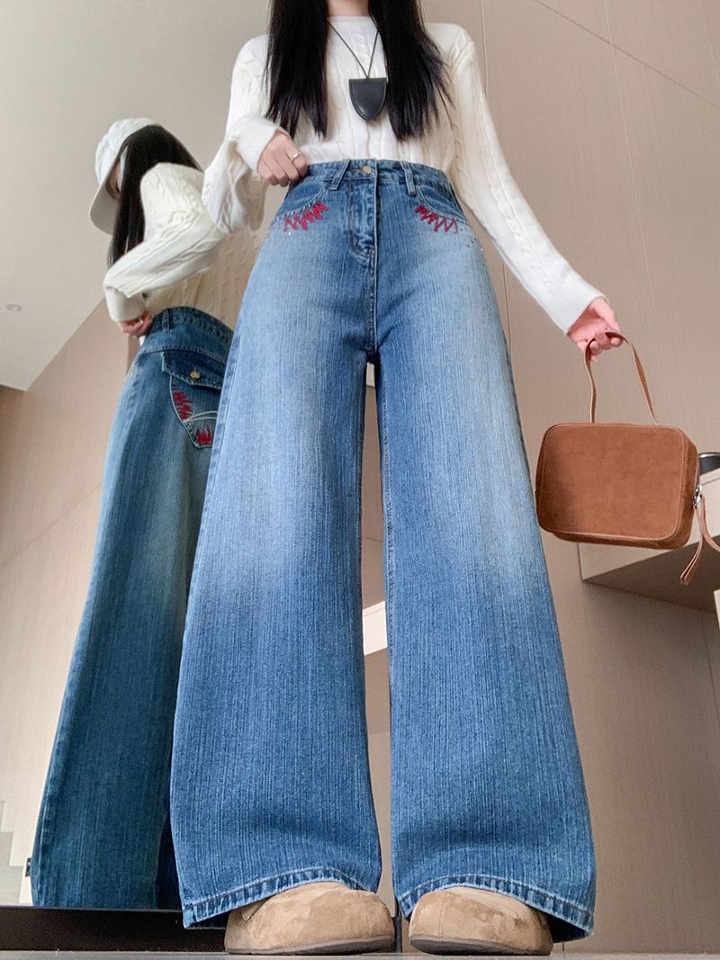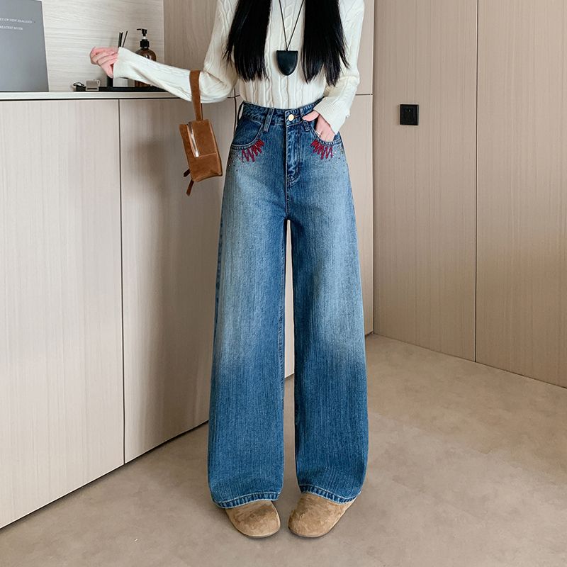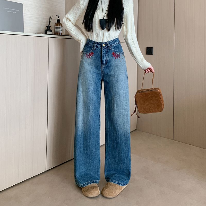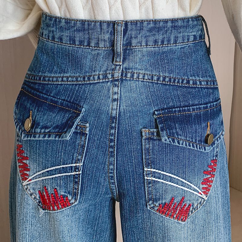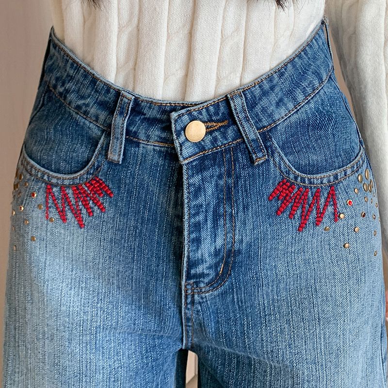 MY17581# 美式复古刺绣钉珠牛仔裤女新款重工水洗宽松显瘦直筒裤女裝貨源服裝批發