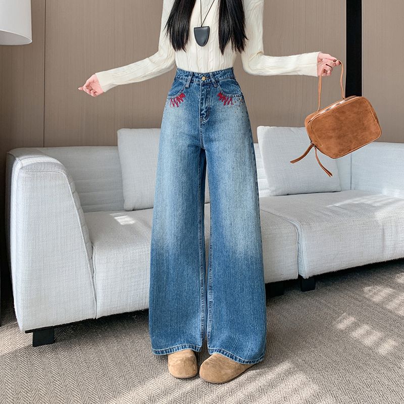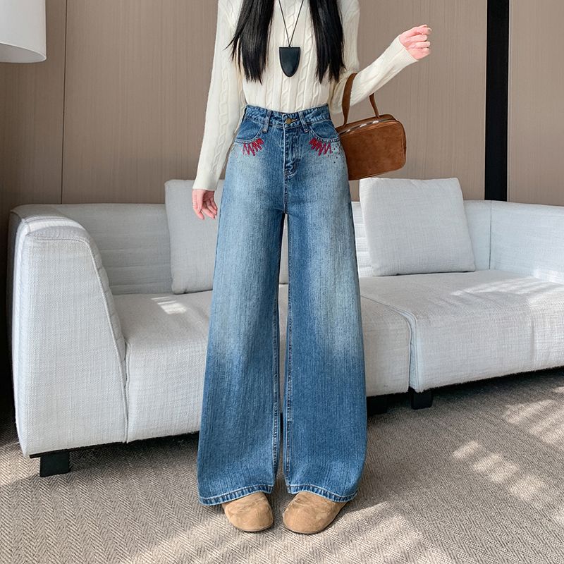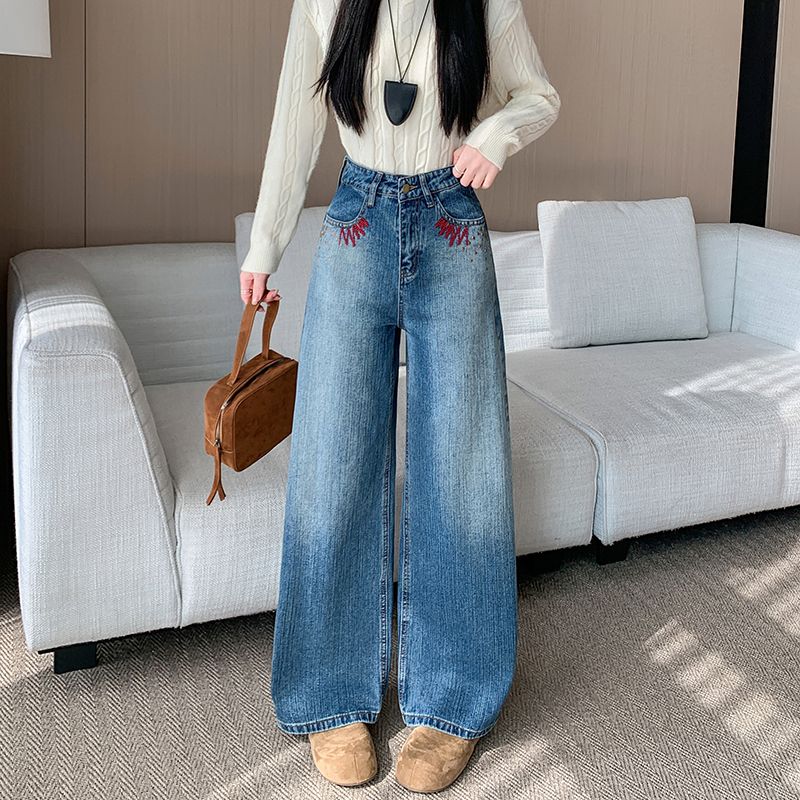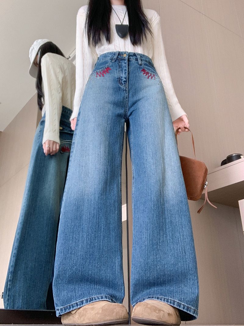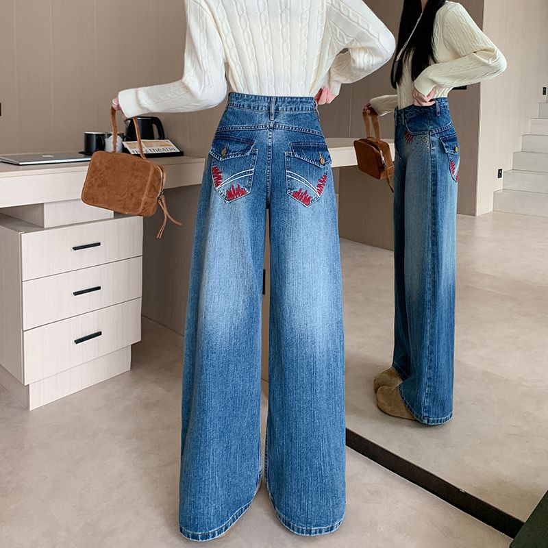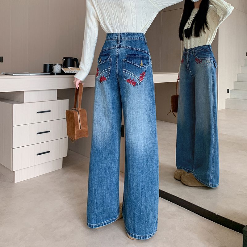 MY17581# 美式复古刺绣钉珠牛仔裤女新款重工水洗宽松显瘦直筒裤女裝貨源服裝批發