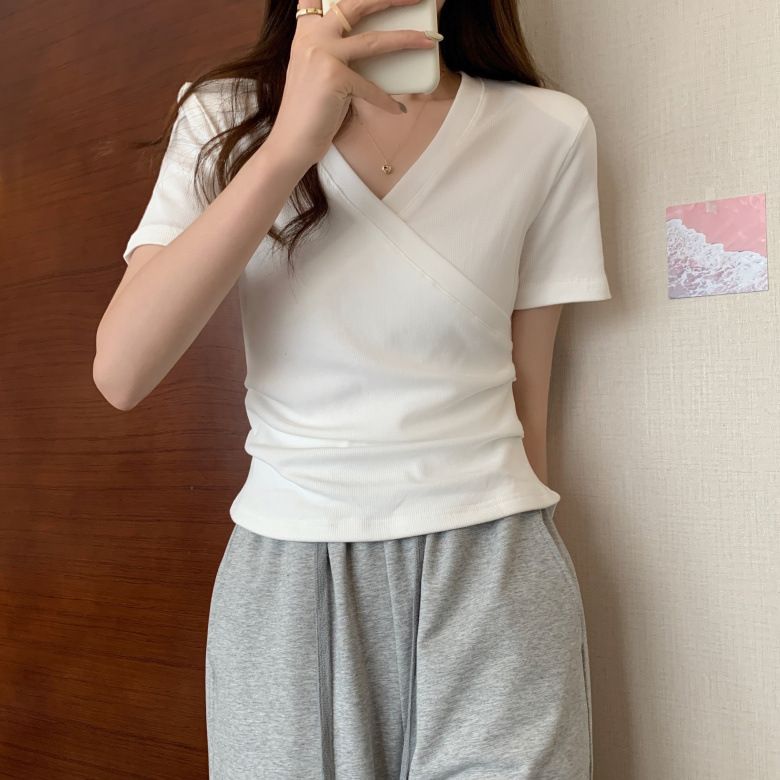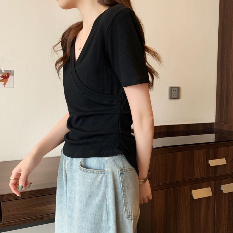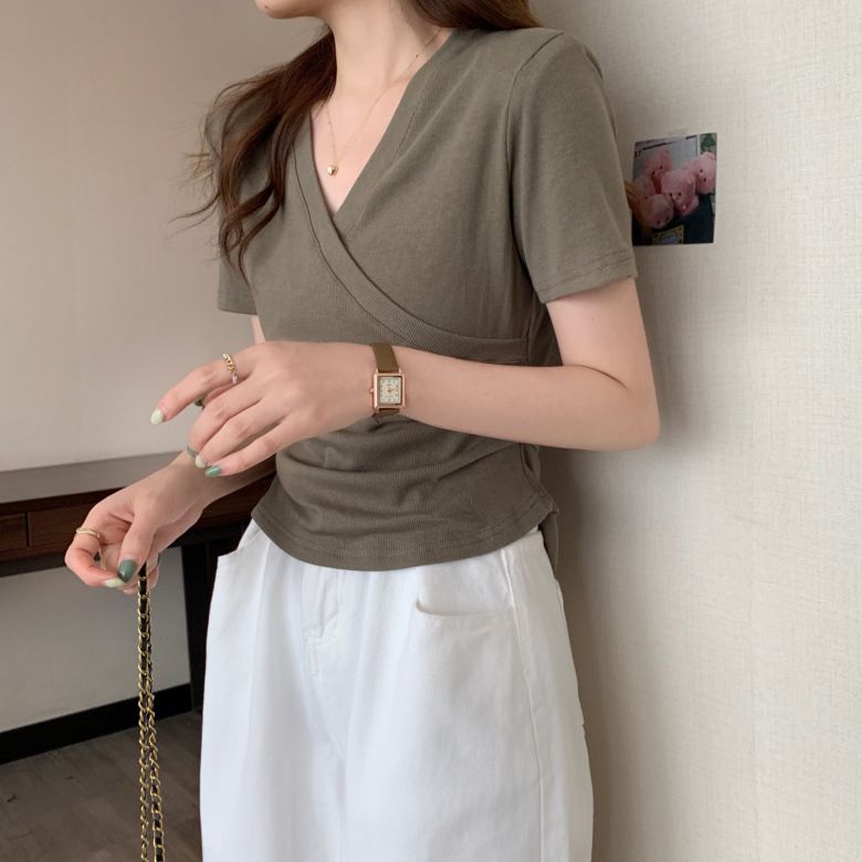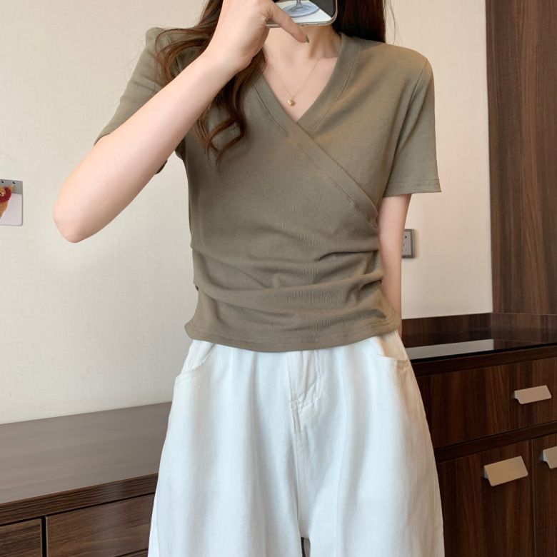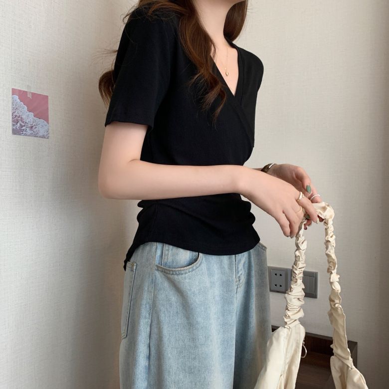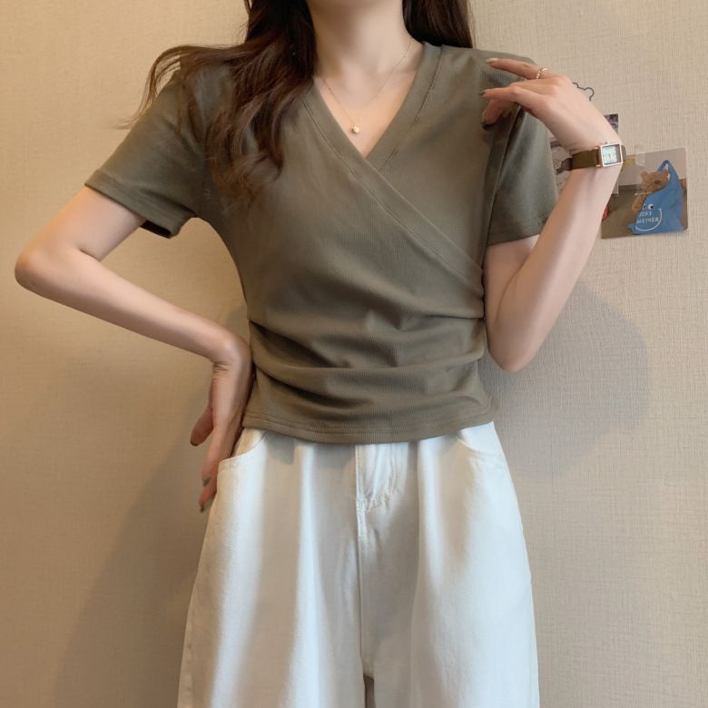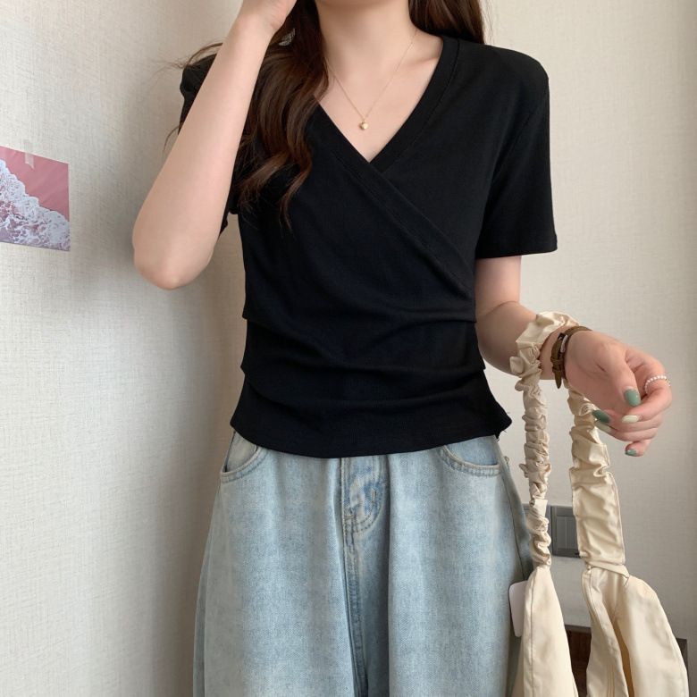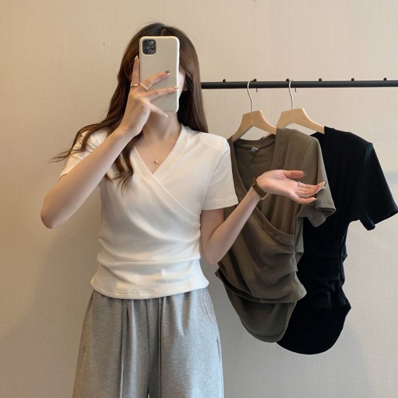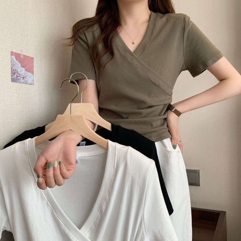MY17583# 微胖设计感短袖T恤女夏新款韩版交叉V领小众辣妹修身百搭上衣女裝貨源服裝批發