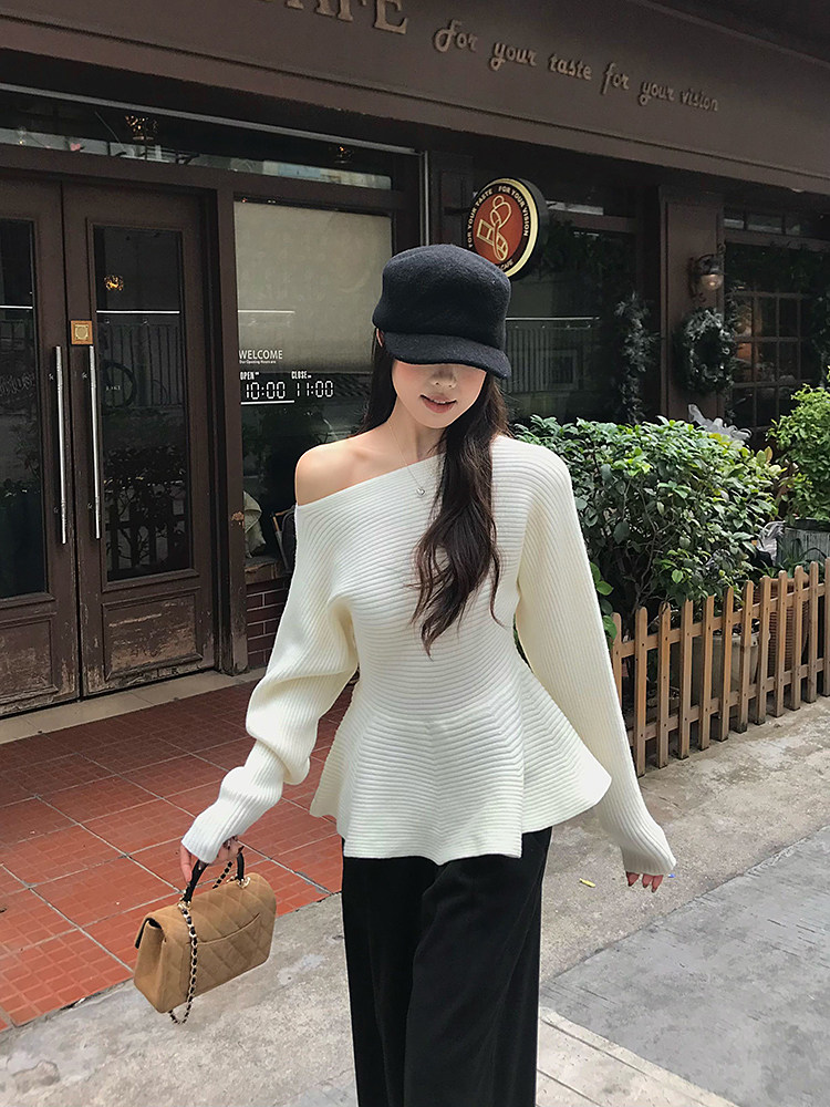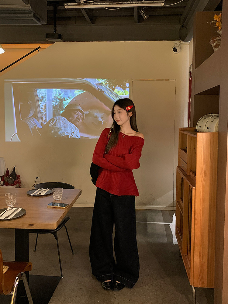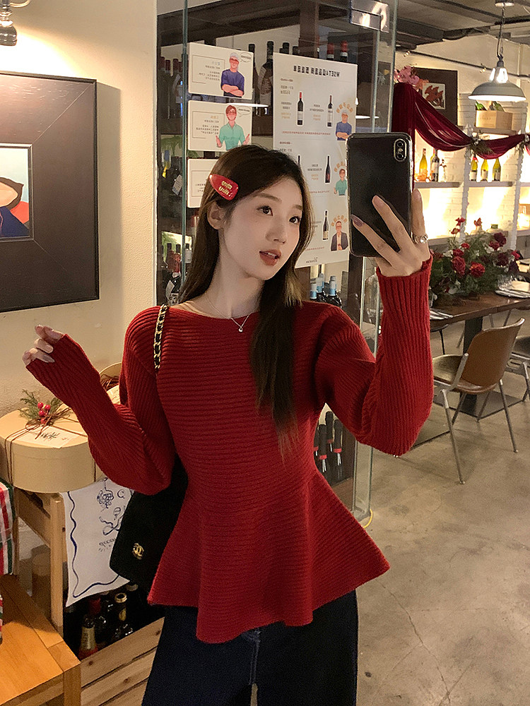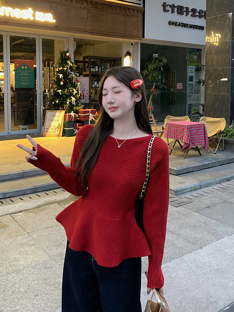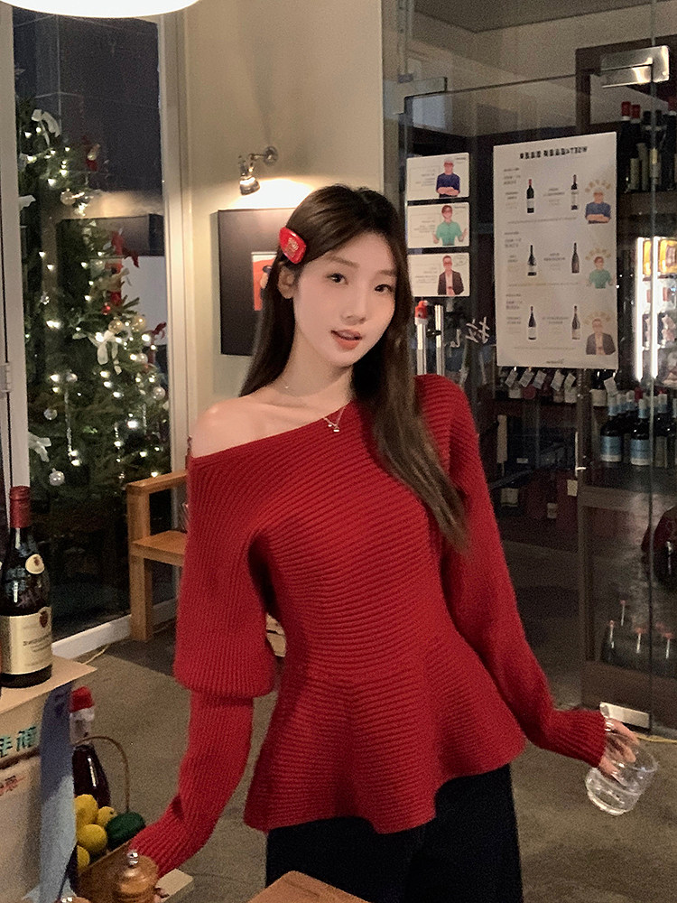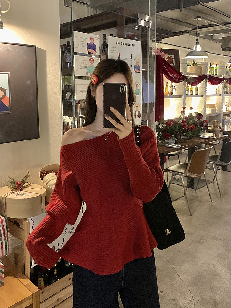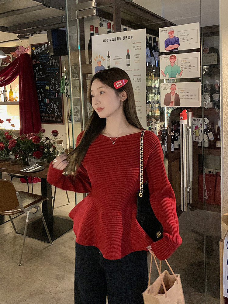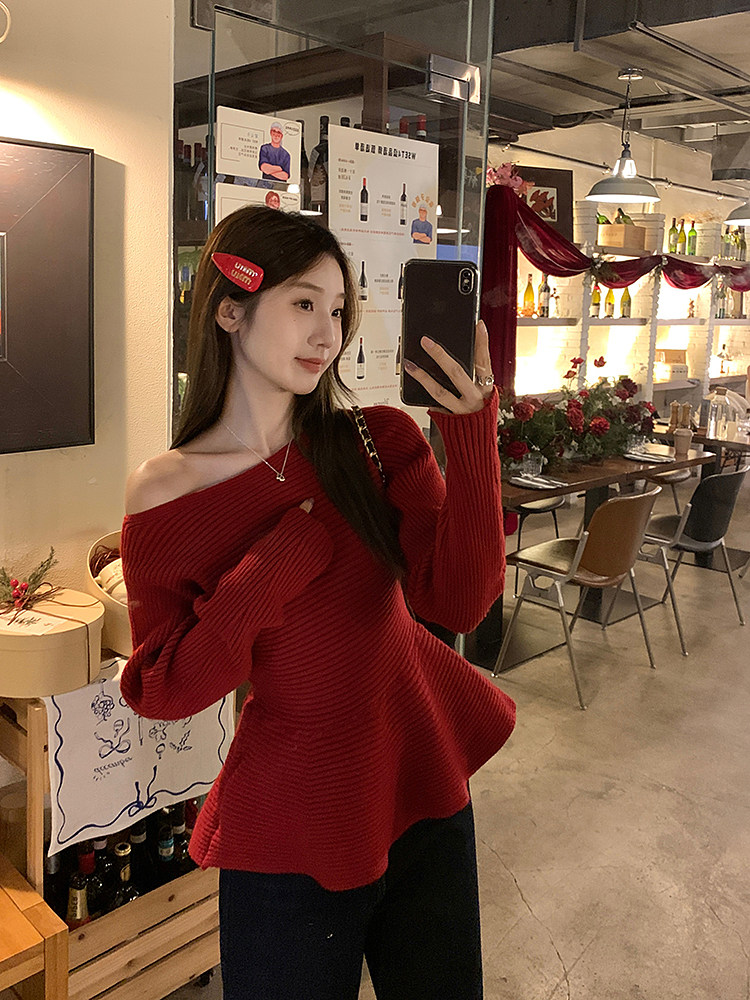MY17587# 红色荷叶边下摆斜肩长袖针织衫温柔风气质收腰显瘦上衣女裝貨源服裝批發