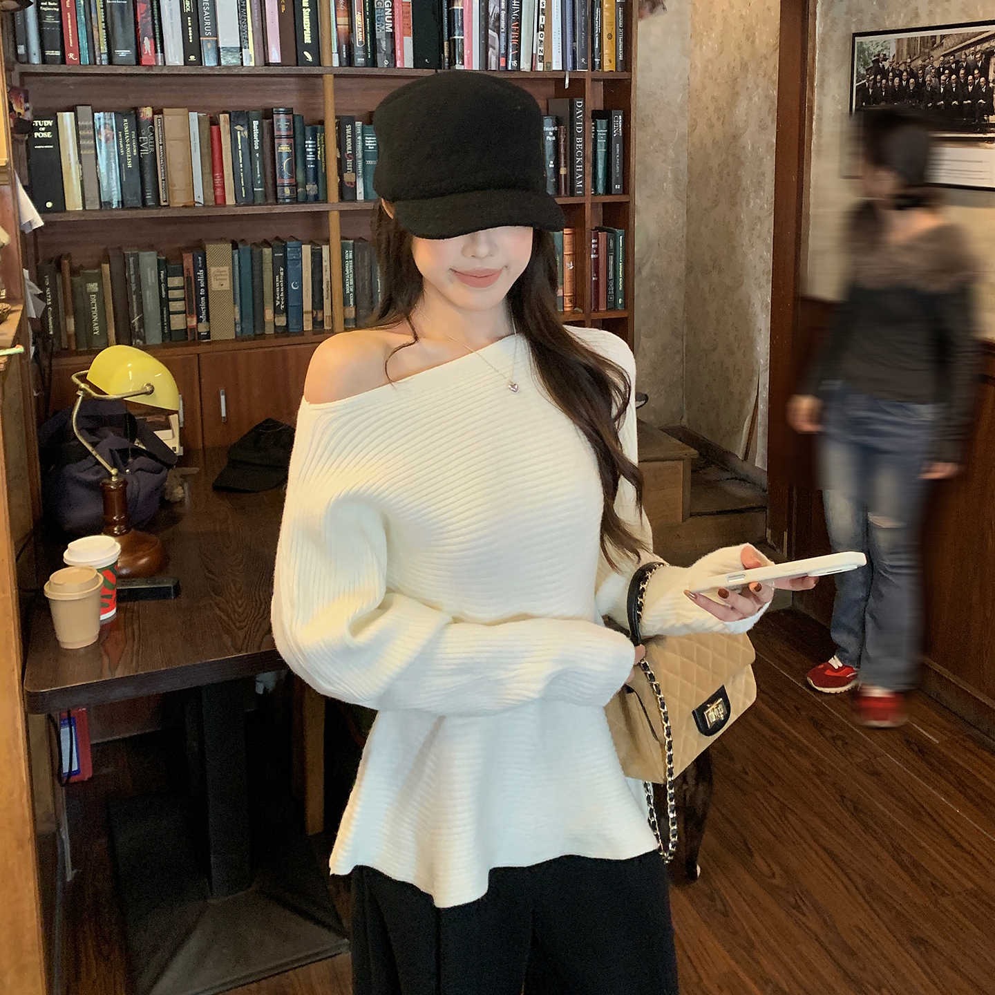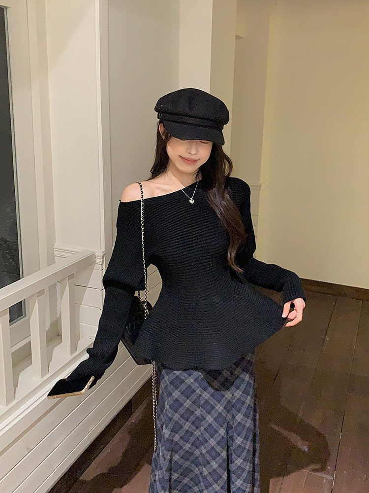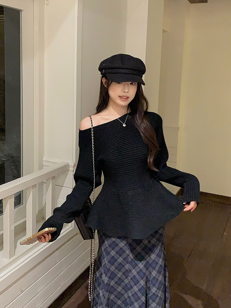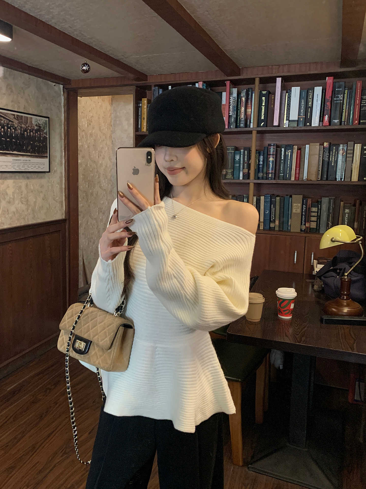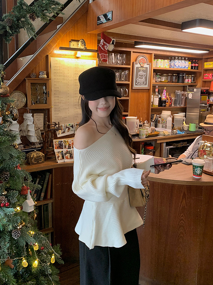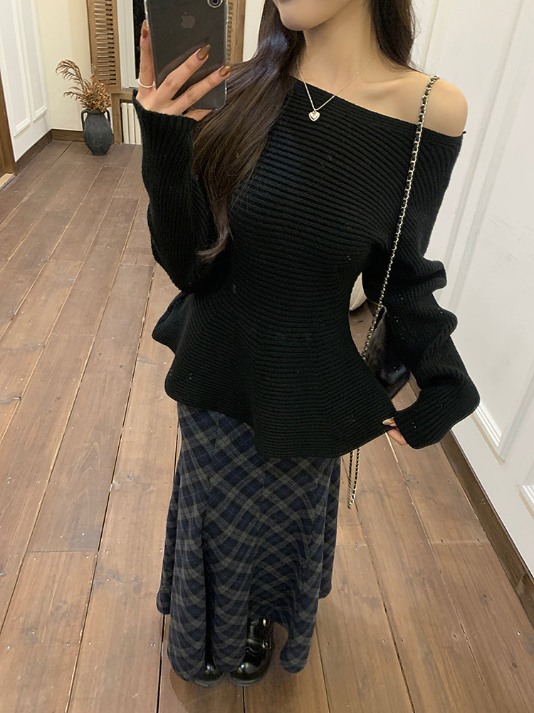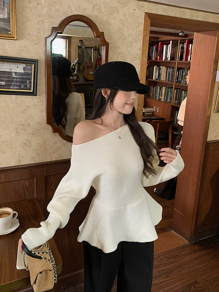 MY17587# 红色荷叶边下摆斜肩长袖针织衫温柔风气质收腰显瘦上衣女裝貨源服裝批發
