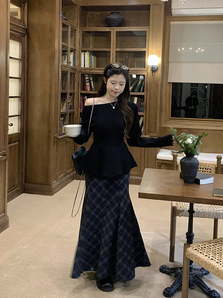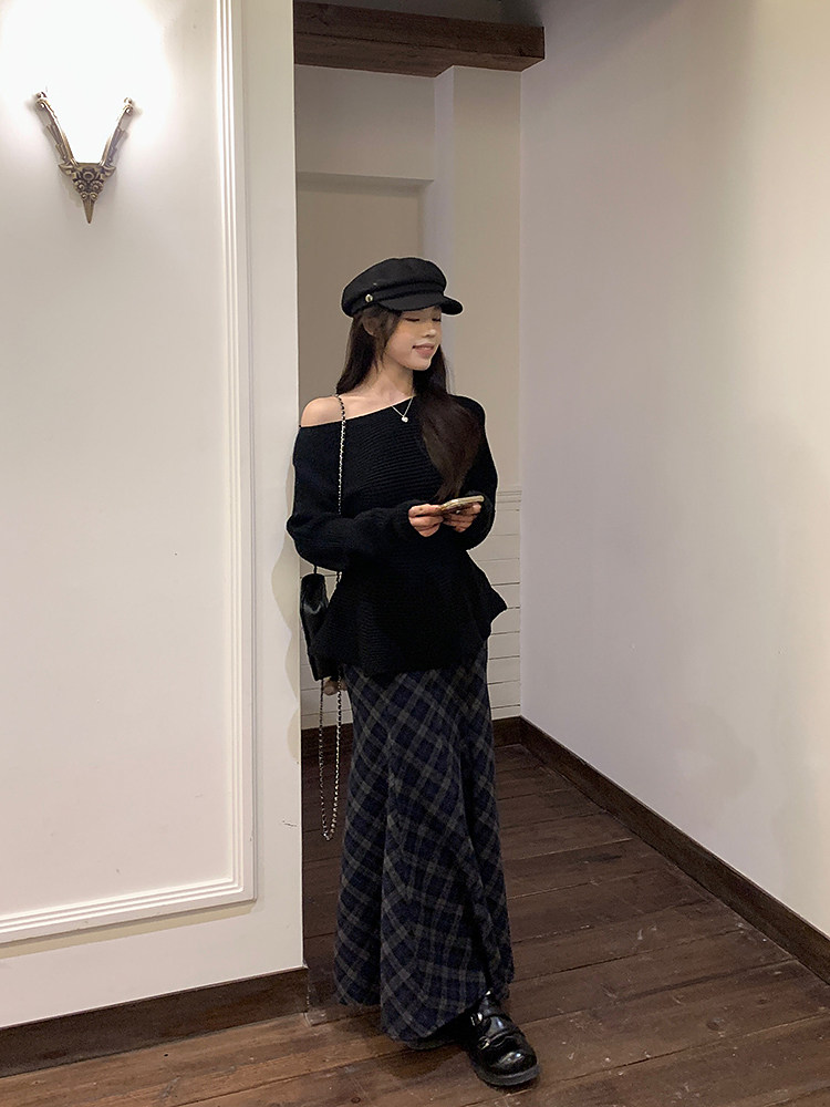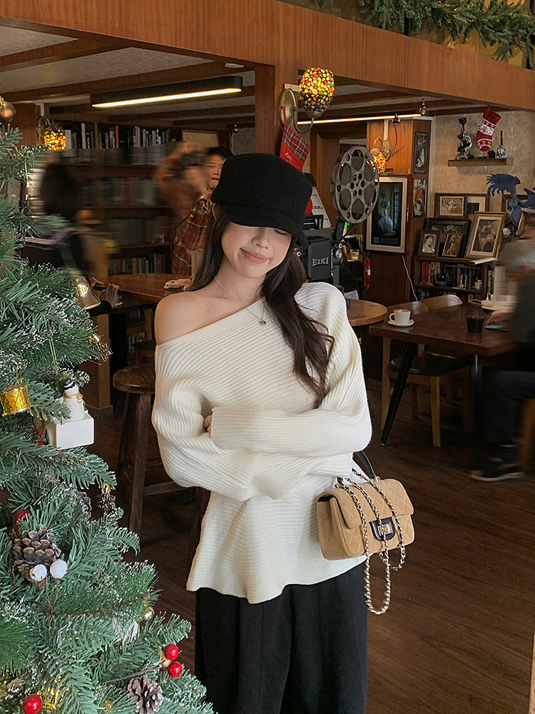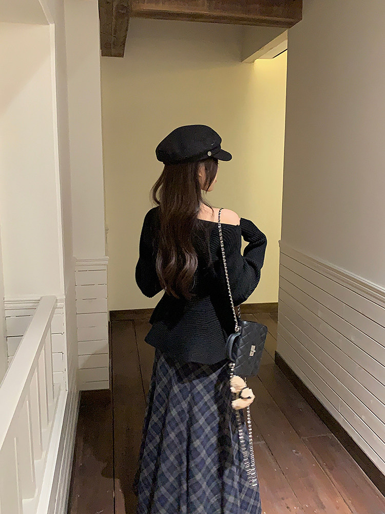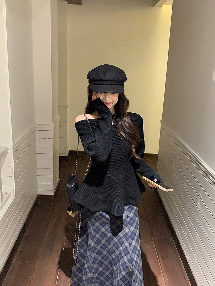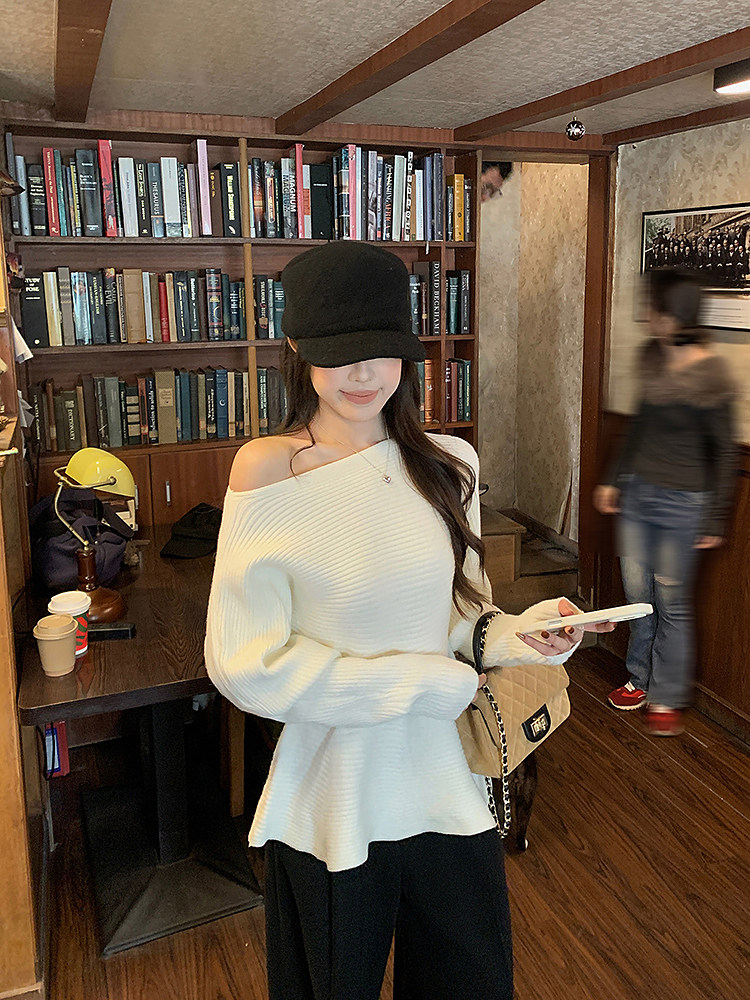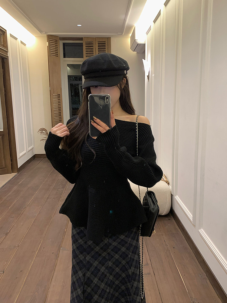 MY17587# 红色荷叶边下摆斜肩长袖针织衫温柔风气质收腰显瘦上衣女裝貨源服裝批發