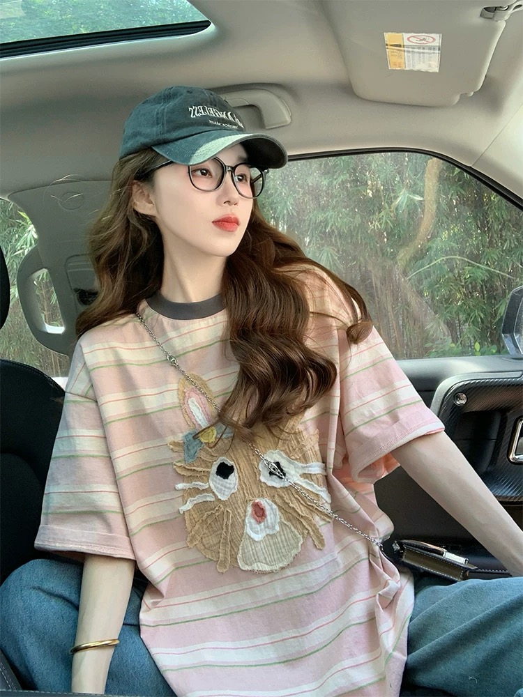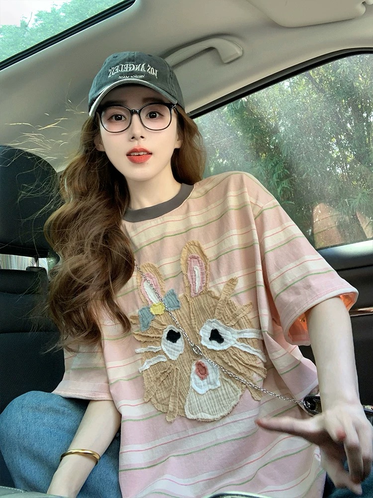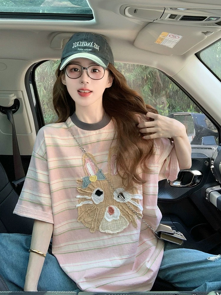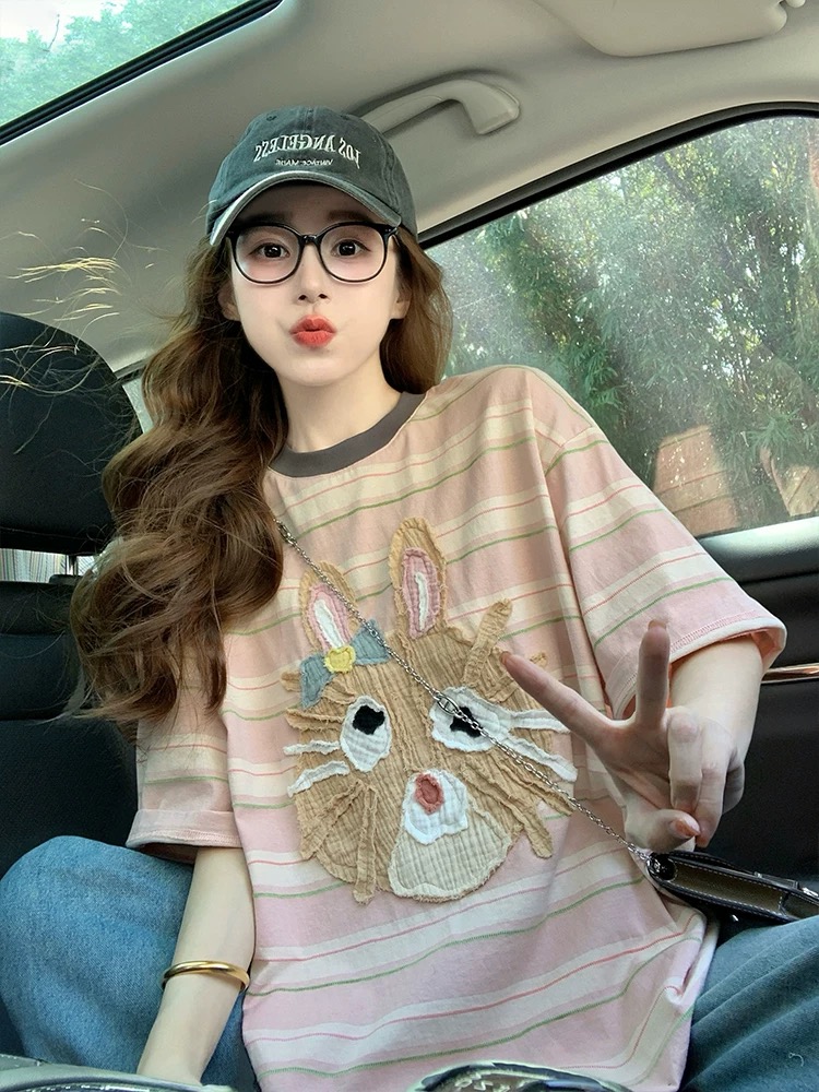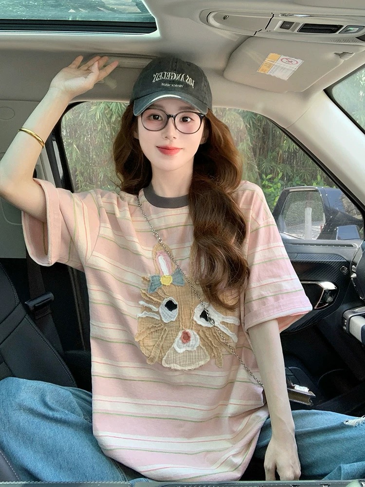 MY17590# 粉色条纹短袖t恤新款夏季卡通减龄设计感宽松上衣女裝貨源服裝批發