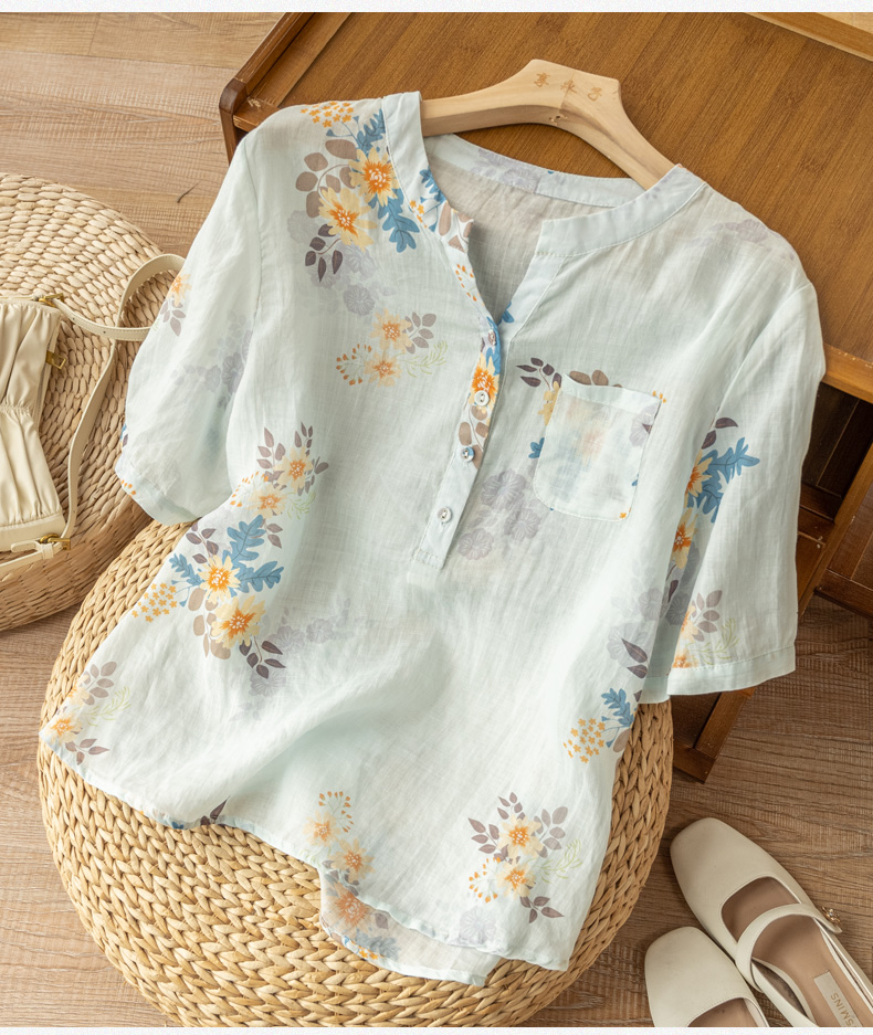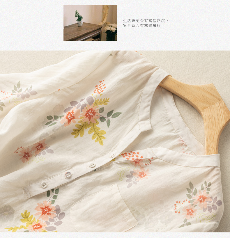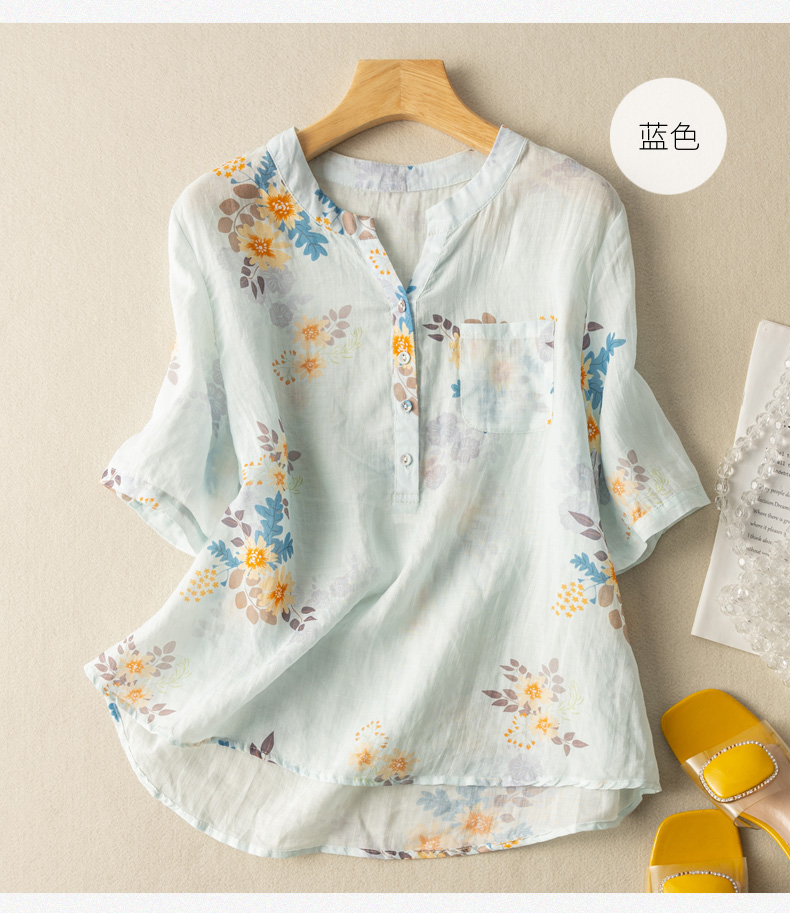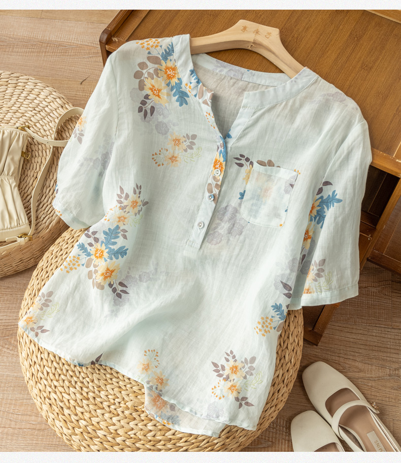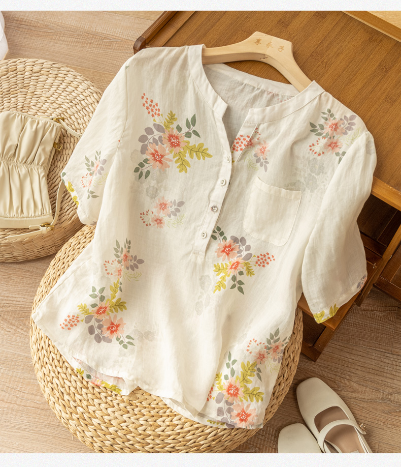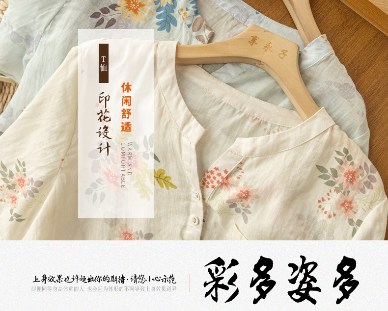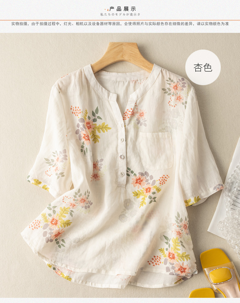 MY17597# 新款复古印花棉麻短袖衬衫夏季气质显瘦亚麻女士上衣女裝貨源服裝批發