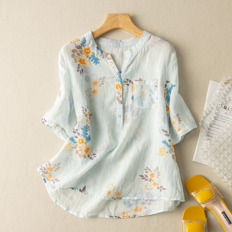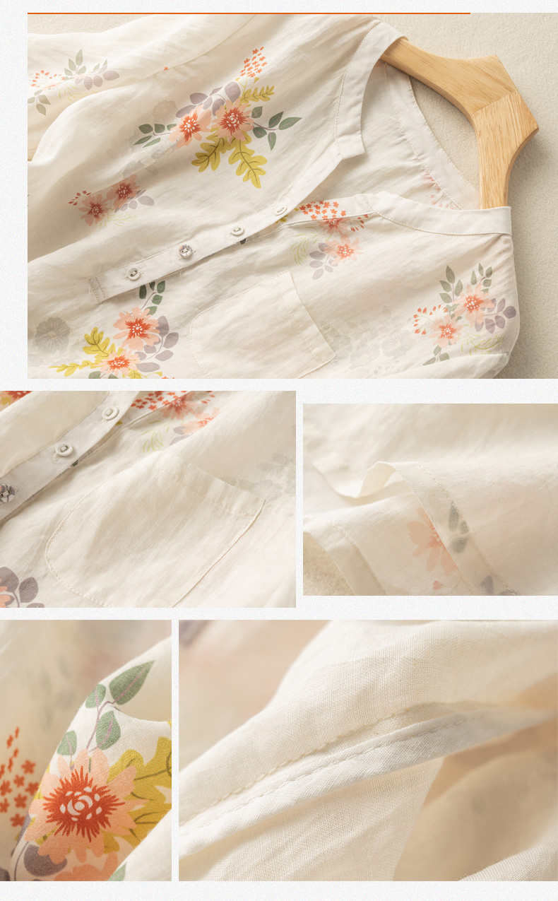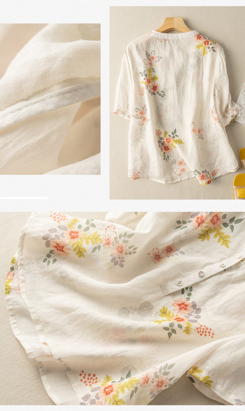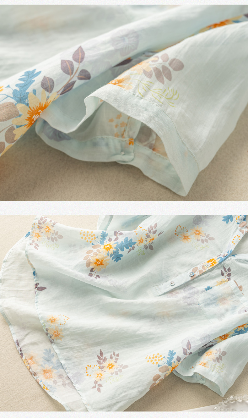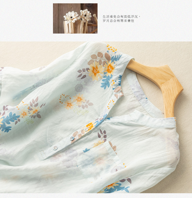 MY17597# 新款复古印花棉麻短袖衬衫夏季气质显瘦亚麻女士上衣女裝貨源服裝批發
