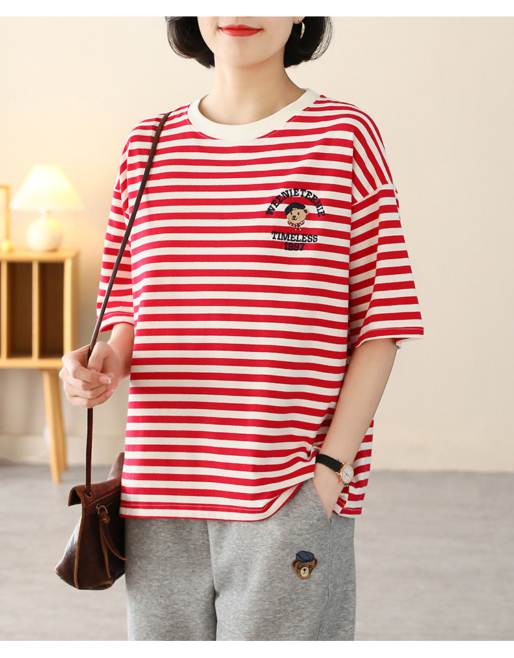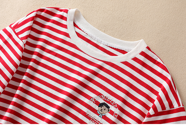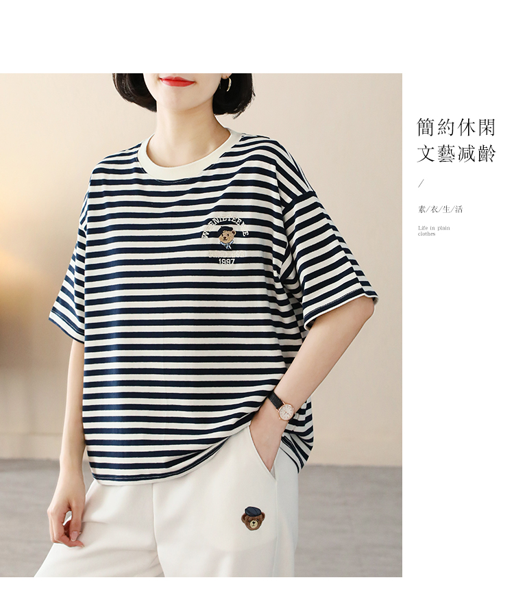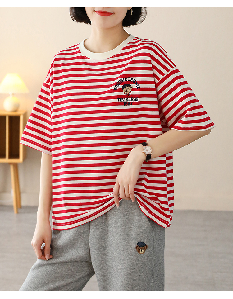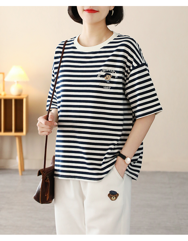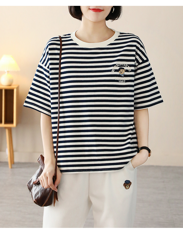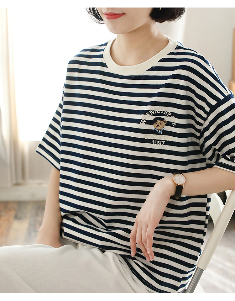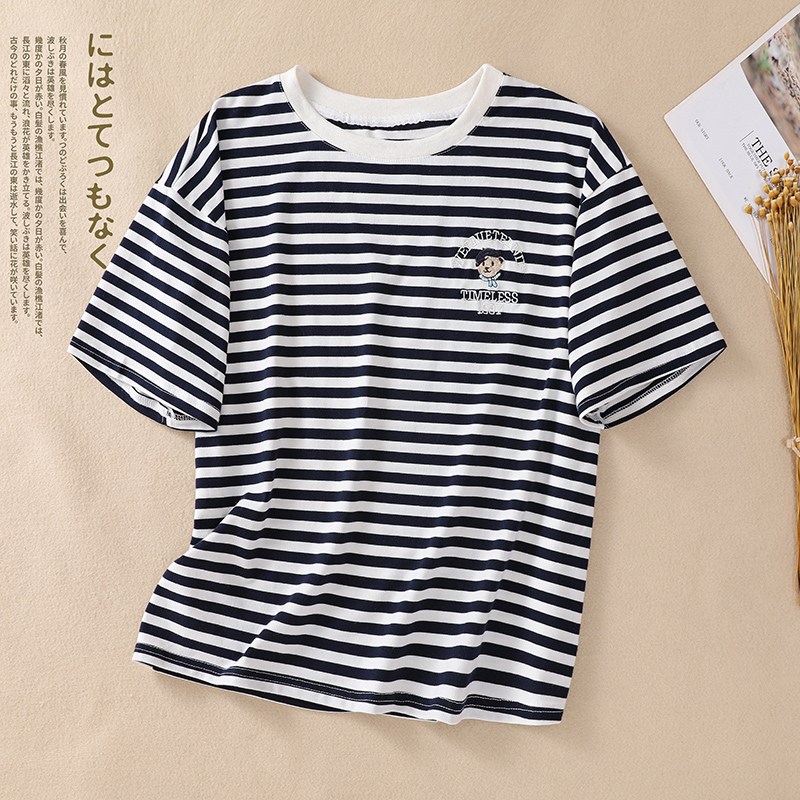 MY17598# 条纹T恤女小熊刺绣韩版宽松显瘦圆领大码纯棉夏季短袖女裝貨源服裝批發