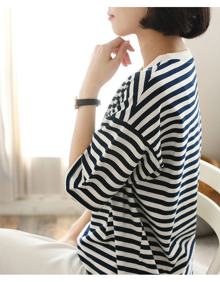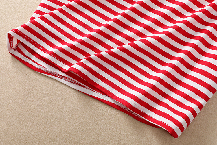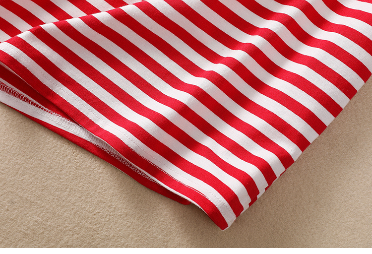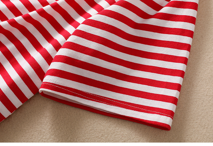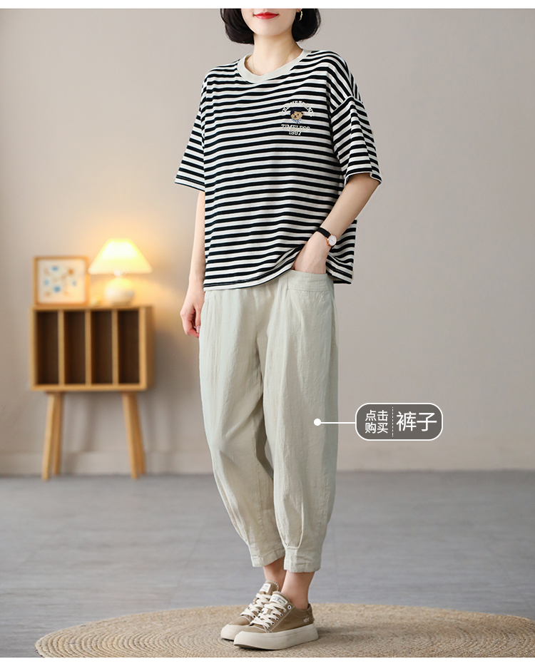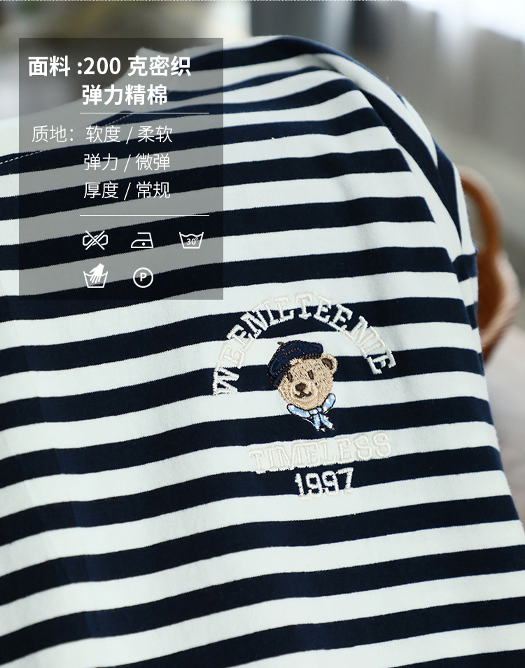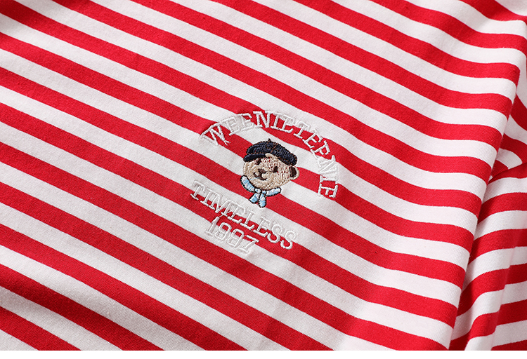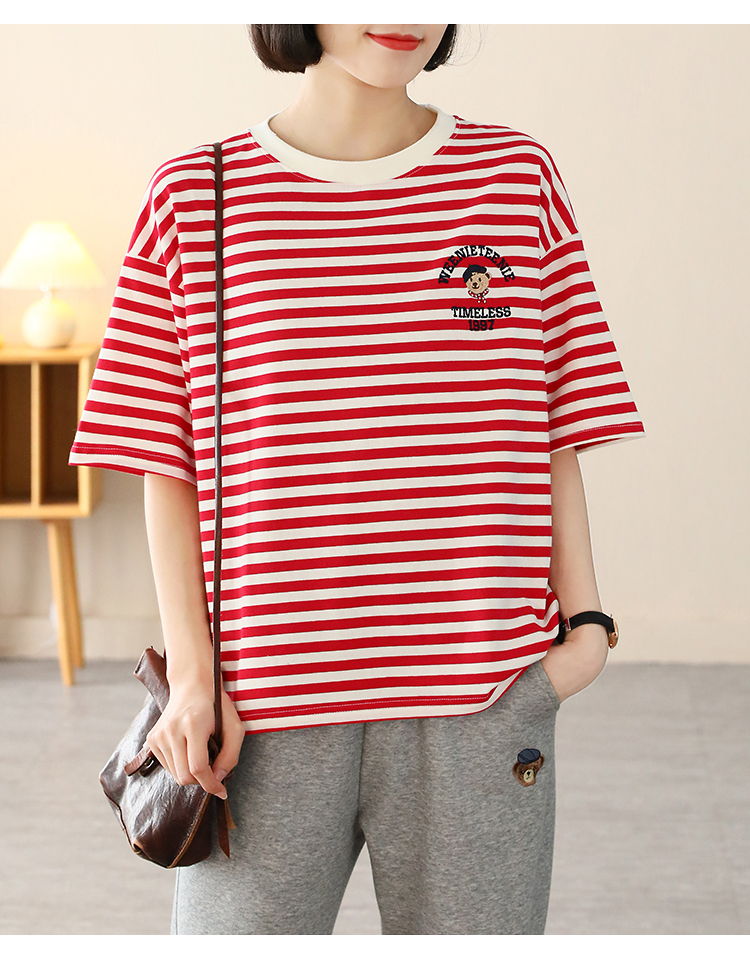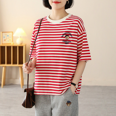 MY17598# 条纹T恤女小熊刺绣韩版宽松显瘦圆领大码纯棉夏季短袖女裝貨源服裝批發