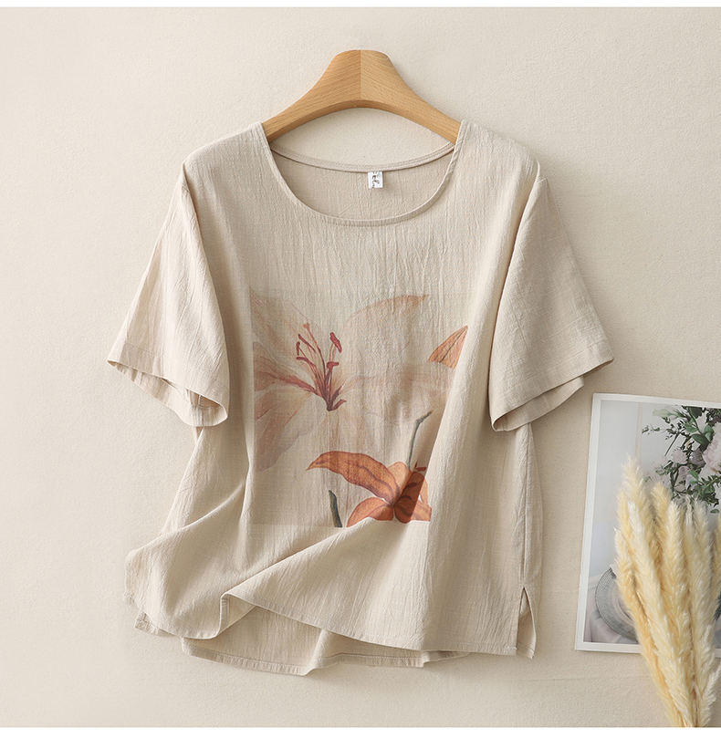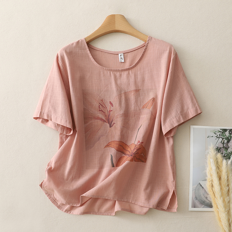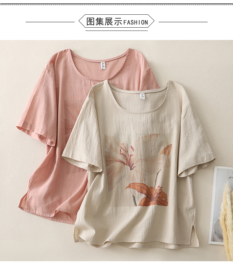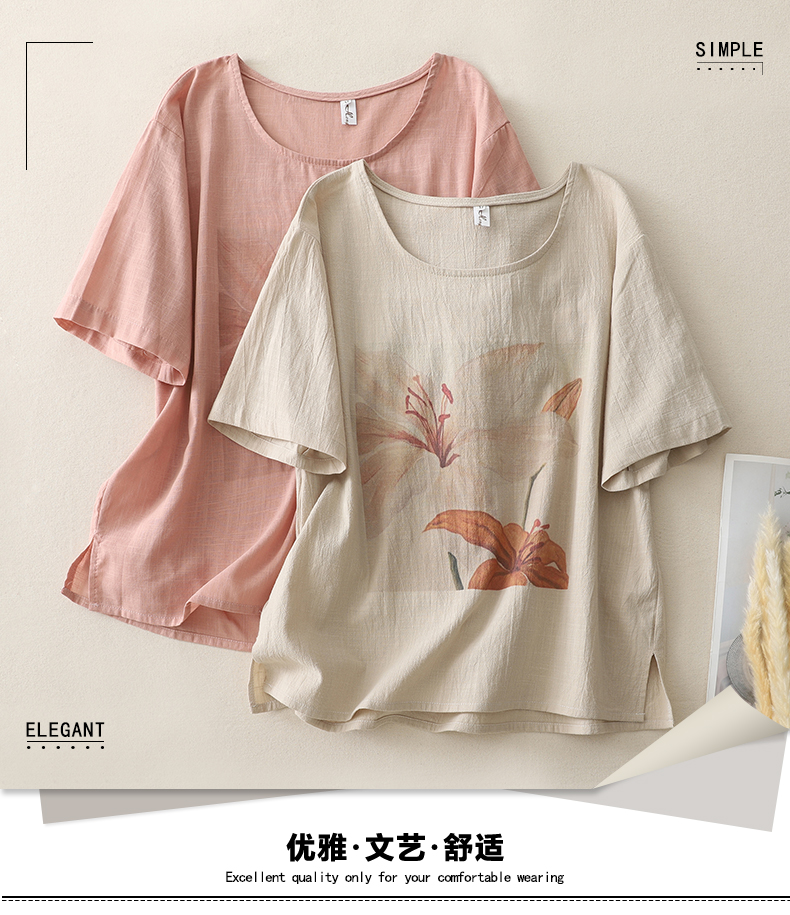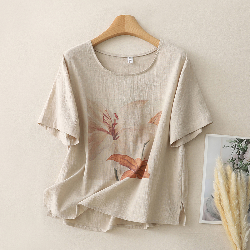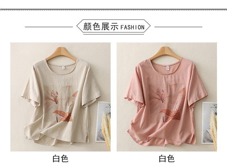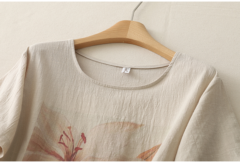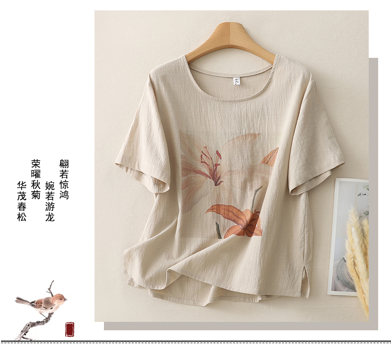 MY17599# 复古印花棉麻上衣女宽松圆领短袖套头衫休闲百搭T恤女裝貨源服裝批發