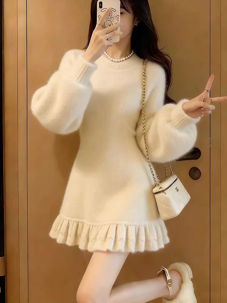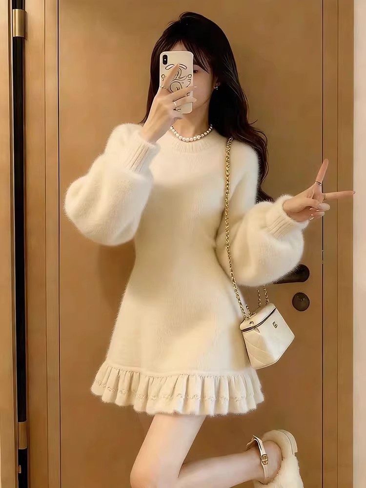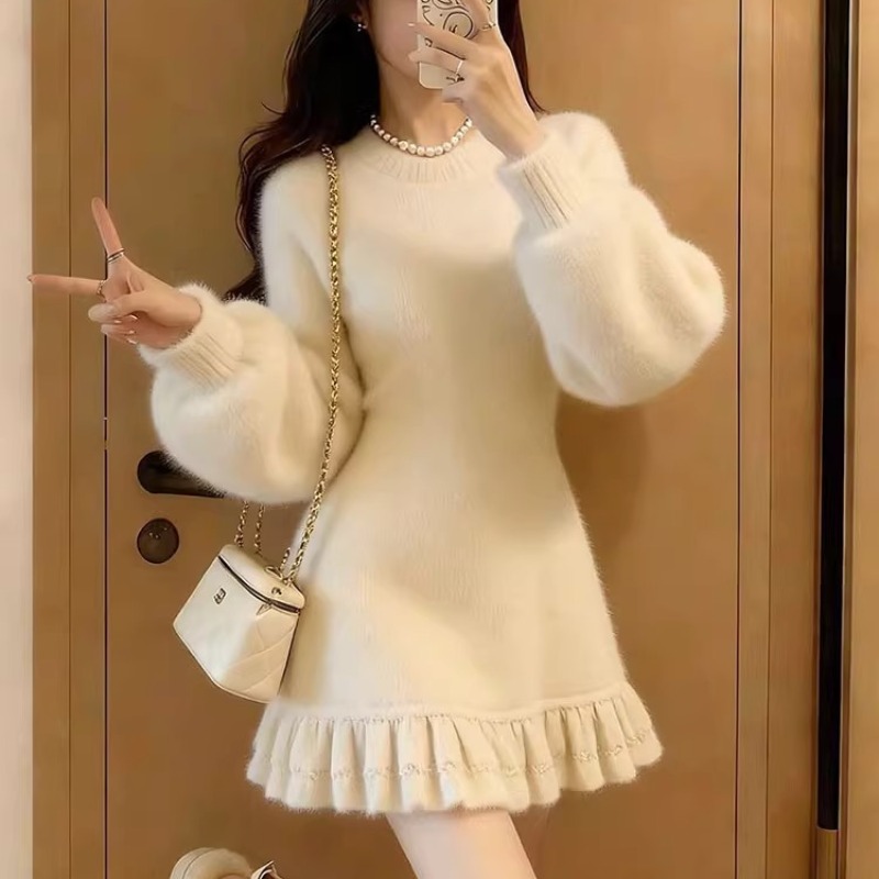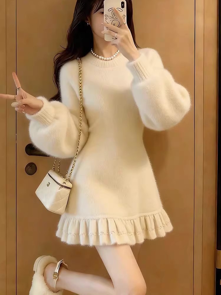 MY17603# 巨好看的连衣裙新款白色圆领长袖荷叶边显瘦针织连衣裙女女裝貨源服裝批發