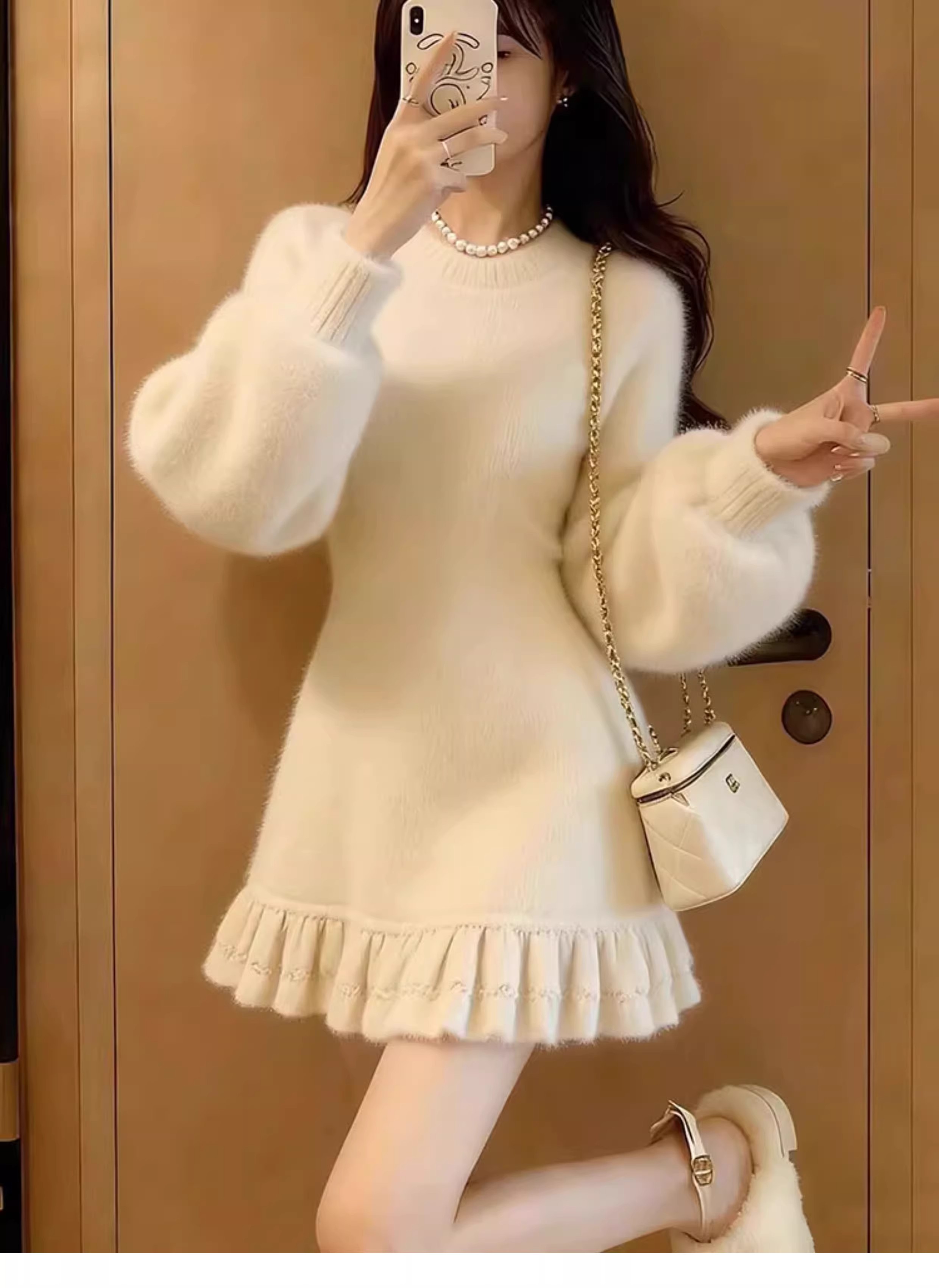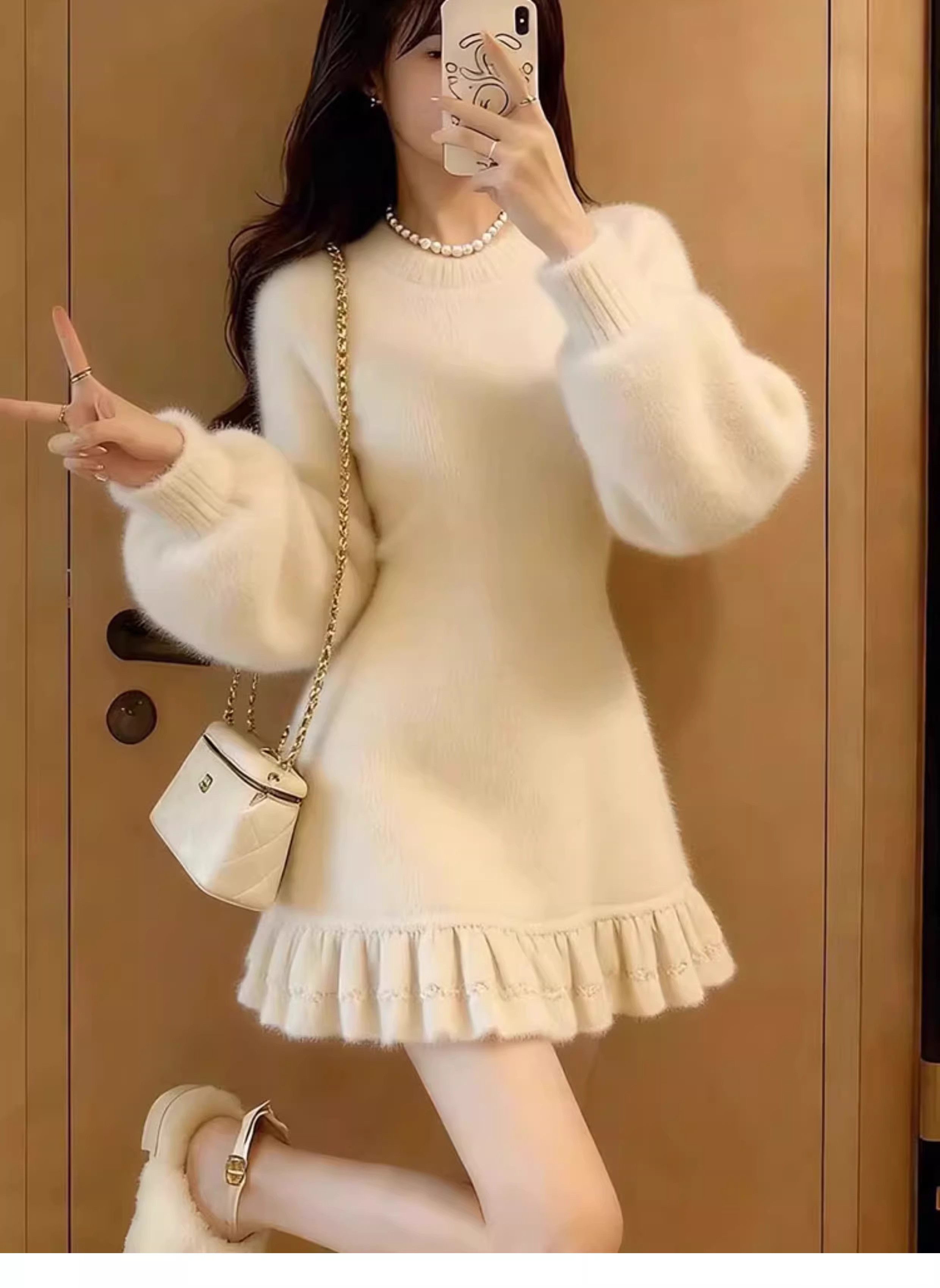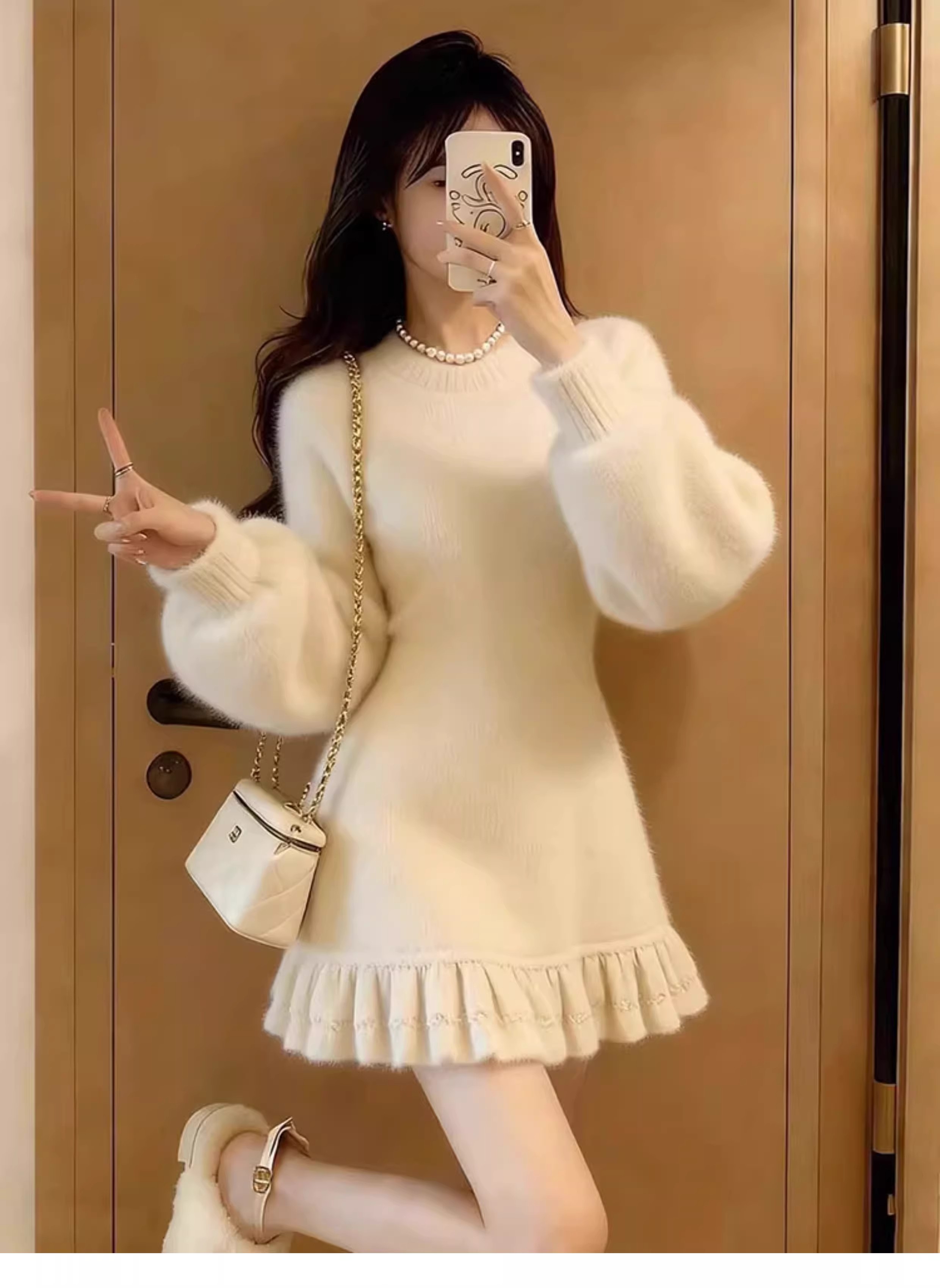 MY17603# 巨好看的连衣裙新款白色圆领长袖荷叶边显瘦针织连衣裙女女裝貨源服裝批發