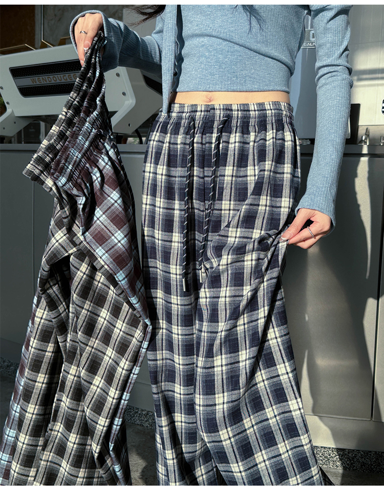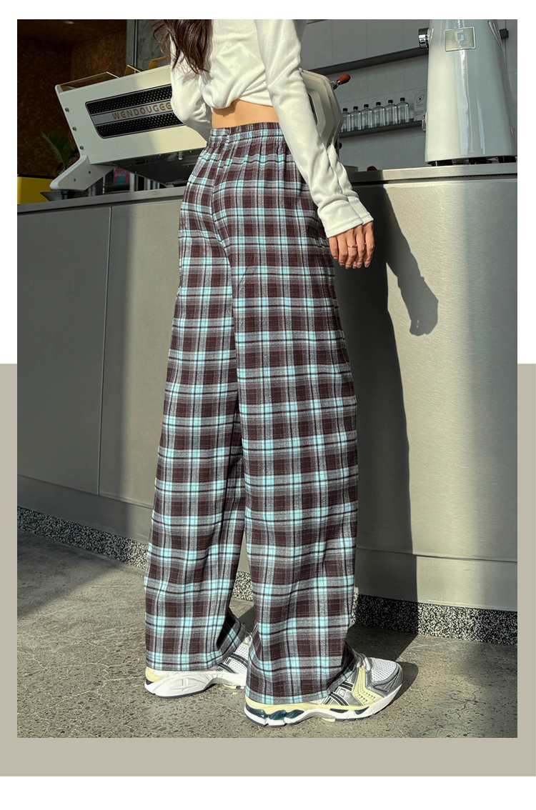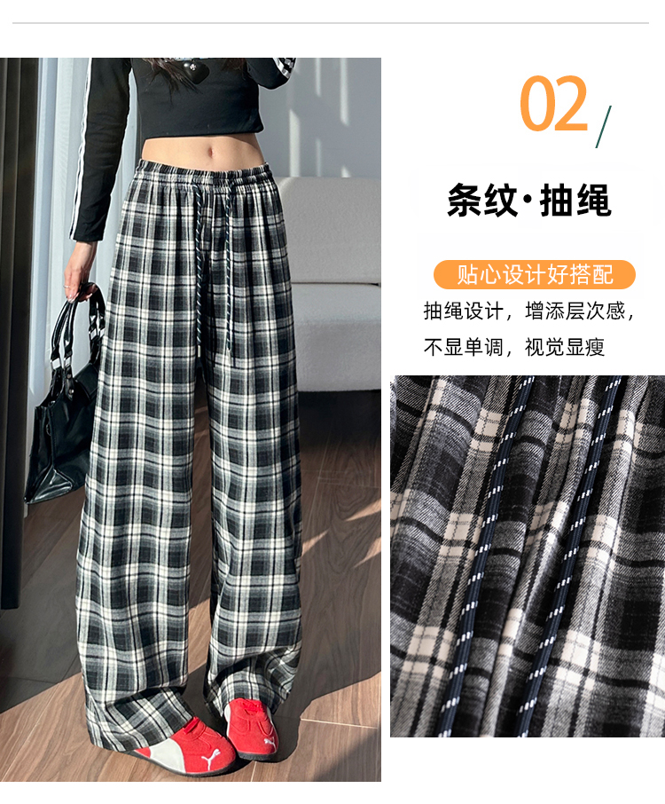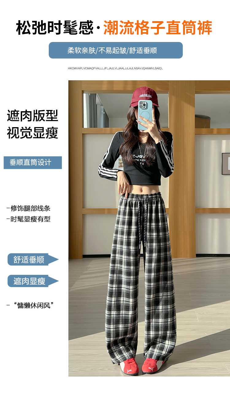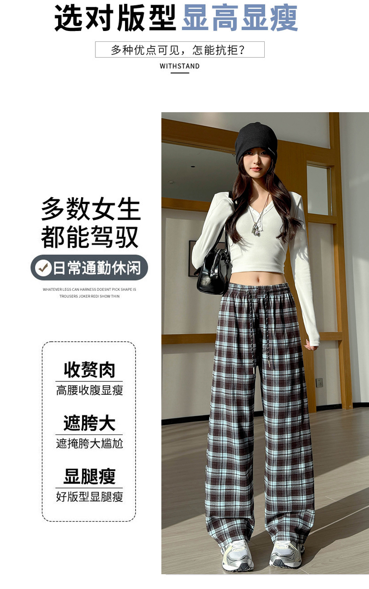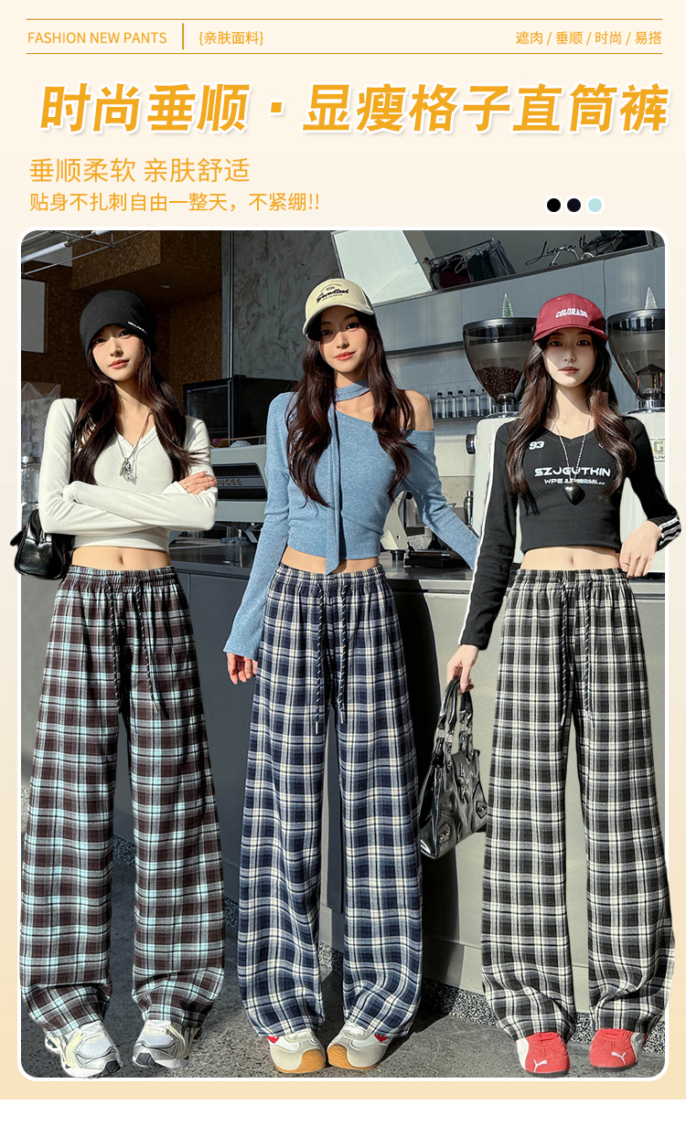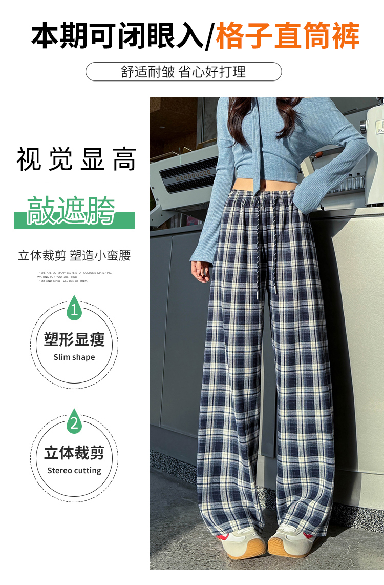 MY17605#小个子美式格子阔腿裤松紧腰松弛感显高宽松高级感休闲直筒裤女裝貨源服裝批發