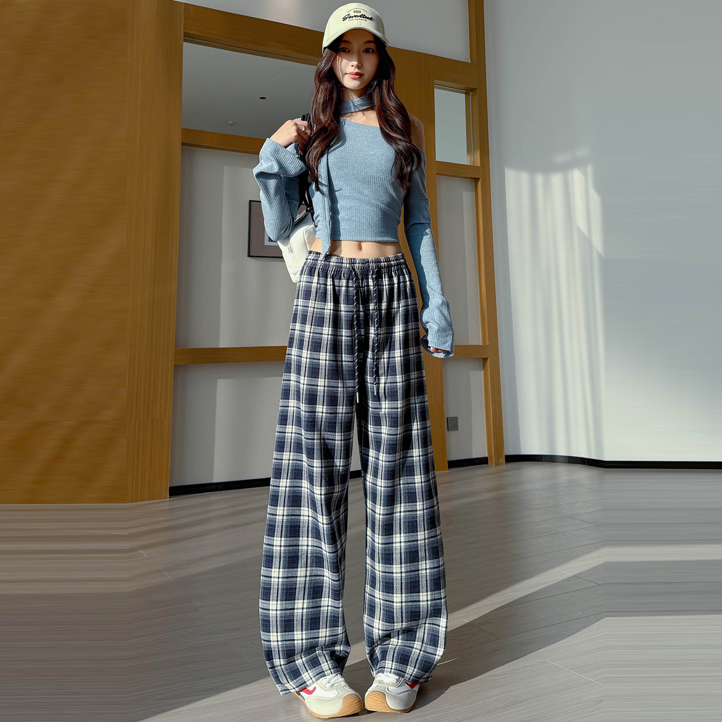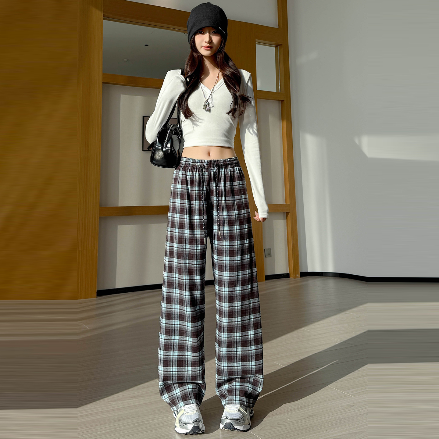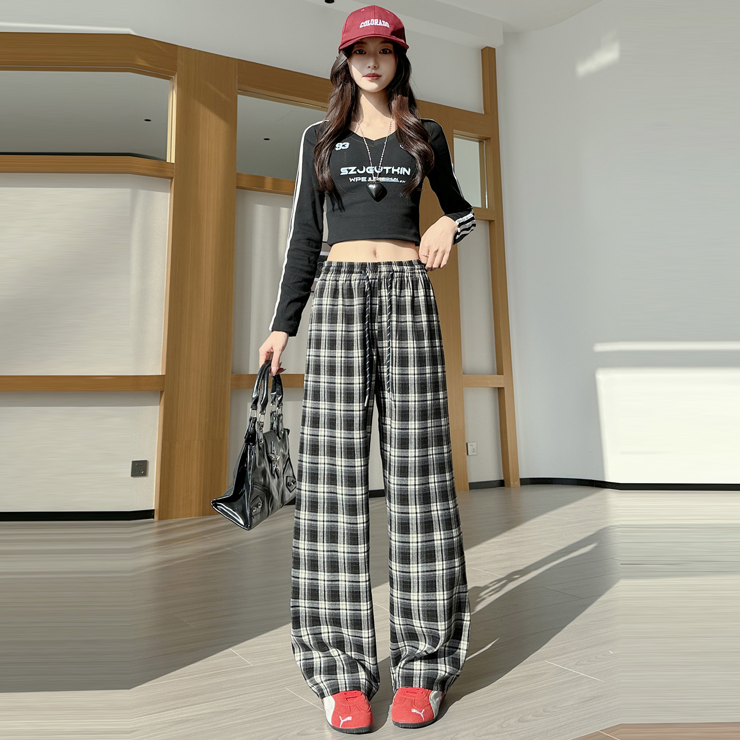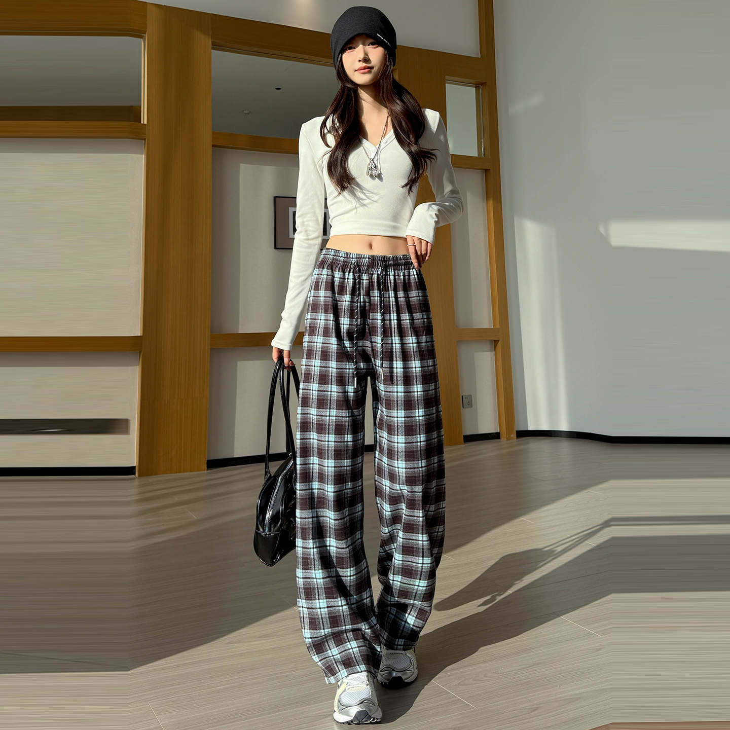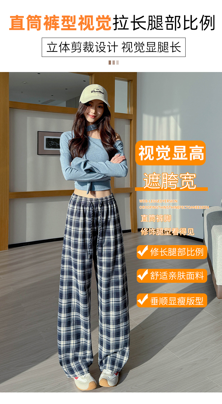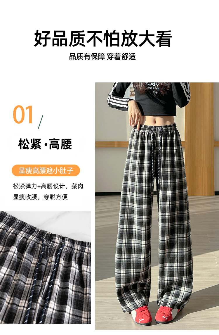 MY17605#小个子美式格子阔腿裤松紧腰松弛感显高宽松高级感休闲直筒裤女裝貨源服裝批發