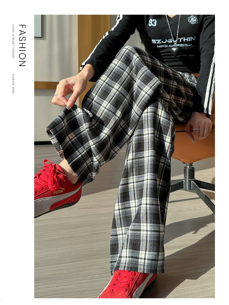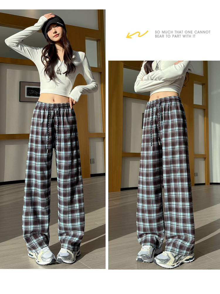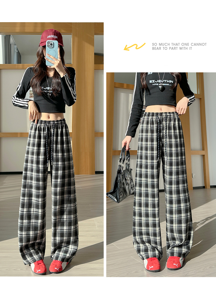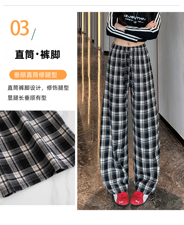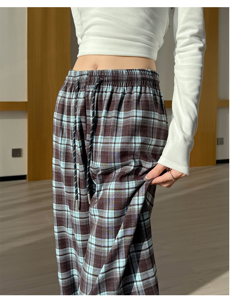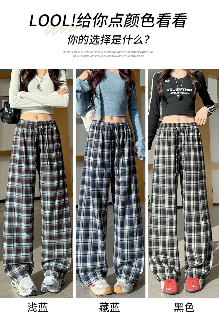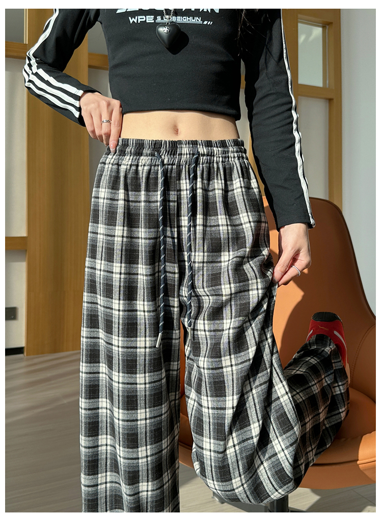 MY17605#小个子美式格子阔腿裤松紧腰松弛感显高宽松高级感休闲直筒裤女裝貨源服裝批發
