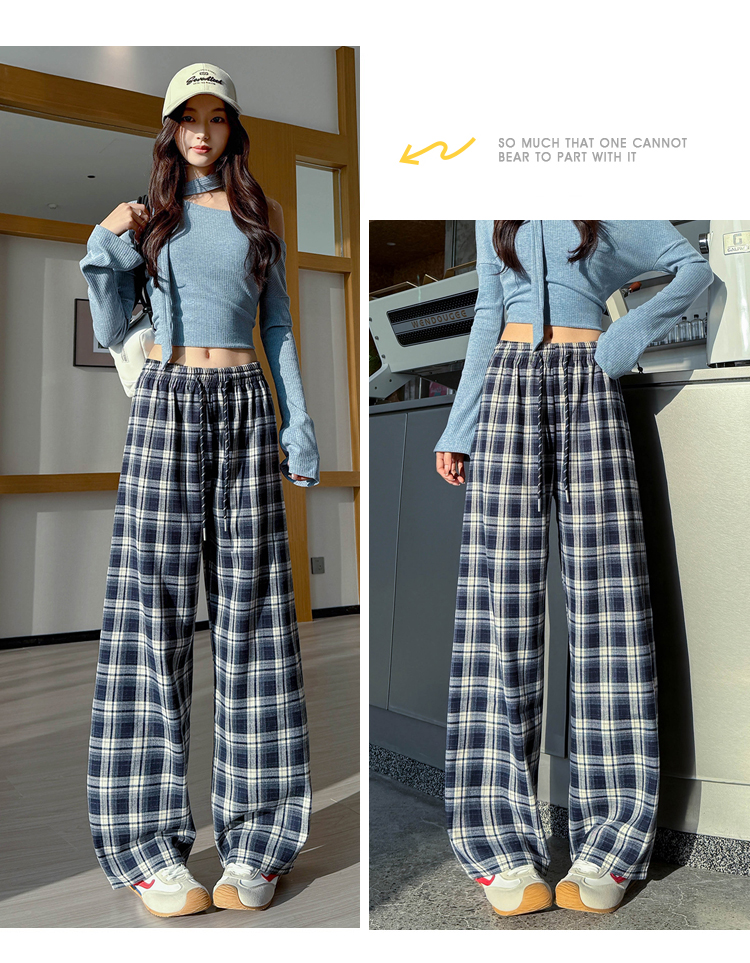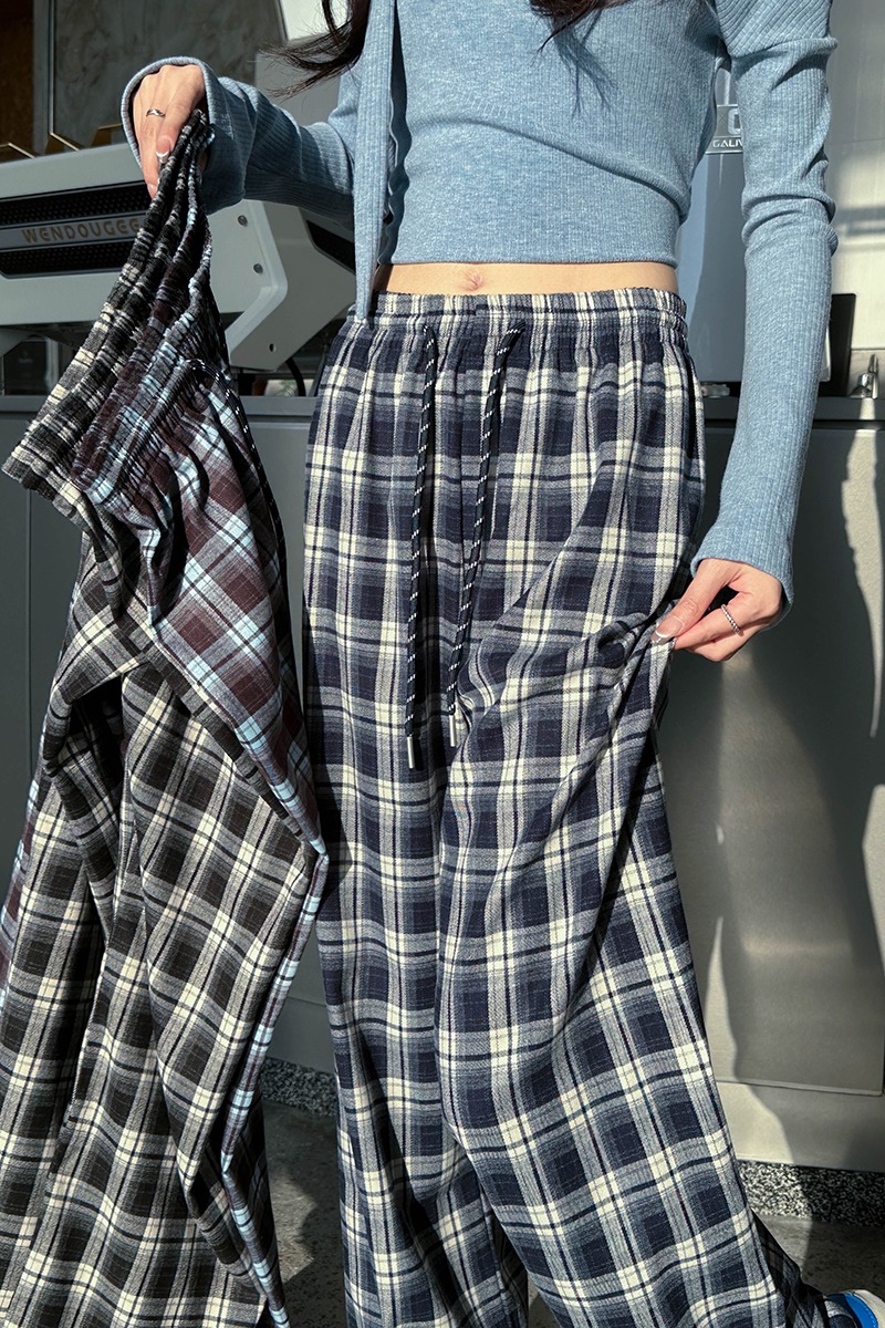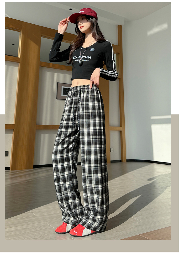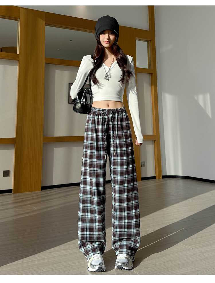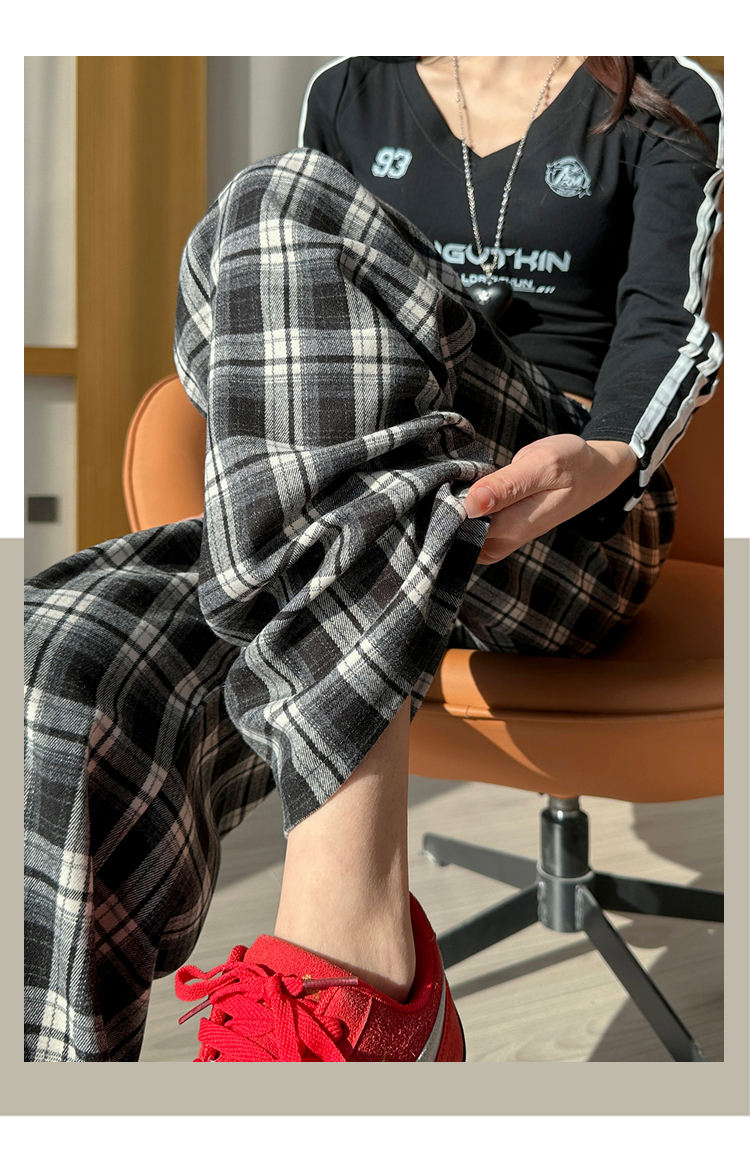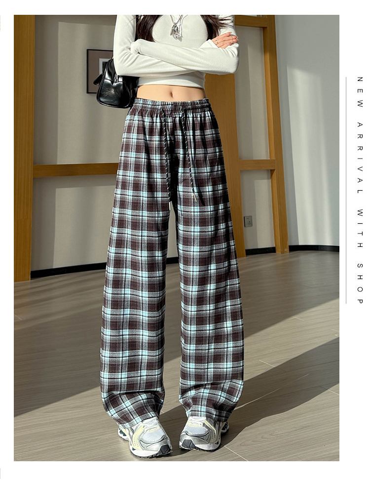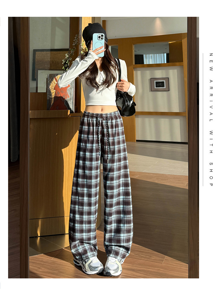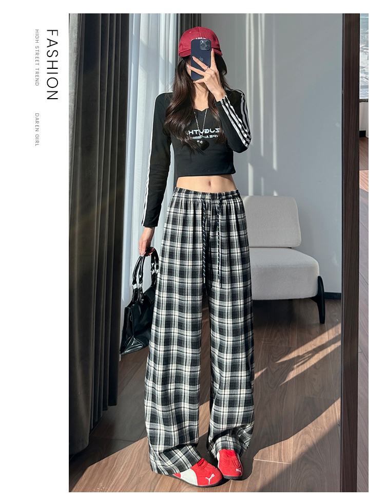MY17605#小个子美式格子阔腿裤松紧腰松弛感显高宽松高级感休闲直筒裤女裝貨源服裝批發