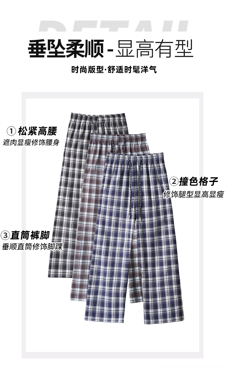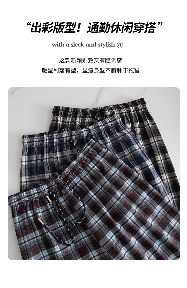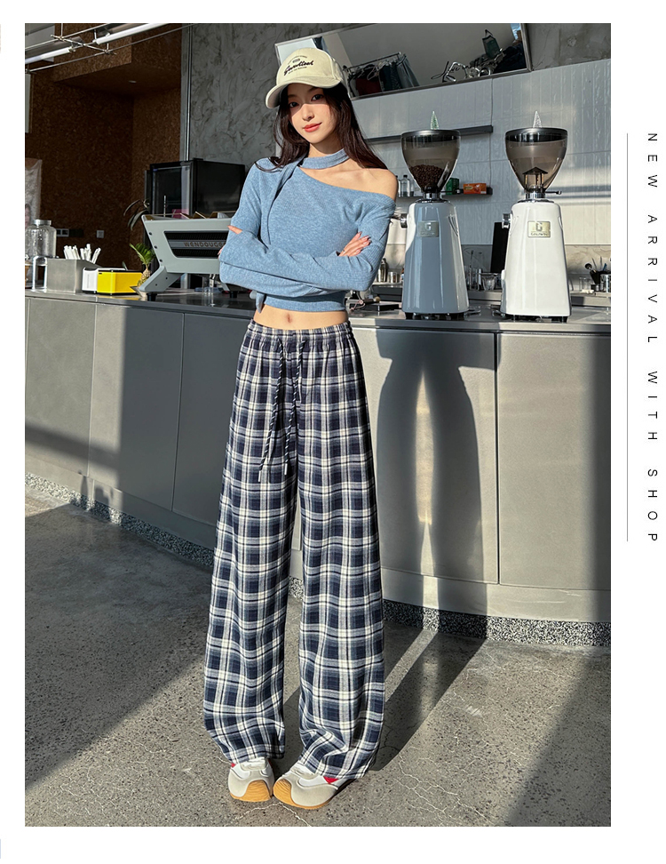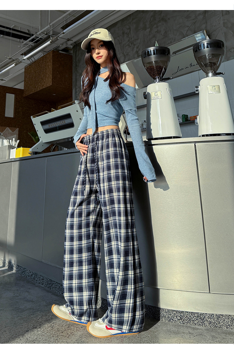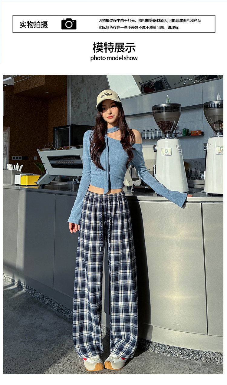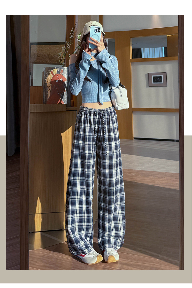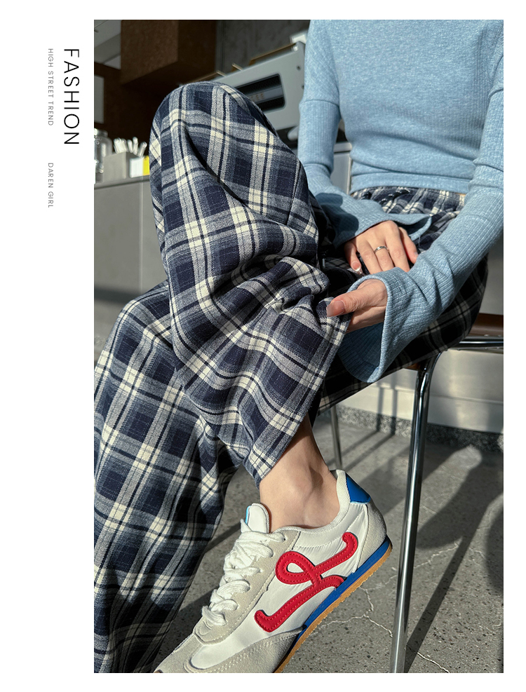 MY17605#小个子美式格子阔腿裤松紧腰松弛感显高宽松高级感休闲直筒裤女裝貨源服裝批發