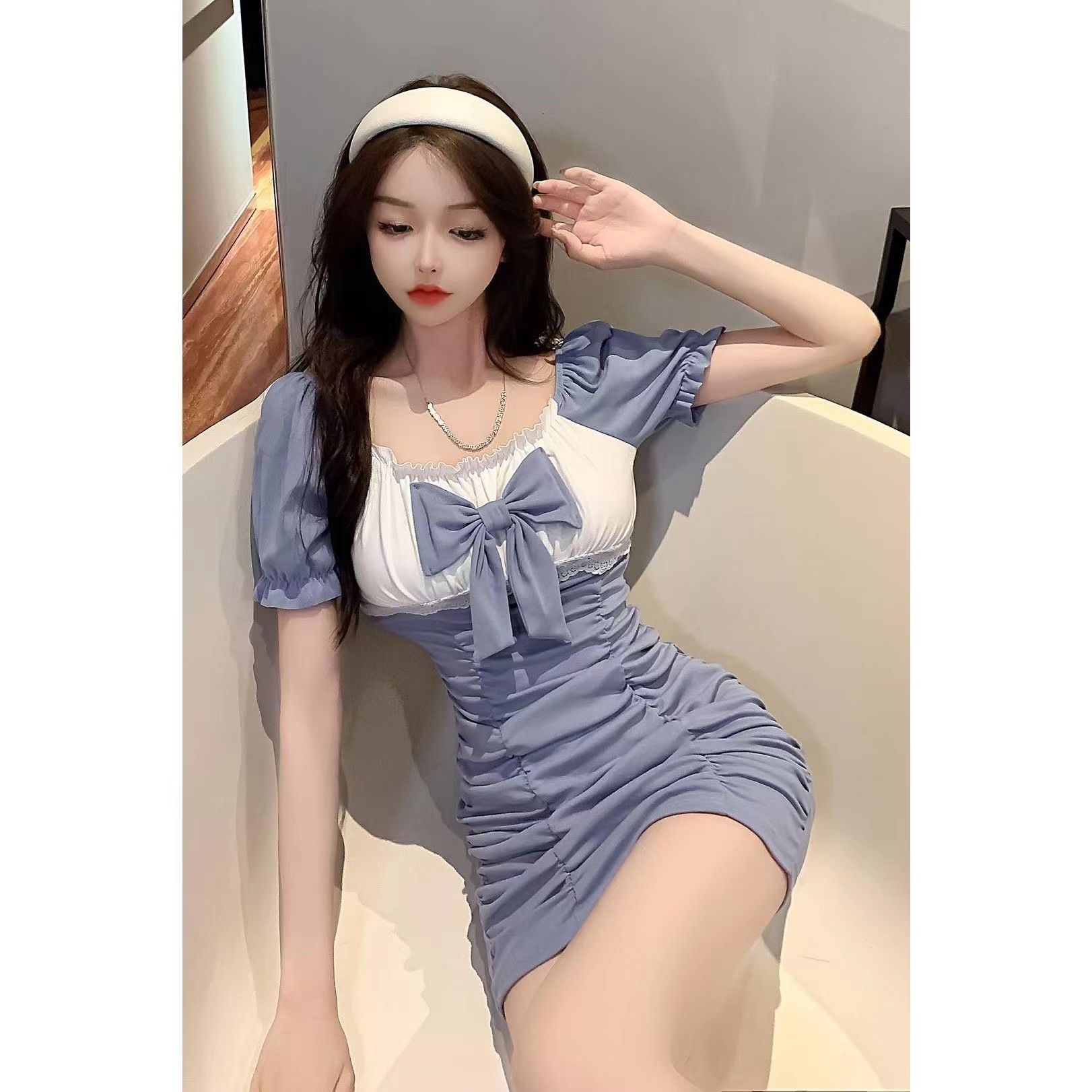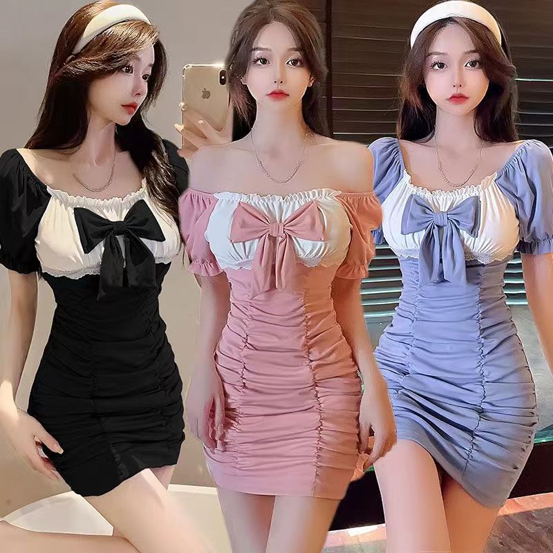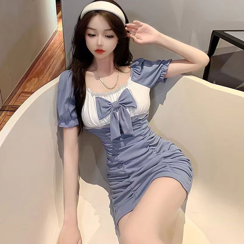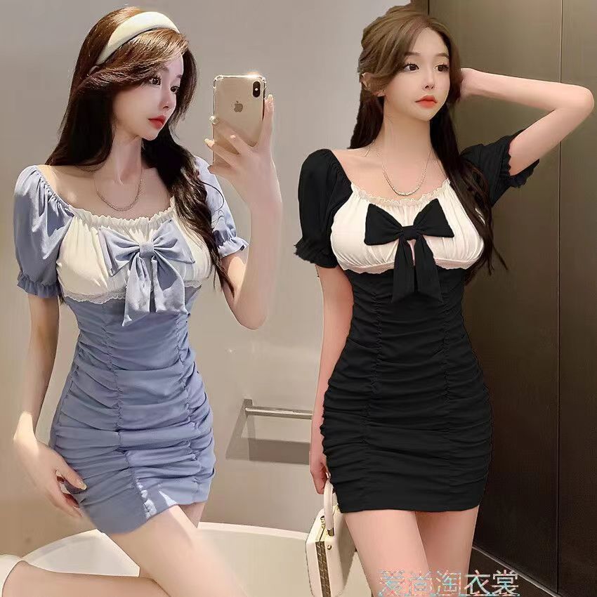 RY7# 性感低胸包臀连衣裙子2026夏季新款蝴蝶结气质炸街褶皱打底短裙女