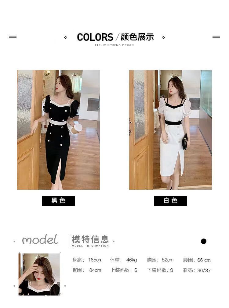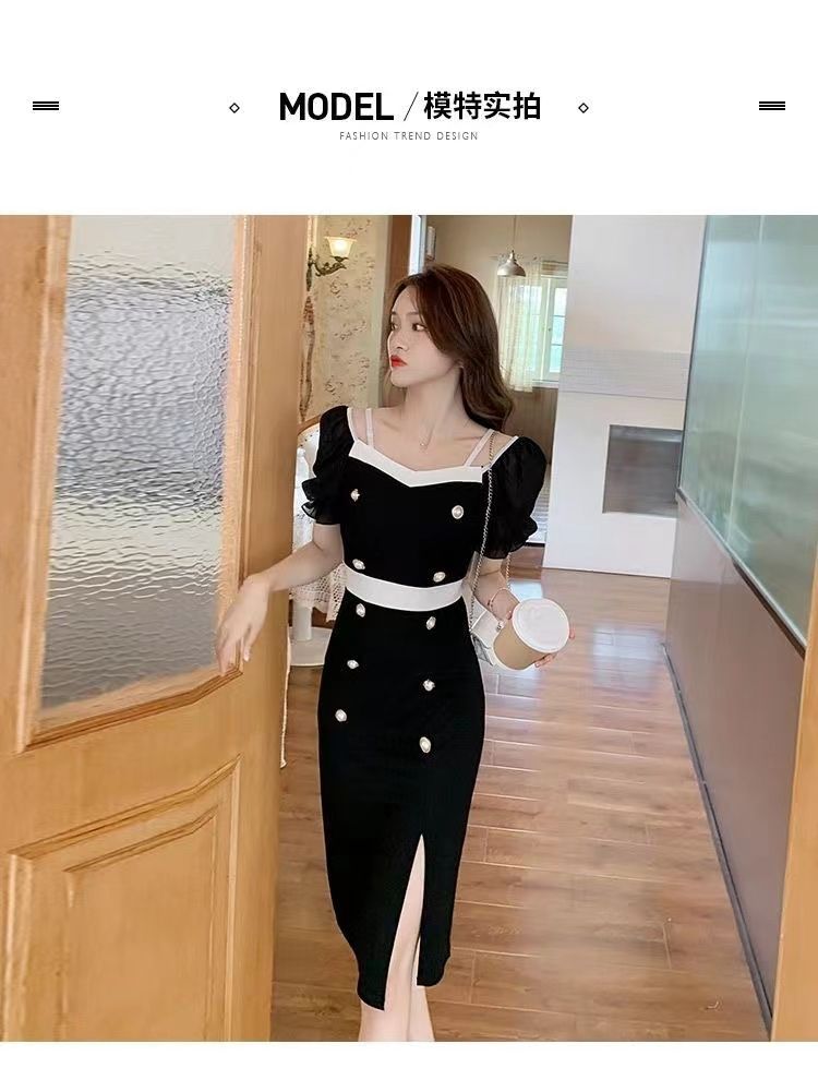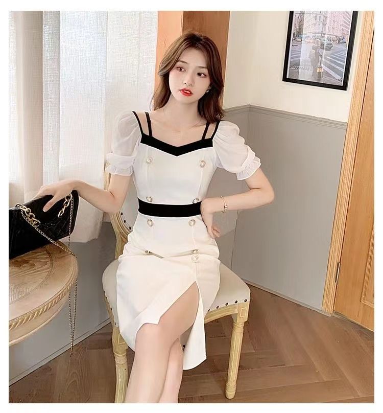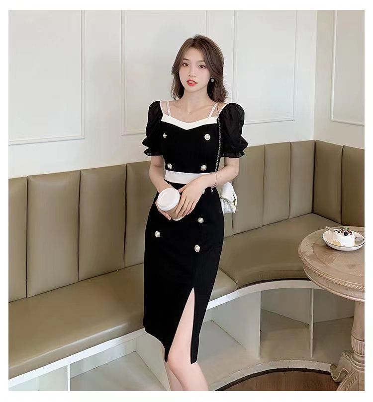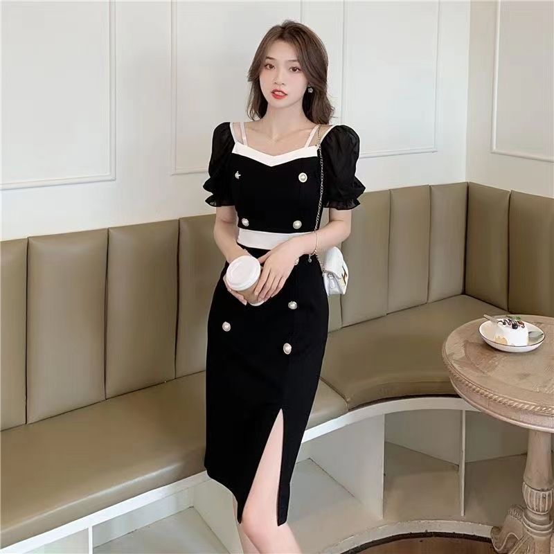 RY8# 性感露肩双排扣包臀裙女2026夏新款洋气撞色开叉女人味礼服连衣裙