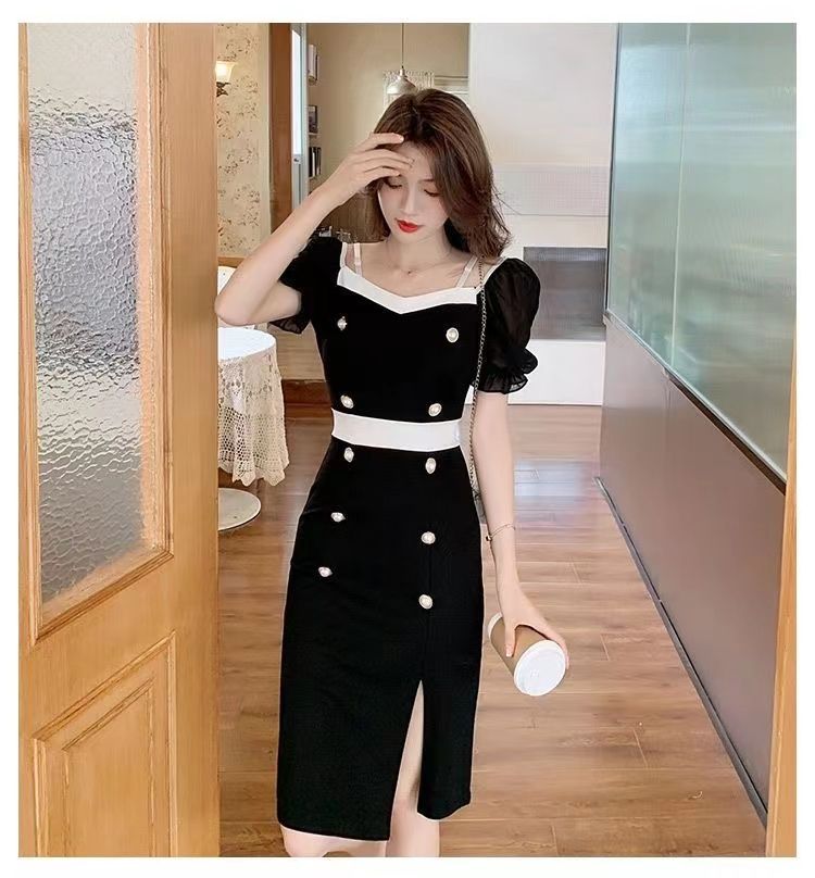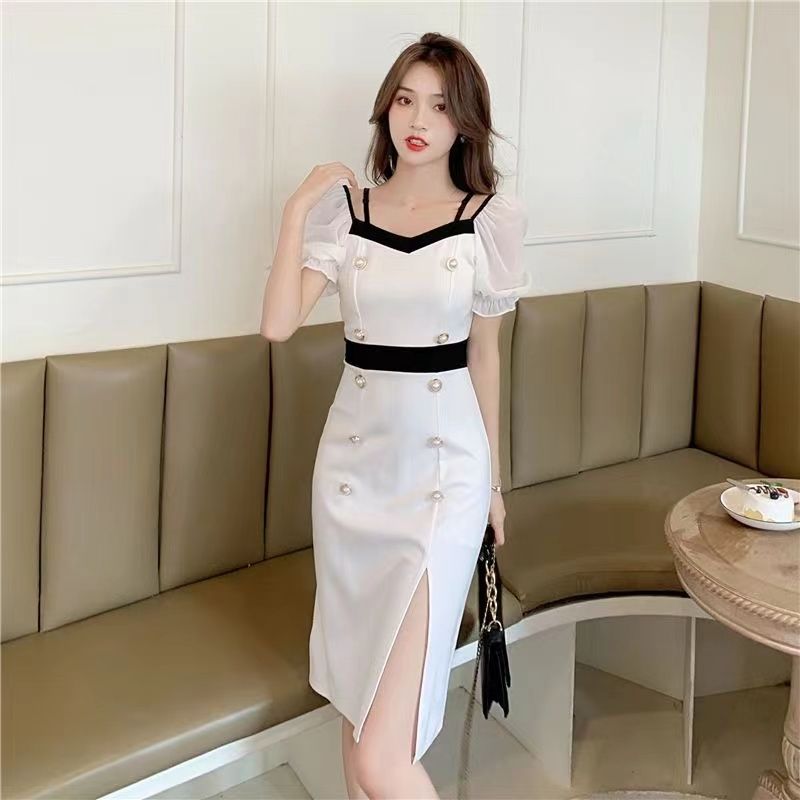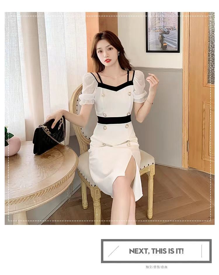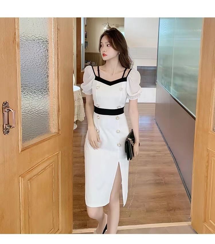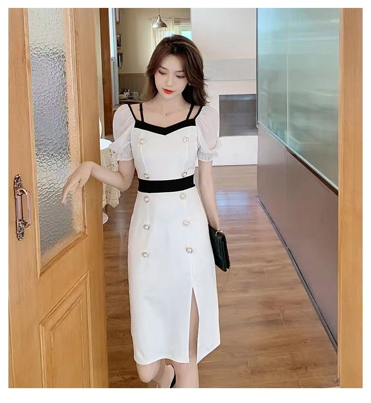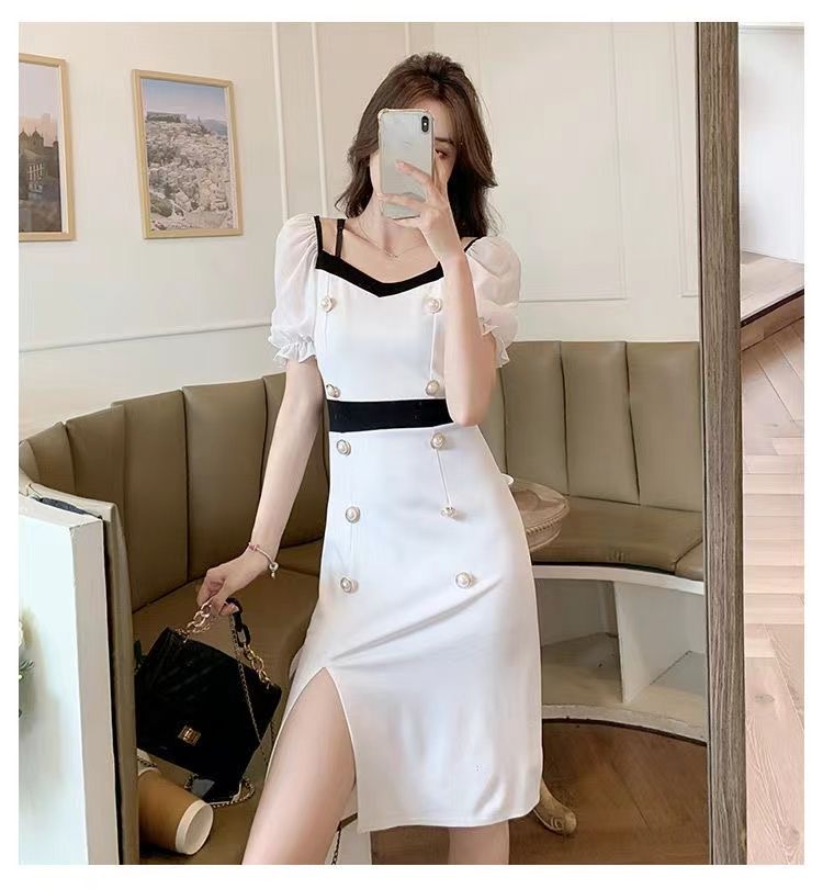 RY8# 性感露肩双排扣包臀裙女2026夏新款洋气撞色开叉女人味礼服连衣裙