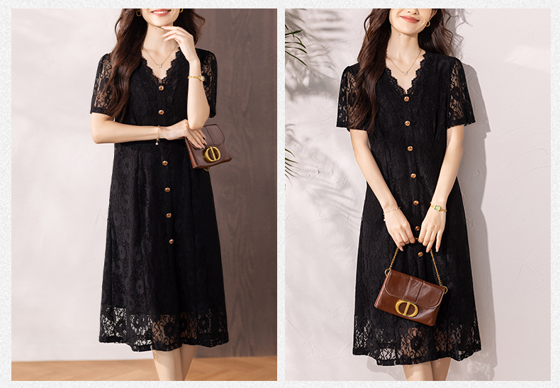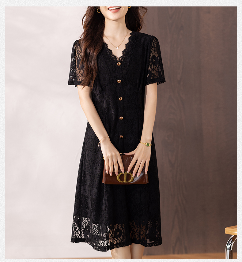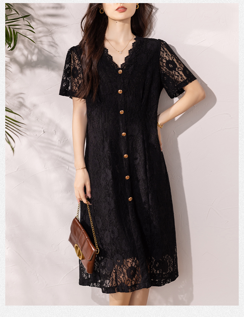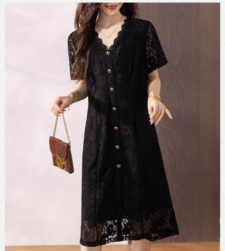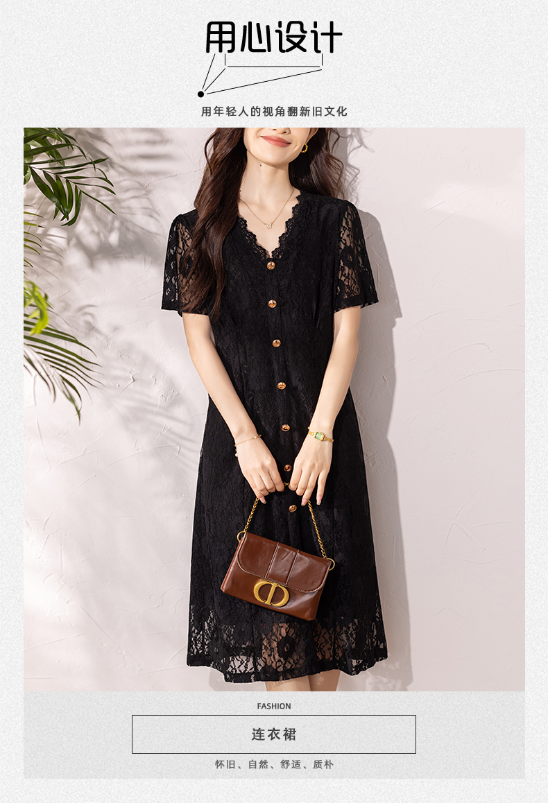 RY16# 女装夏季新款微胖高级感轻奢V领蕾丝连衣裙